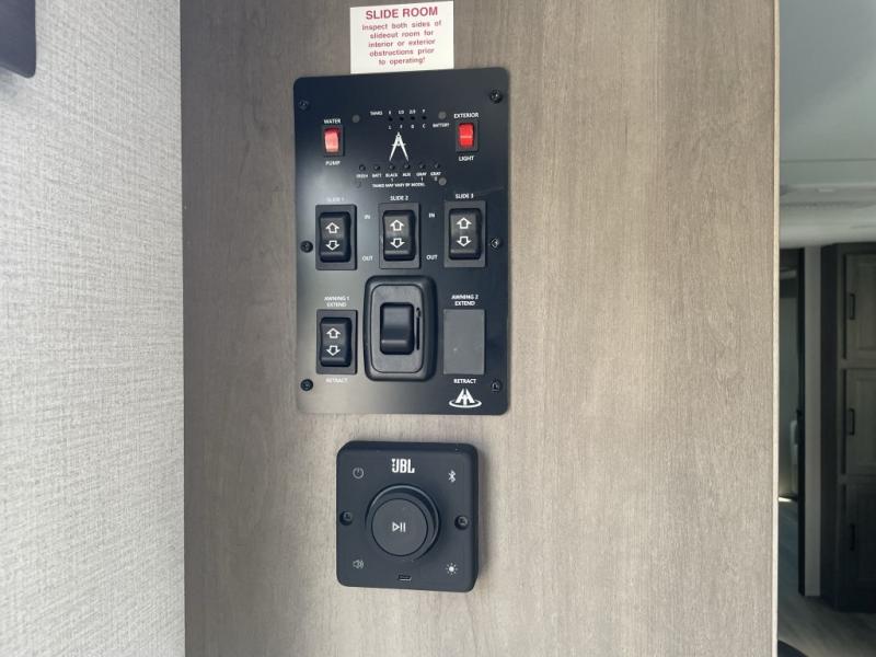 Stay connected and entertained with JBL speakers inside and out, backup camera prep, power awning with LED lighting, and a sleek automotive glass entry door for a modern look and feel.