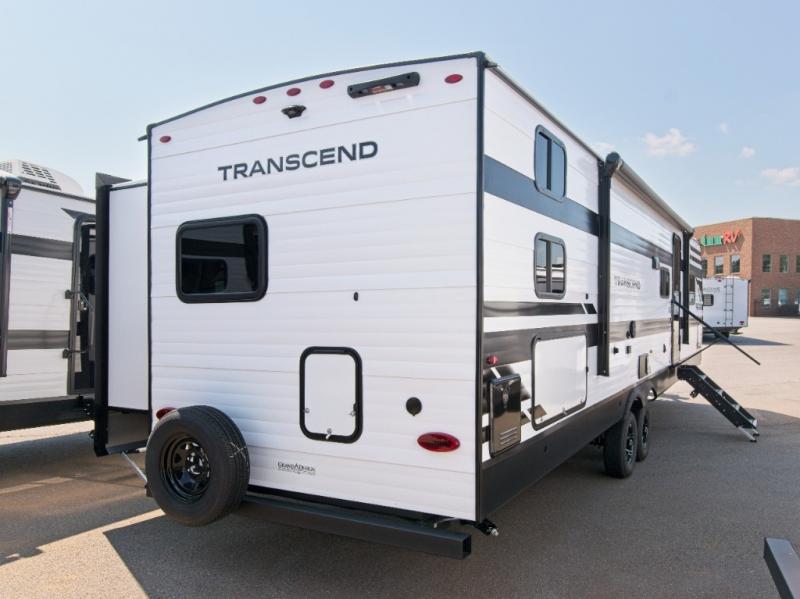 Enjoy spacious family adventures with the Grand Design Transcend 335BHT, featuring a private bunkhouse with triple bunks and an exterior griddle with refrigerator for outdoor cooking convenience.