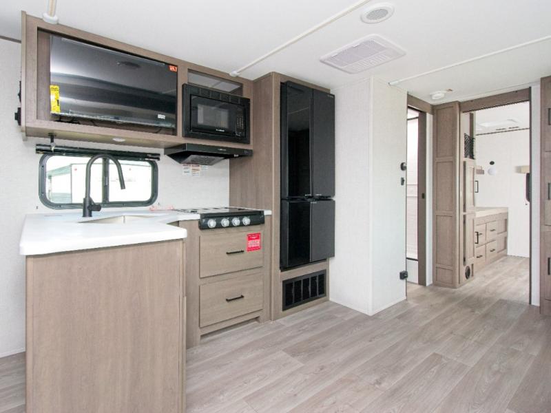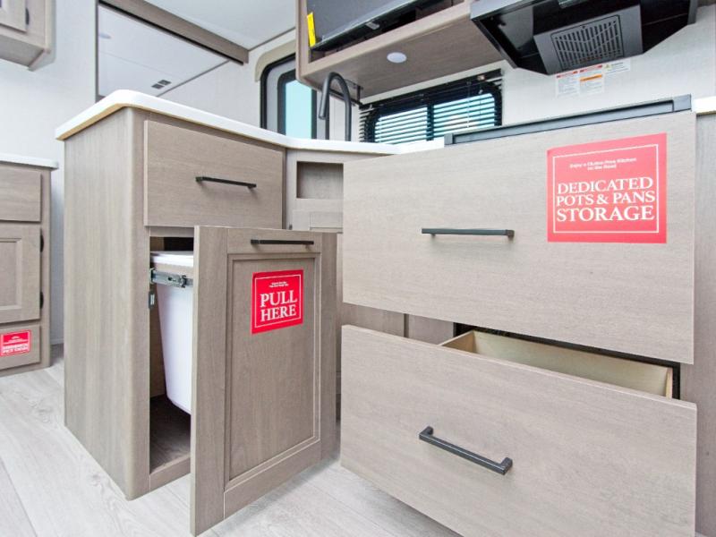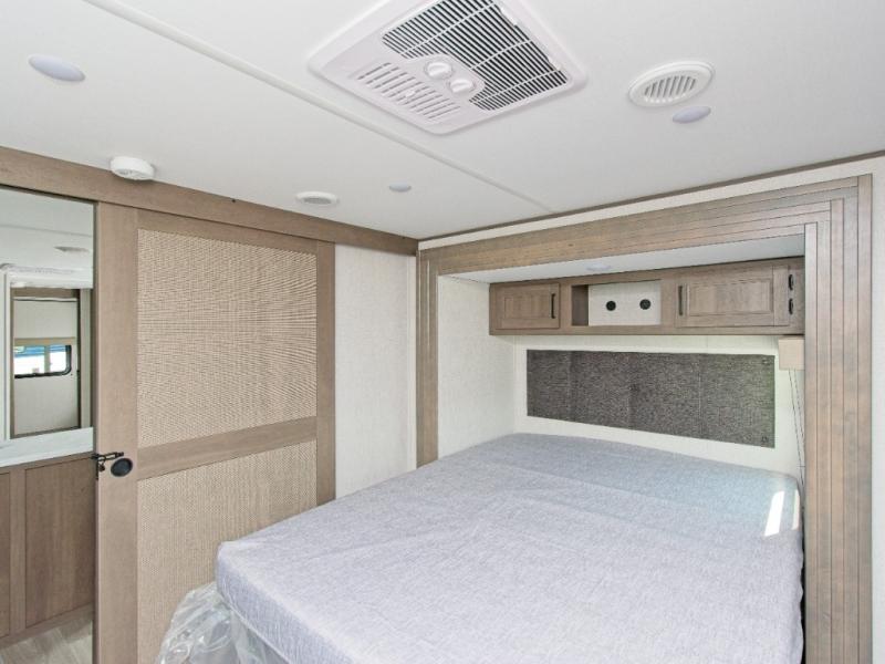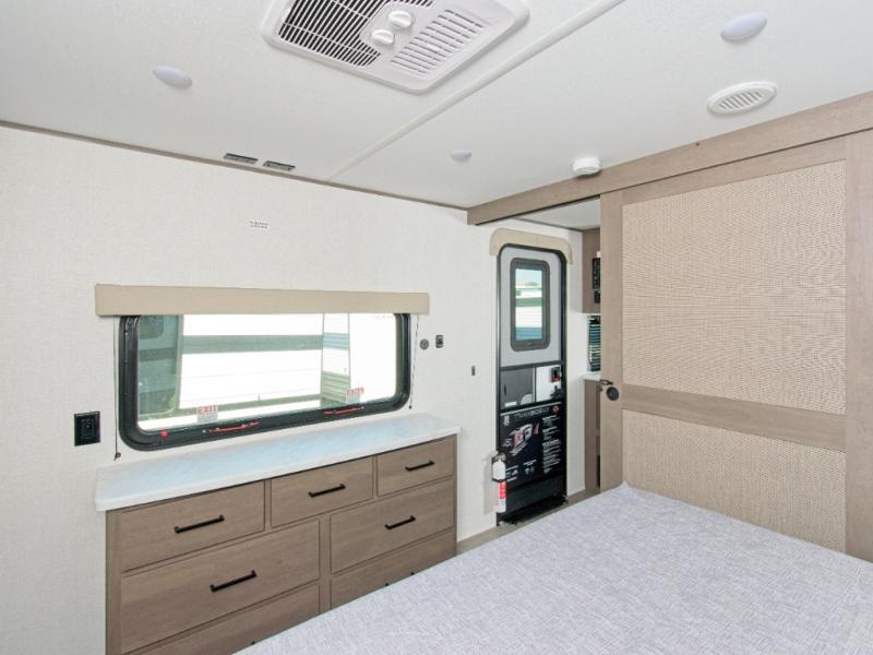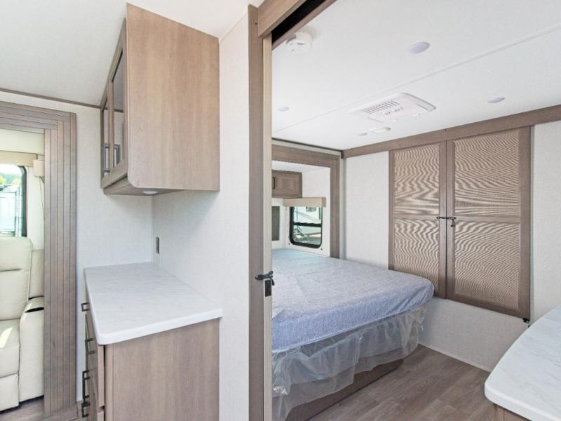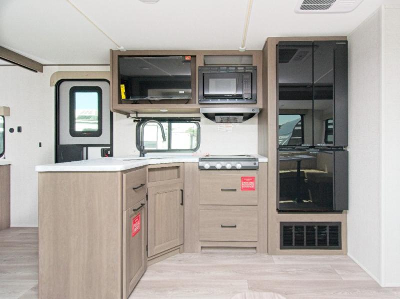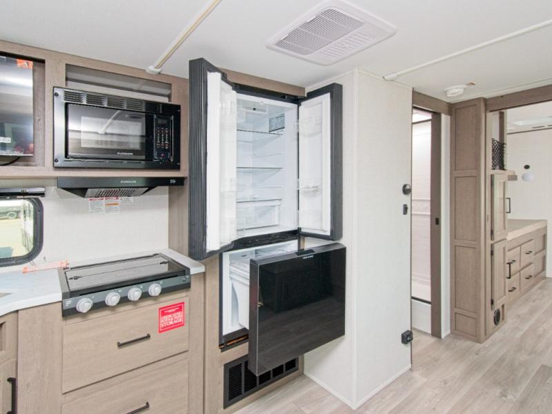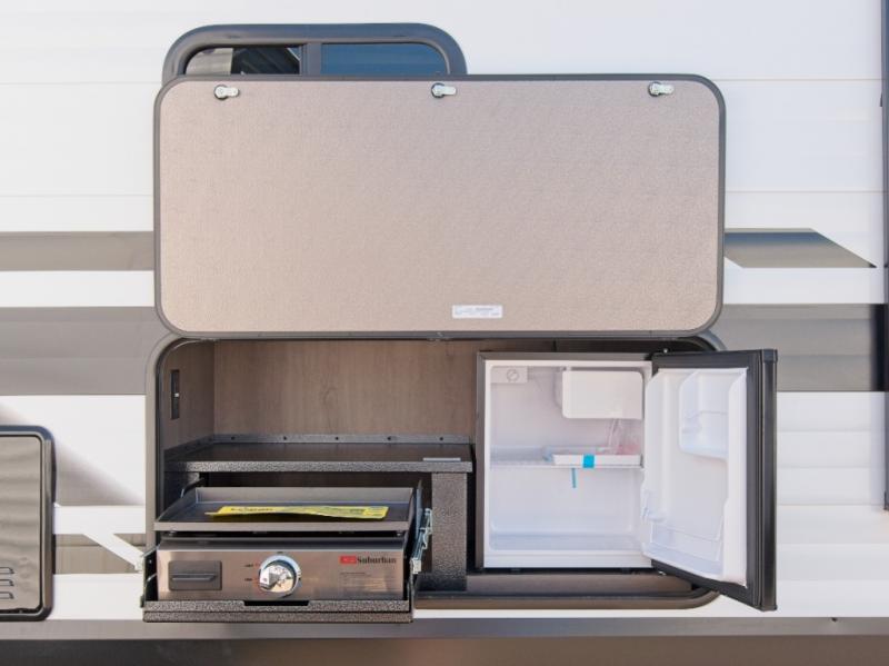 Up front, the private master bedroom features a queen bed slide, a spacious front closet, and washer/dryer prep for extended stays. The central kitchen includes a three-burner range, convection microwave/air fryer, and a 12V French door refrigerator with bottom freezer, while the exterior griddle and fridge make outdoor cooking a breeze.