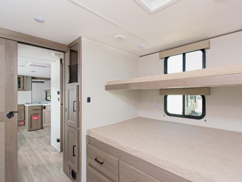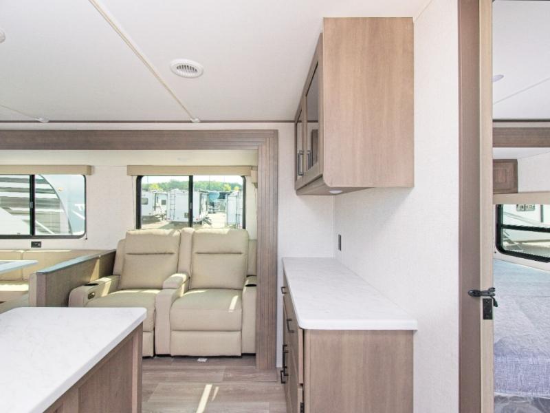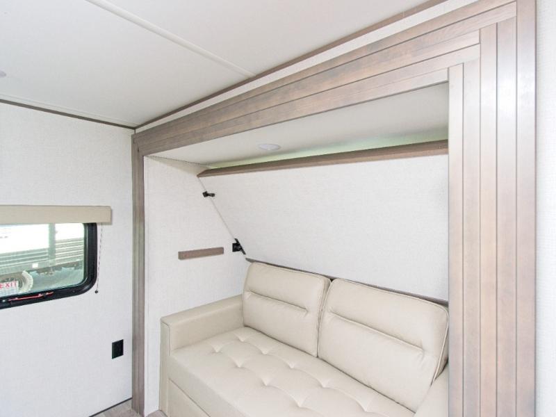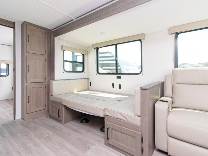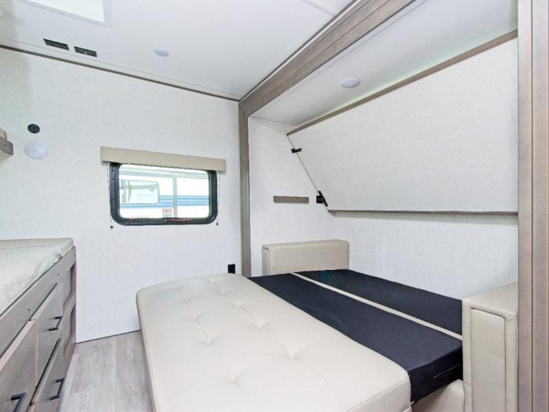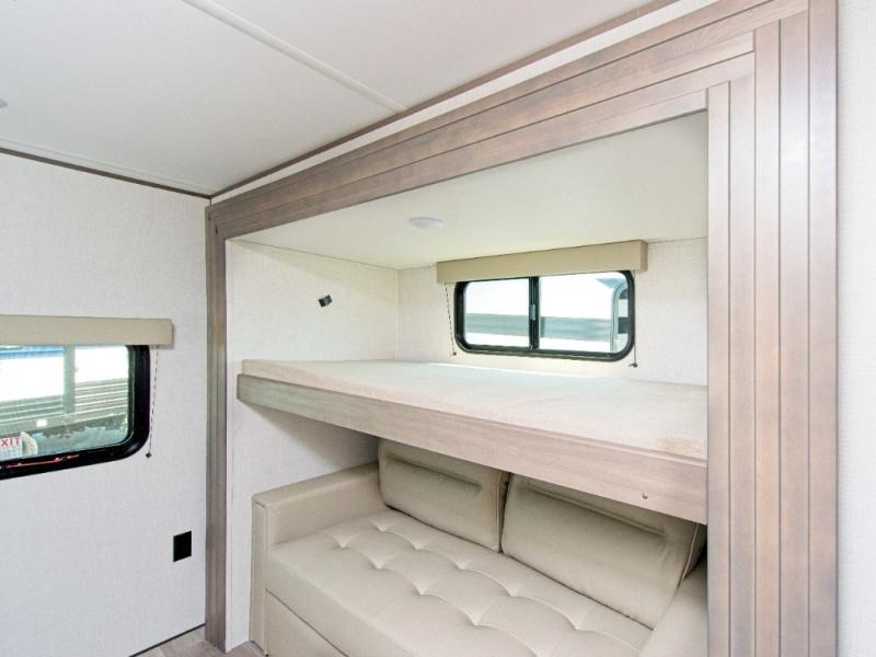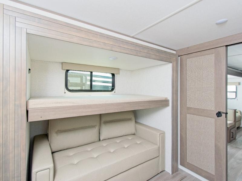 The Transcend 335BHT by Grand Design is the ultimate travel trailer for families or groups who need space, comfort, and flexibility. With triple slide-outs, this unit offers a wide-open interior perfect for relaxing, entertaining, or working remotely. The rear private bunkhouse sleeps up to five with three bunks, a sleeper sofa, and built-in storage drawers—ideal for kids or guests.