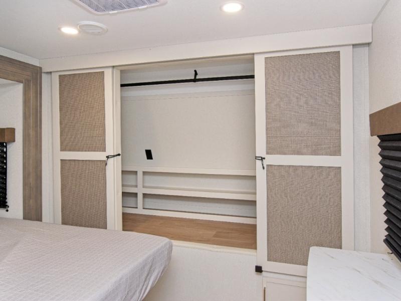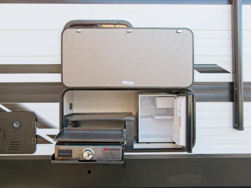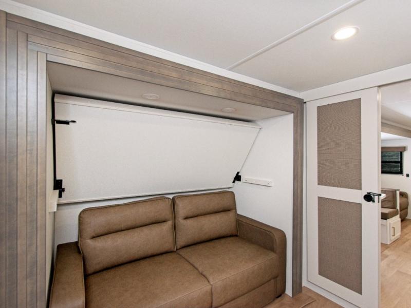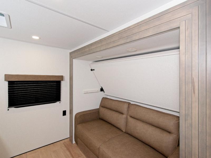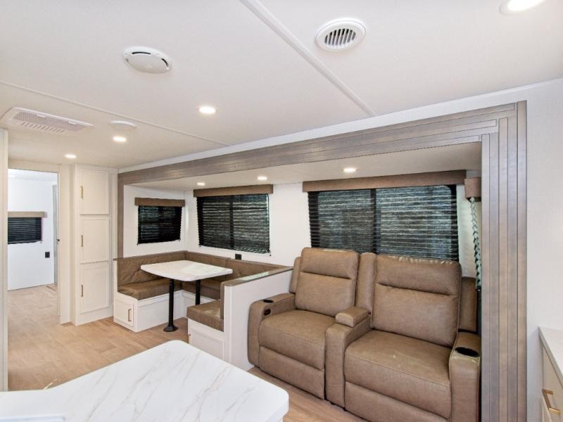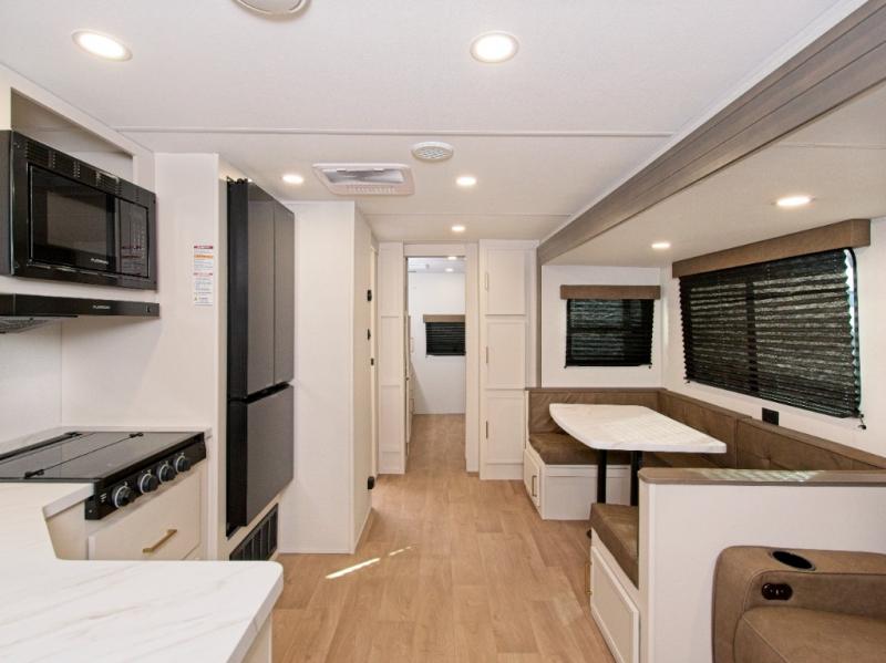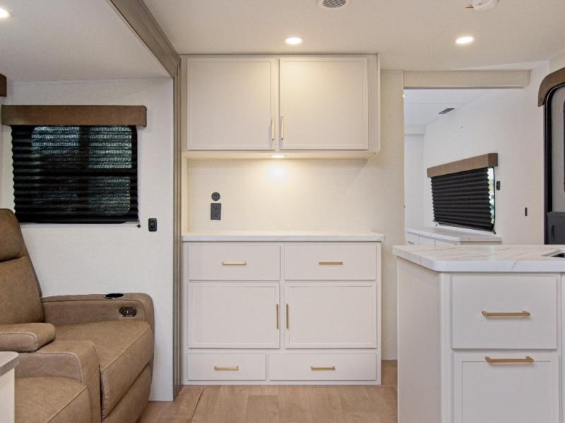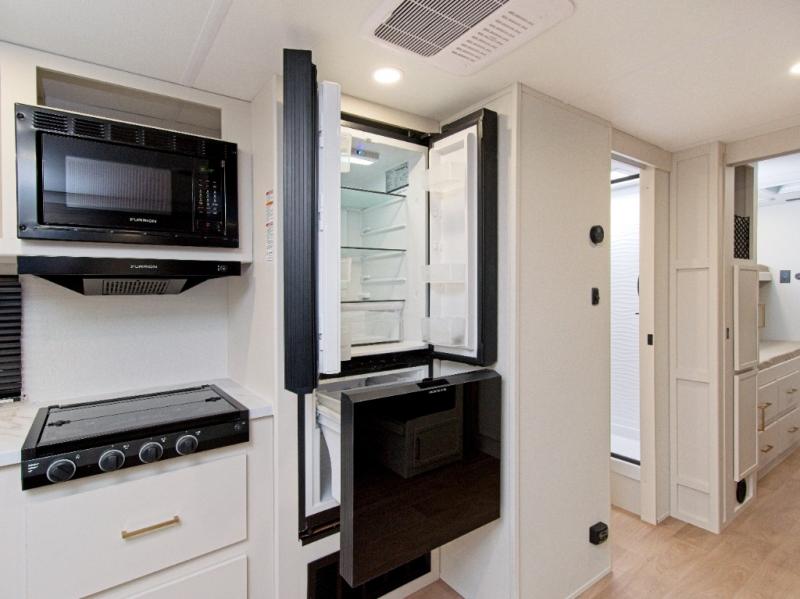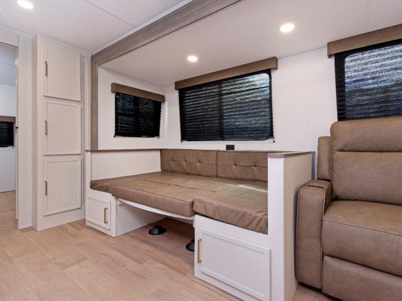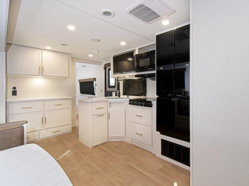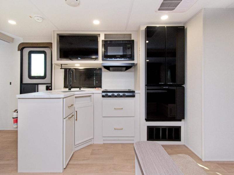 Inside, the Transcend Xplor 335BHT offers a spacious floorplan with a private master bedroom, large living area, and a dedicated bunkhouse that’s perfect for kids, guests, or extended family. The open concept design gives you plenty of room to relax, while the modern kitchen features stainless-steel appliances, generous counter space, and a pantry so you can prepare meals with ease. The entertainment center and cozy seating make rainy days or evenings inside just as enjoyable as time outdoors.