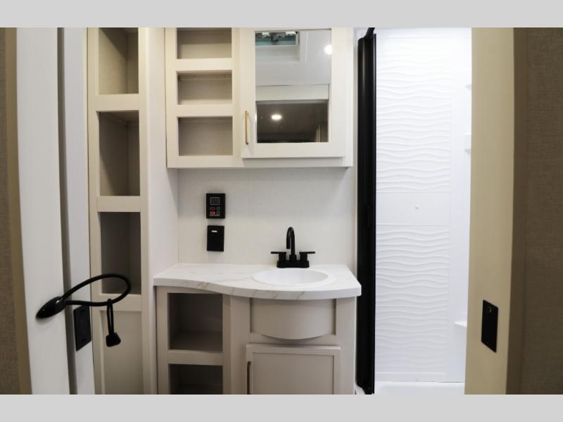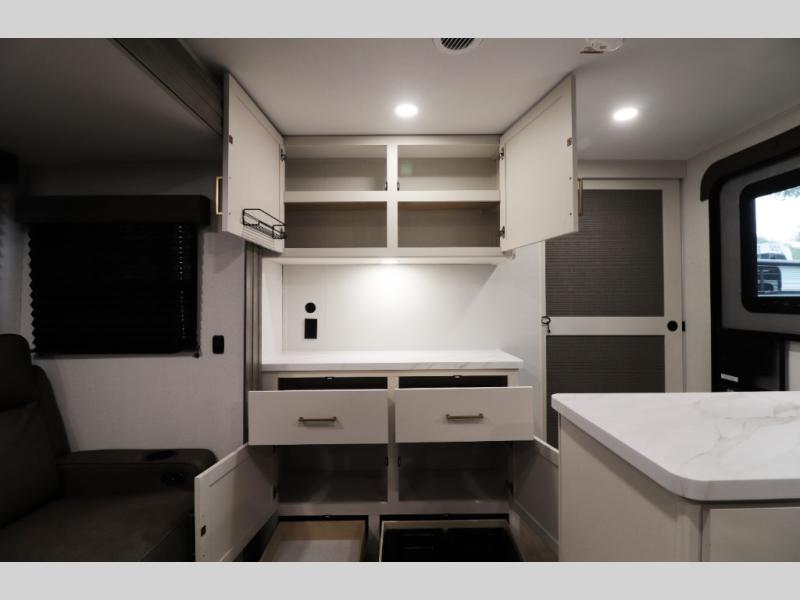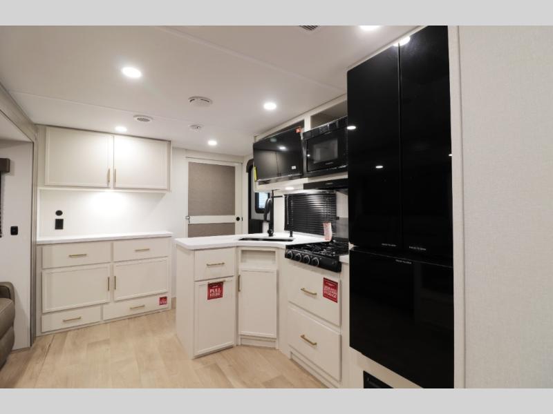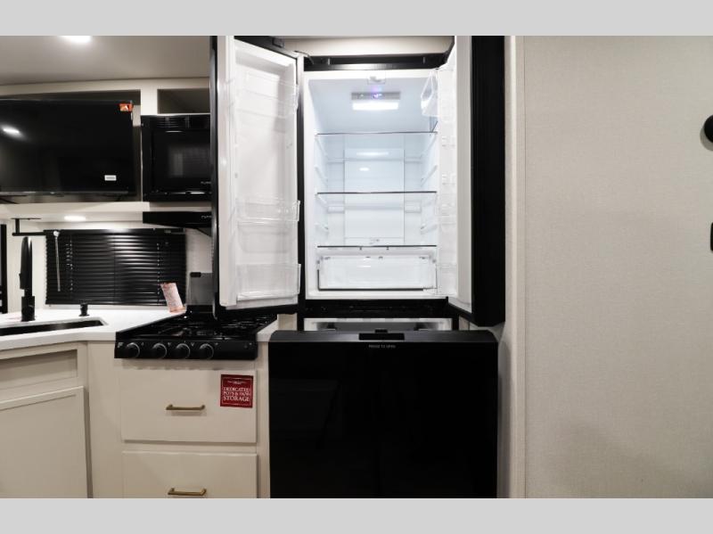 Kitchen conveniences like the air fryer/convection/microwave and large 12V French-door refrigerator for longer trips.