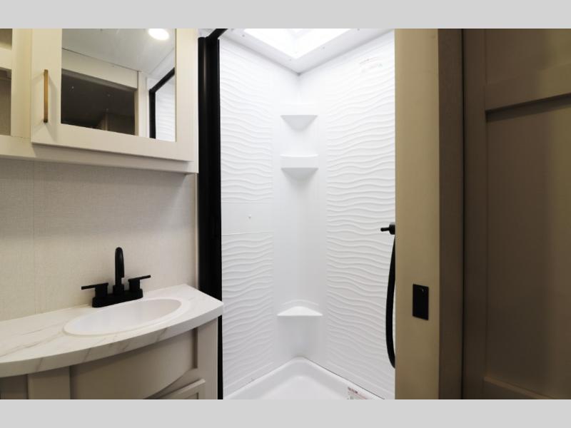 Rear bath convenience with a walk-in shower and porcelain toilet for a more “at-home” feel.