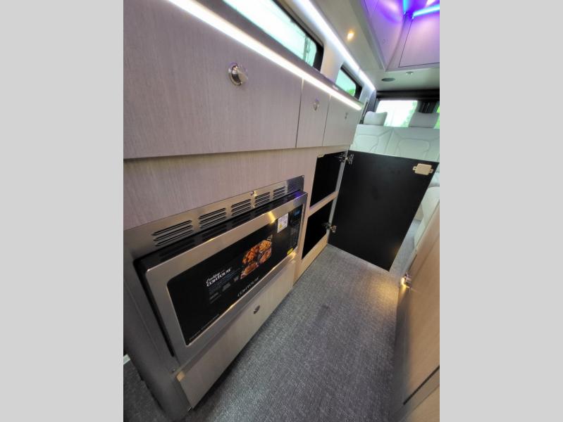 Whether you travel to see mountains, beaches or friends, this all-wheel drive coach will provide all the luxury and functionality you will want while on the road! There are two captain's chairs plus two additional chairs right behind with a table to dine at once at your destination. You will find five more seatbelts in the rear seating when you plan a trip for everyone to tailgate at the big game, listen to music at a festival, or watch a club sport in another city. When you need to sleep two, the power sofa bed offers just that, and the private enclosed wet bath also includes a window and privacy shade. The cook can make meals using the galley kitchen with a farmhouse-style sink, combo microwave/convection/air fryer and a two-burner induction cooktop.
