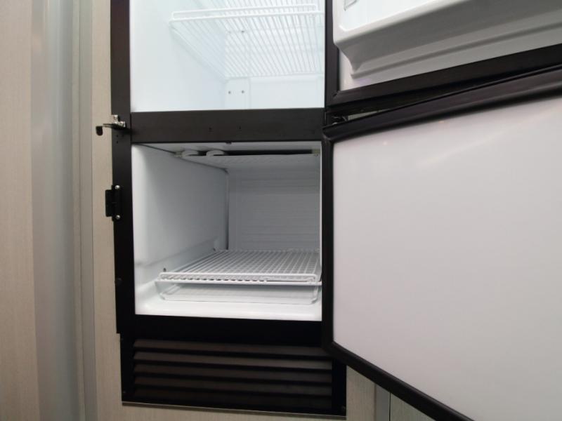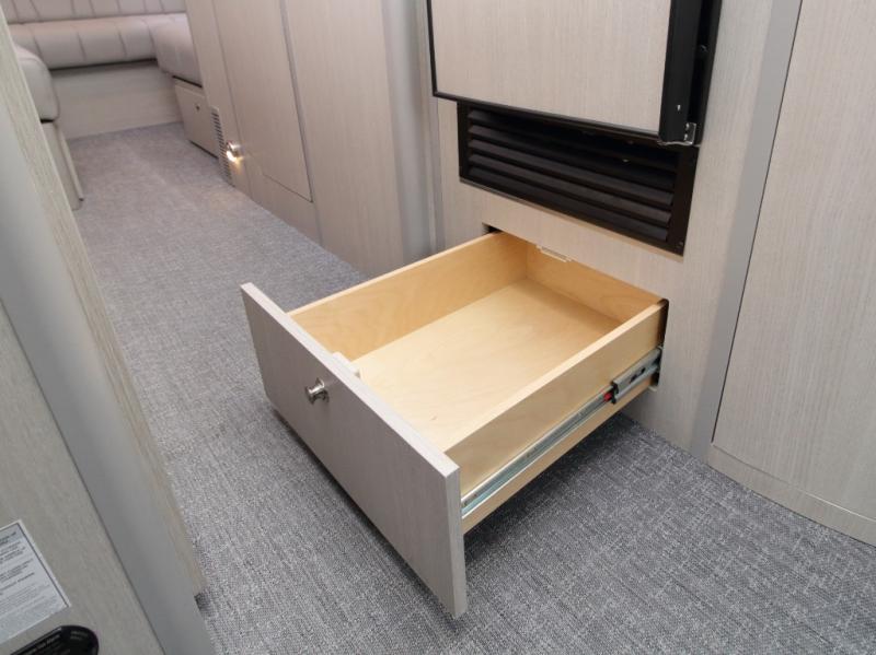 A private enclosed wet bath with a window and privacy shade offers the convenience you need on the road. Storage cabinets beside the bath keep clothing and linens organized. The galley kitchen is equipped with a two-burner propane cooktop, a farmhouse-style sink, and a combination microwave, convection oven, and air fryer, allowing you to prepare meals with ease wherever you travel.