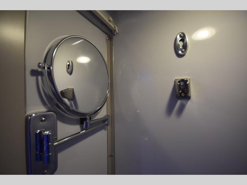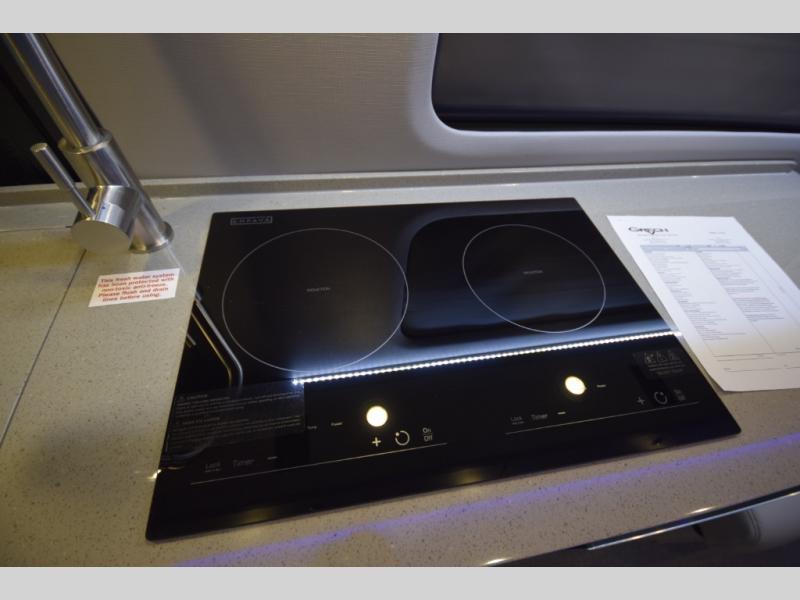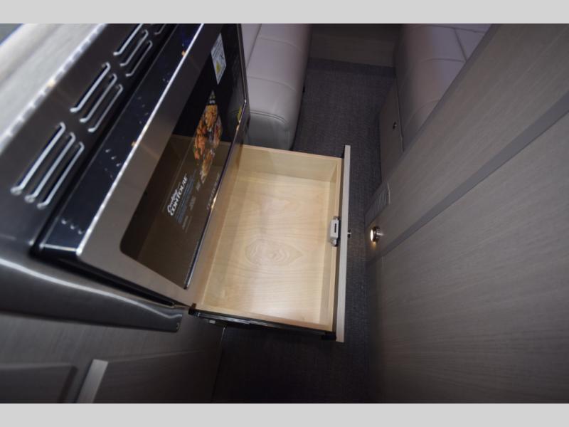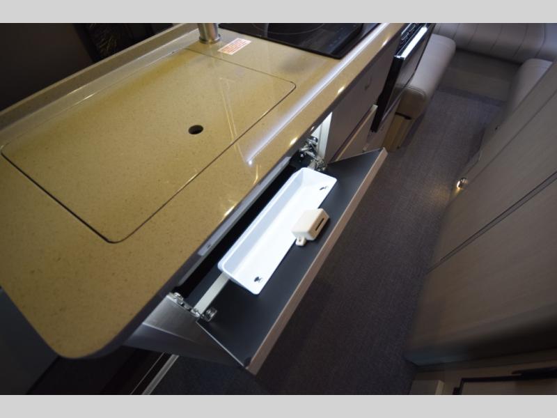 A private enclosed wet bath—with its own window and privacy shade—adds convenience and comfort on the road. In the galley, the chef will appreciate the farmhouse-style sink, the multi-function microwave/convection/air fryer, and a two-burner cooktop ready for everything from quick breakfasts to gourmet camp meals.
