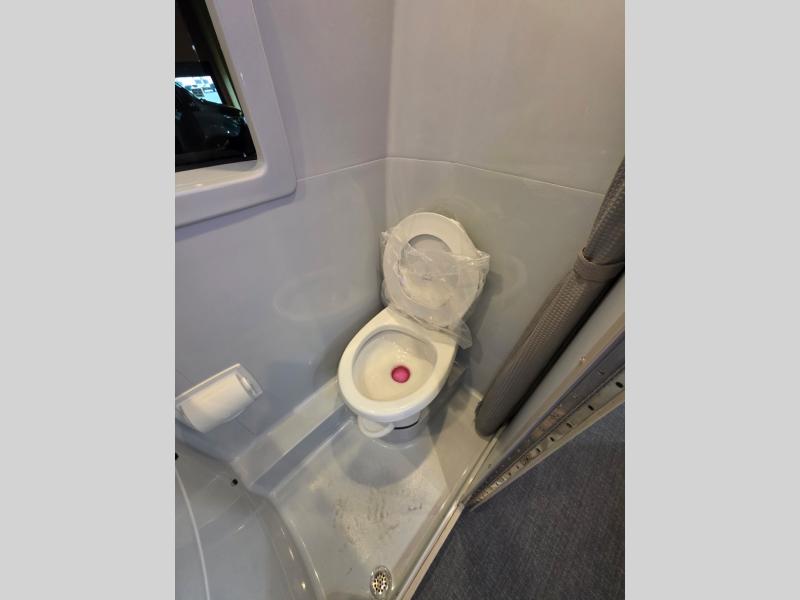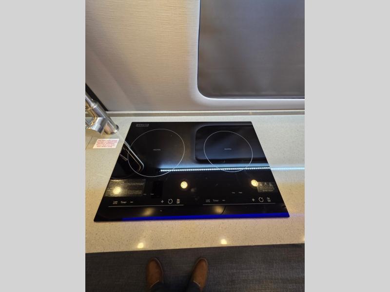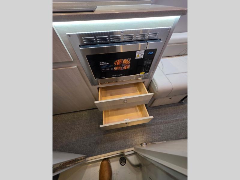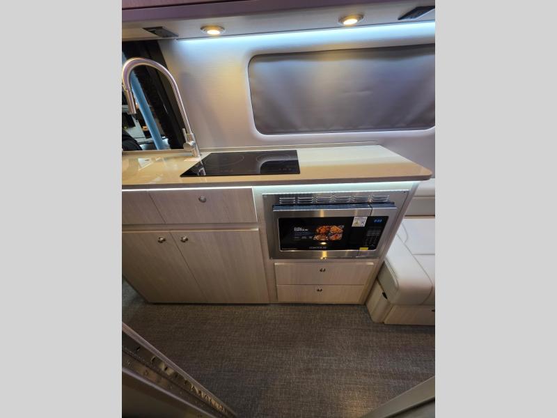 Luxury, functionality and sleeping for two is found in this versatile coach. There are seatbelts for seven for day trips with friends and a power sofa bed for couple's weekends. You will love the two captain's chairs that turn towards the rear for more seating once at your destination, and storage for your clothing is next to the wet bath. The private enclosed wet bath also includes a window and privacy shade. The cook can make meals using the galley kitchen with a farmhouse style sink, combo microwave/convection/air fryer and a two burner propane cooktop.