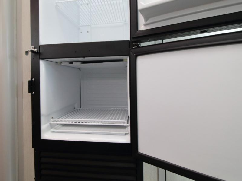 The private enclosed wet bath features a window and privacy shade, providing airflow and comfort in a compact design. In the galley kitchen, prepare meals with ease using the farmhouse-style sink, a combination microwave, convection oven, and air fryer, along with a two-burner induction cooktop that offers efficient, modern cooking on the road.