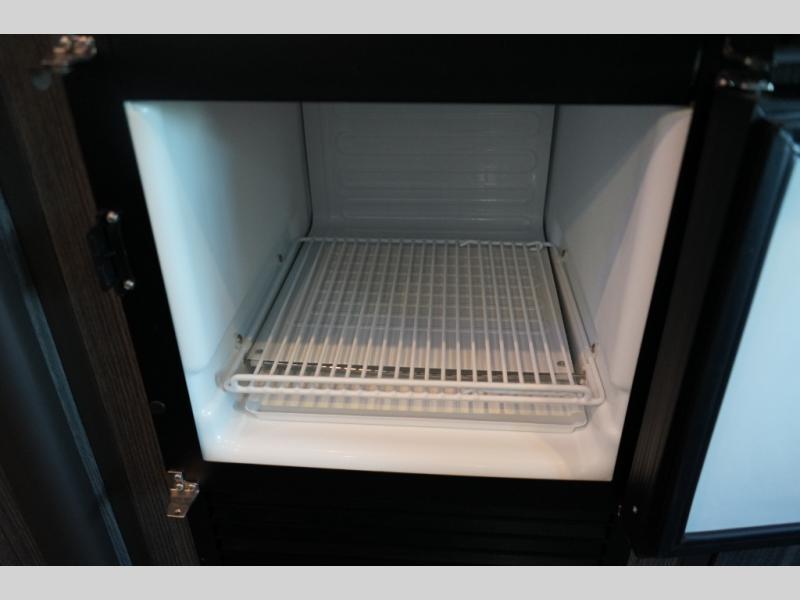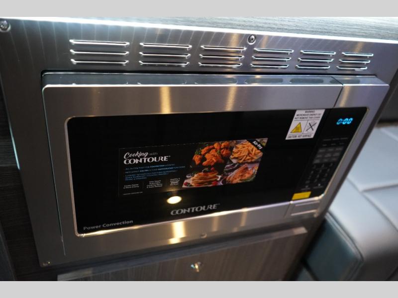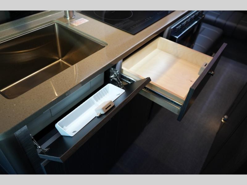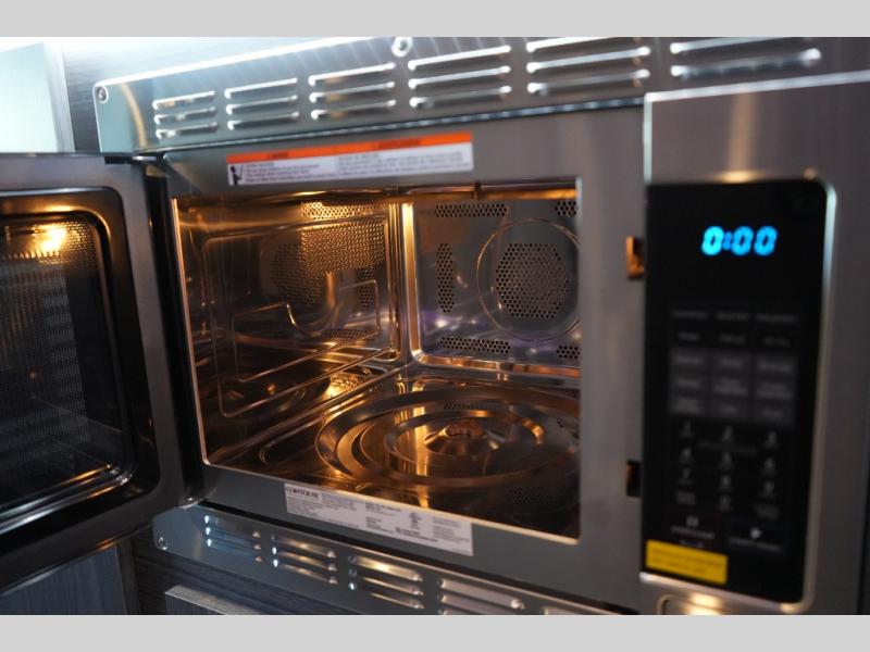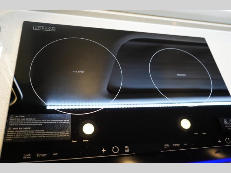 The kitchen includes a farmhouse-style sink with a pull-out sprayer, an induction cooktop, and a versatile microwave/convection/air fryer unit. Whether preparing quick snacks or full meals, the Terreno-ion makes cooking on the road easy and enjoyable.