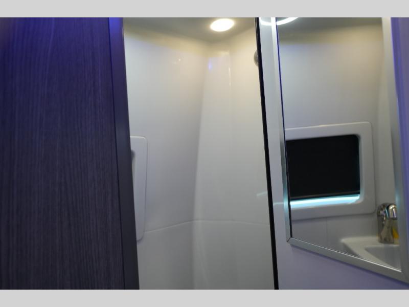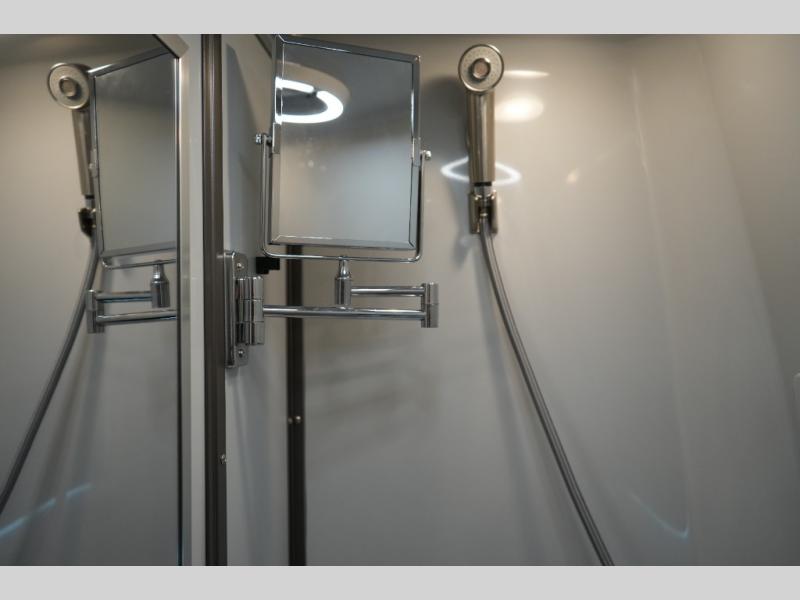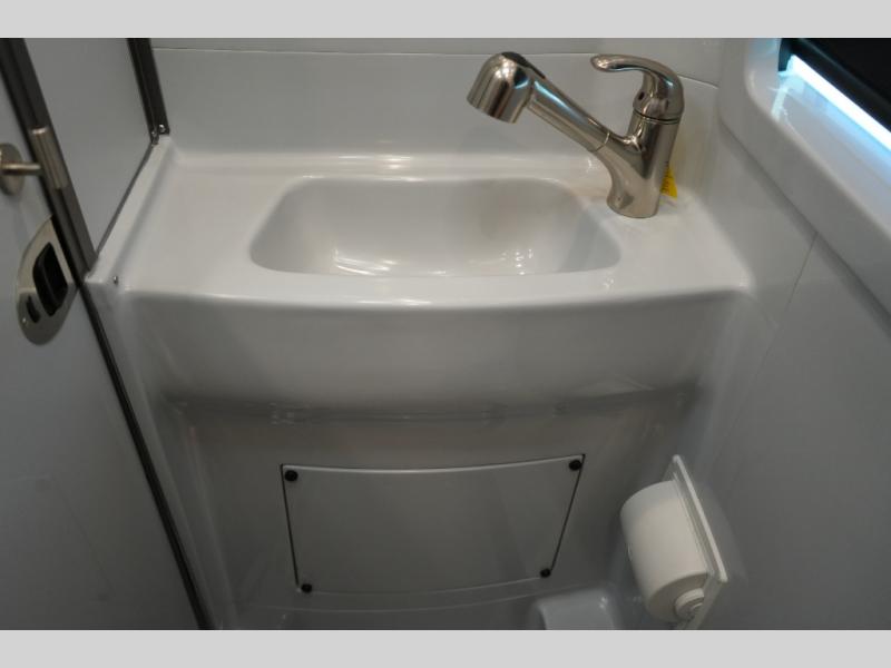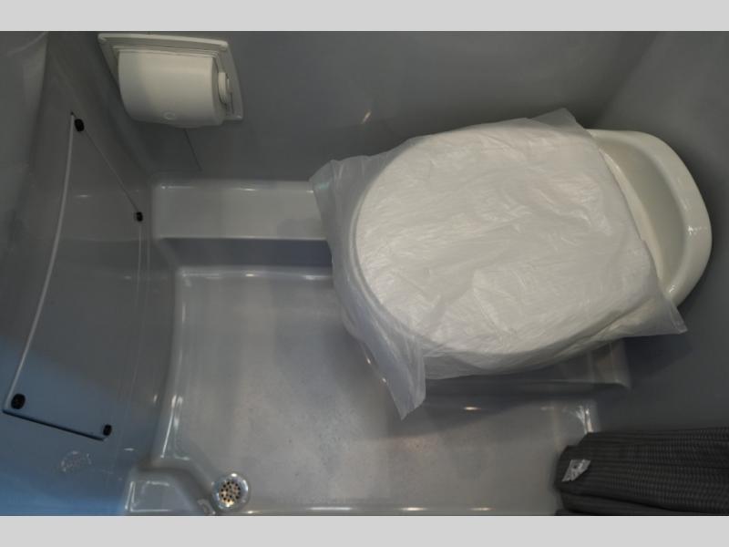 Enclosed Wet Bath – Includes a ceramic foot-flush toilet, handheld shower, vanity mirror, and retractable clothesline.