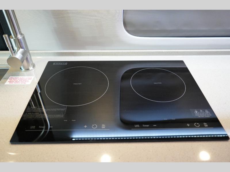 Galley Kitchen – Featuring an induction cooktop, convection microwave/air fryer combo, and a farmhouse sink with pull-out sprayer.