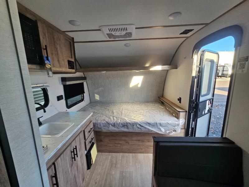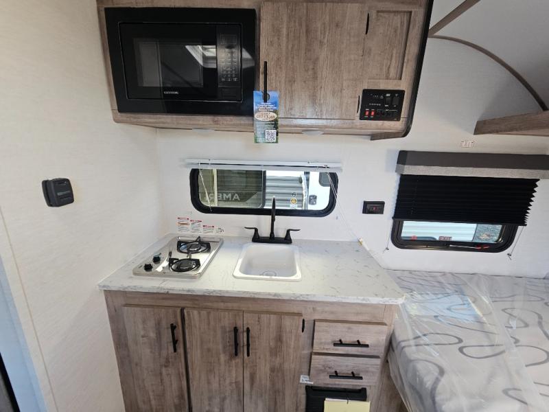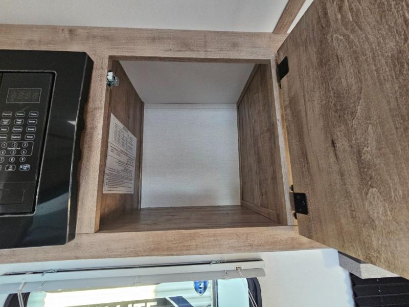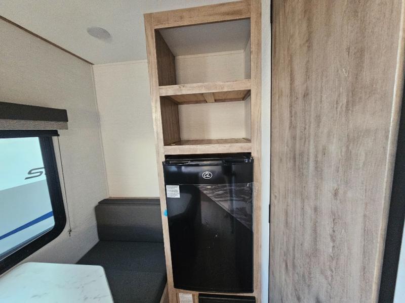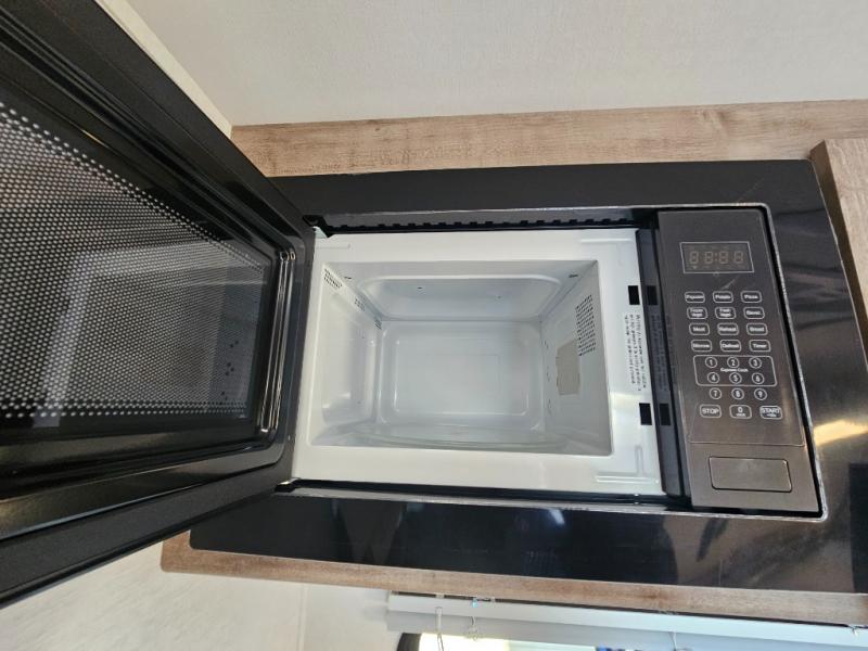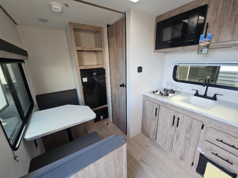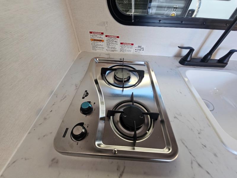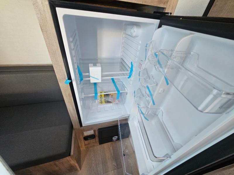You will love these travel trailer appliances! The sleek microwave and spacious refrigerator make meal prep effortless, while the convenient two-burner cooktop lets you cook up tasty meals on the go. The cozy dinette is perfect for savoring meals or enjoying quality time, and the plush bed ensures a rejuvenating night's sleep. Thoughtful storage solutions, including flip-up storage and overhead shelves, keep your belongings tidy and easily accessible. This travel trailer is perfect for anyone seeking a peaceful and adventurous retreat. With its clever design and functional features, it's easy to tow and park, allowing you to explore scenic destinations with ease.