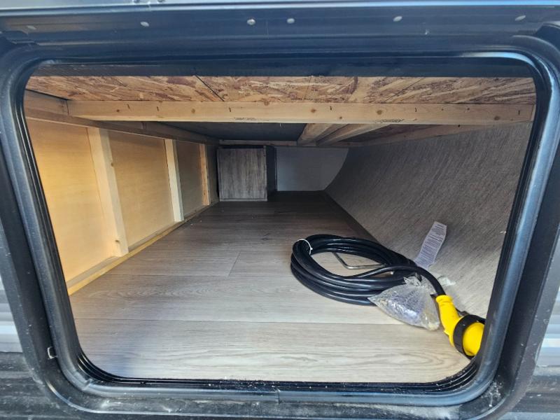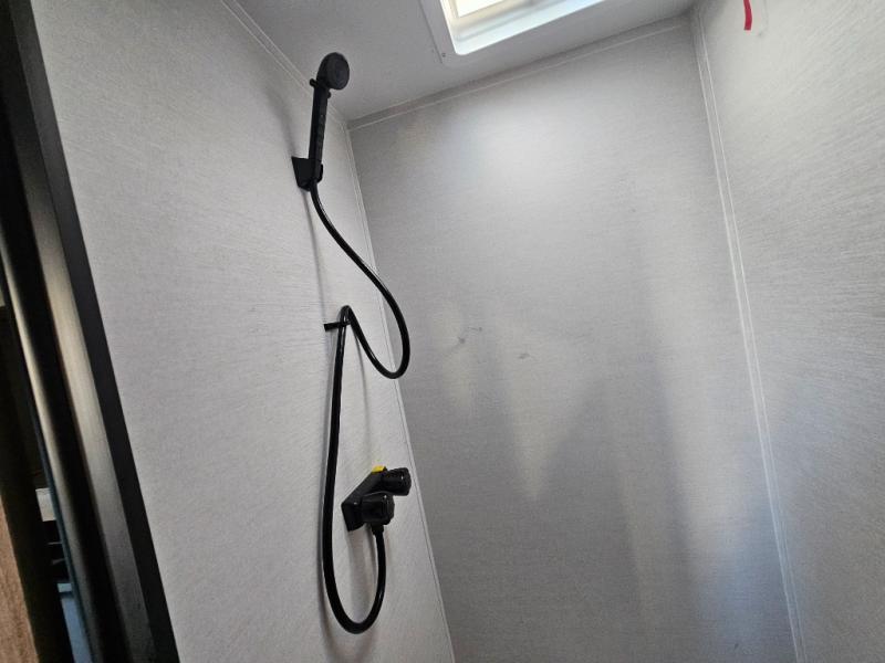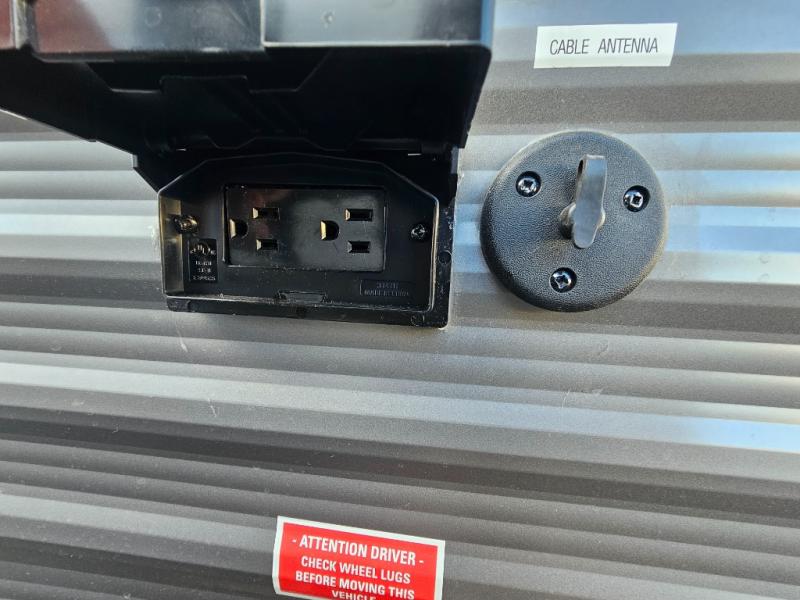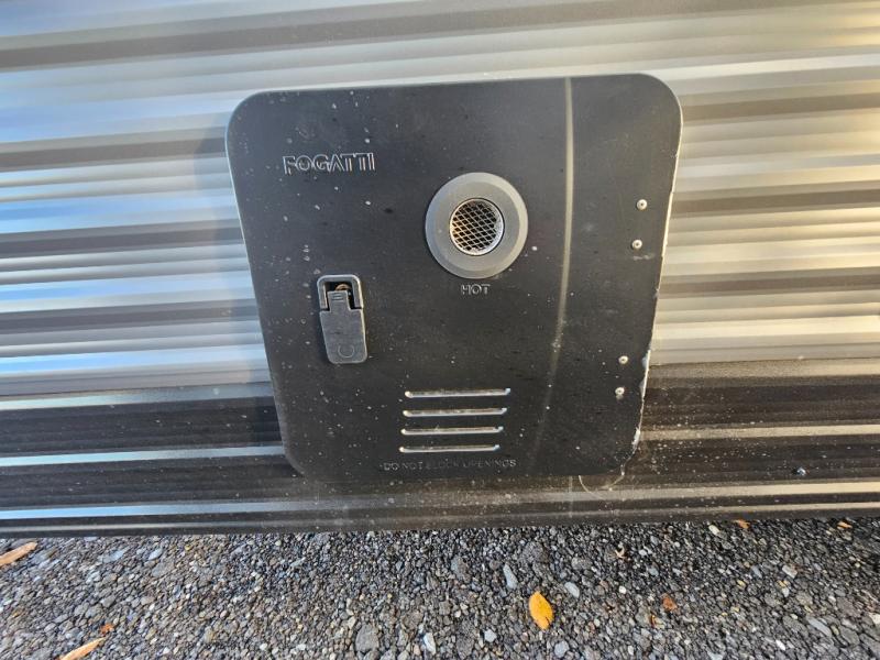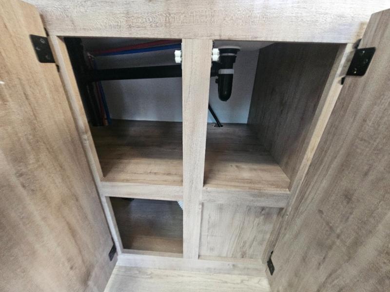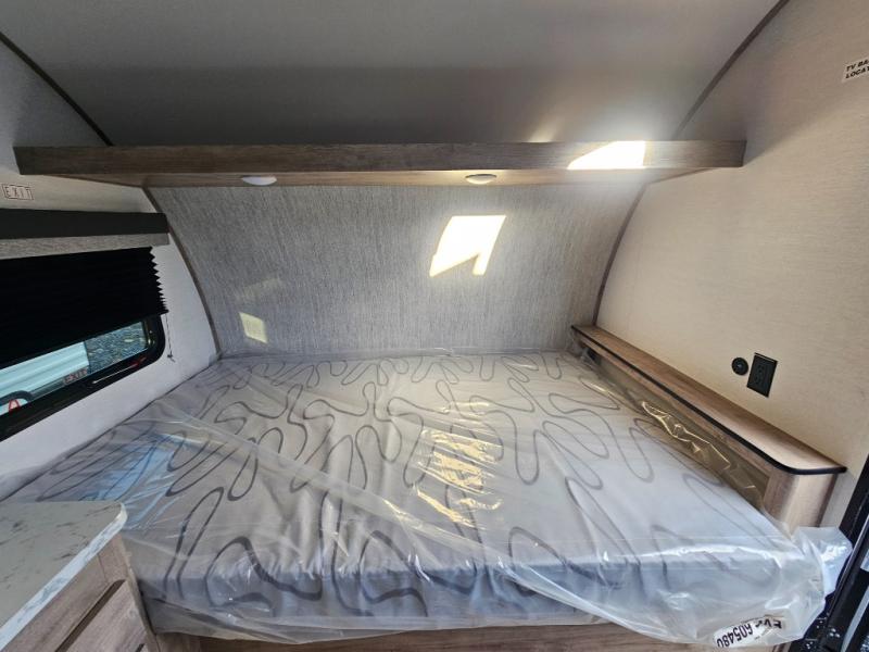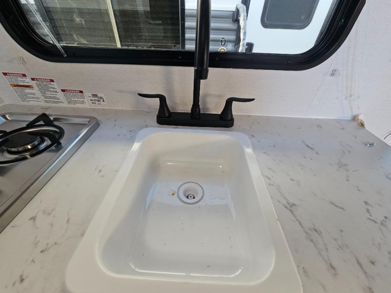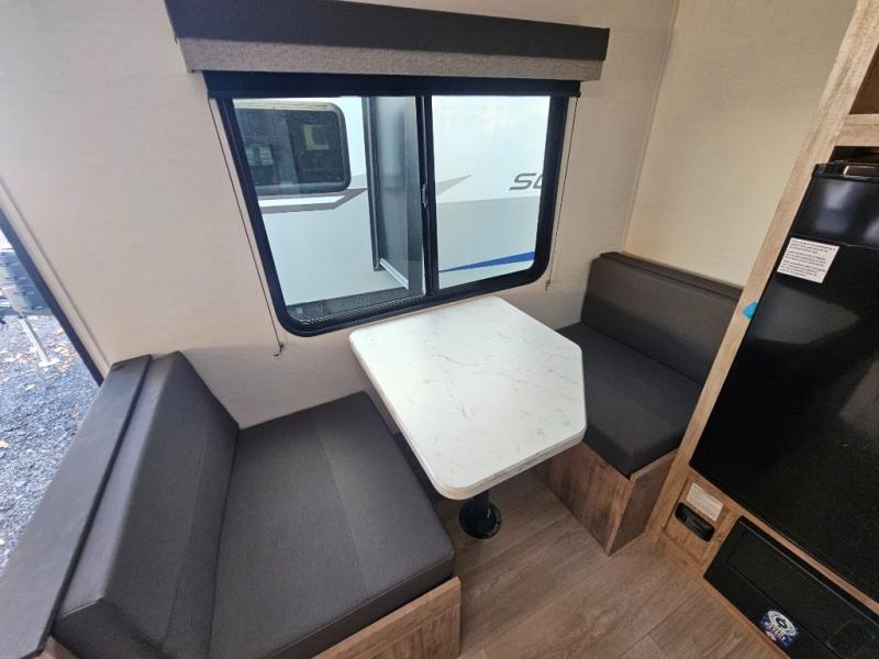 You will love these travel trailer appliances! The sleek microwave and spacious refrigerator make meal prep effortless, while the convenient two-burner cooktop lets you cook up tasty meals on the go. The cozy dinette is perfect for savoring meals or enjoying quality time, and the plush bed ensures a rejuvenating night's sleep. Thoughtful storage solutions, including flip-up storage and overhead shelves, keep your belongings tidy and easily accessible. This travel trailer is perfect for anyone seeking a peaceful and adventurous retreat. With its clever design and functional features, it's easy to tow and park, allowing you to explore scenic destinations with ease.