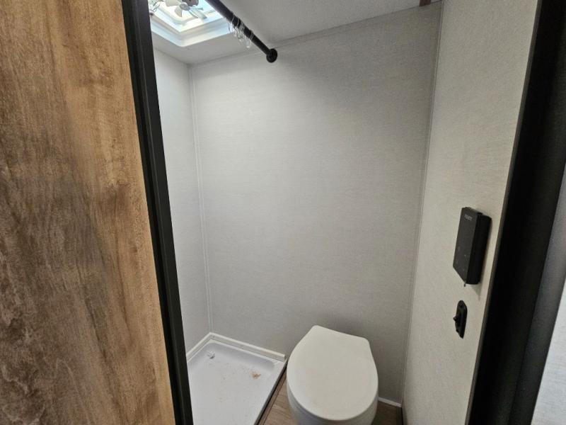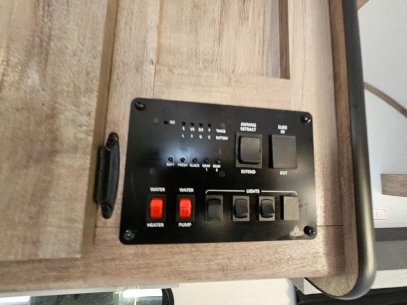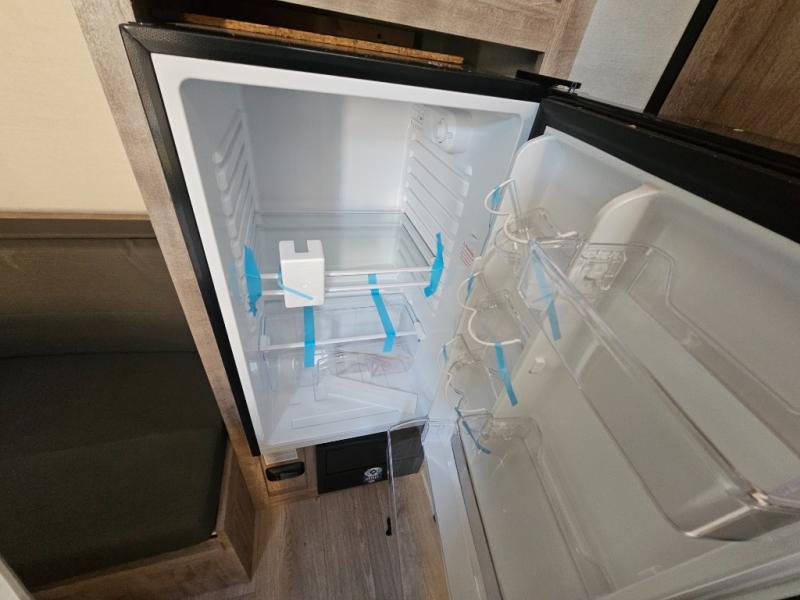 You will love these travel trailer appliances! The sleek microwave and spacious refrigerator make meal prep effortless, while the convenient two-burner cooktop lets you cook up tasty meals on the go. The cozy dinette is perfect for savoring meals or enjoying quality time, and the plush bed ensures a rejuvenating night's sleep. Thoughtful storage solutions, including flip-up storage and overhead shelves, keep your belongings tidy and easily accessible. This travel trailer is perfect for anyone seeking a peaceful and adventurous retreat. With its clever design and functional features, it's easy to tow and park, allowing you to explore scenic destinations with ease.