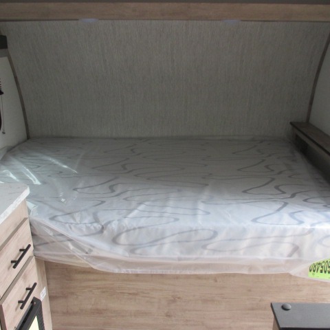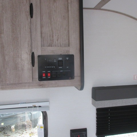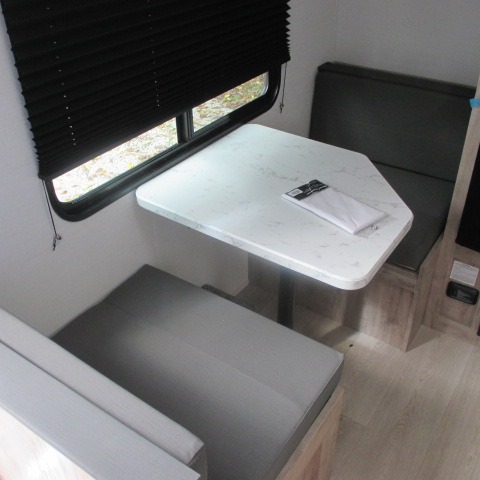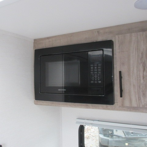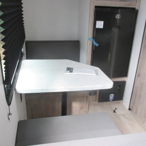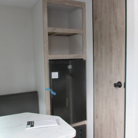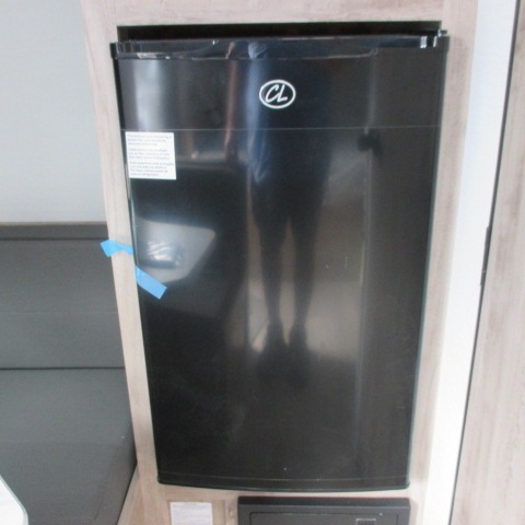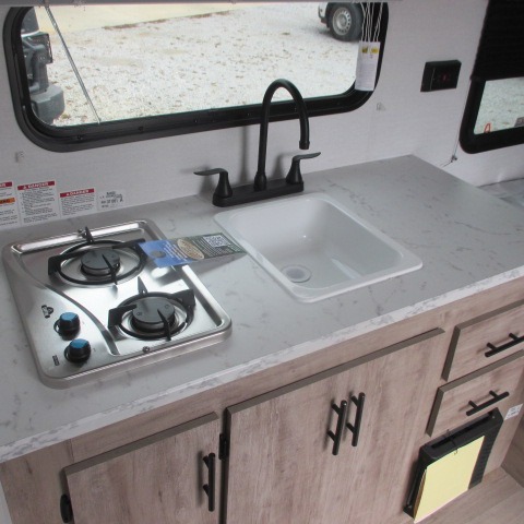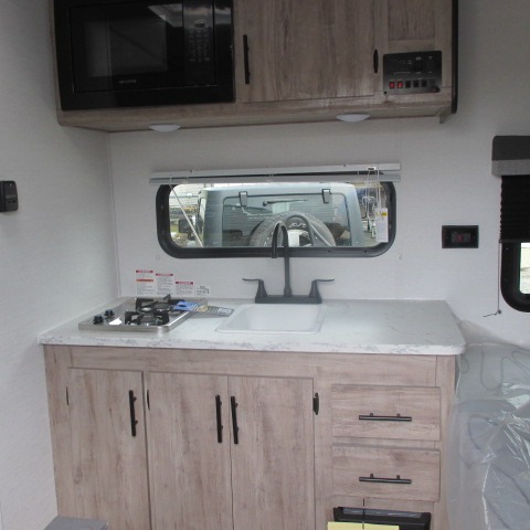 You will love these travel trailer appliances! The sleek microwave and spacious refrigerator make meal prep effortless, while the convenient two-burner cooktop lets you cook up tasty meals on the go. The cozy dinette is perfect for savoring meals or enjoying quality time, and the plush bed ensures a rejuvenating night's sleep. Thoughtful storage solutions, including flip-up storage and overhead shelves, keep your belongings tidy and easily accessible. This travel trailer is perfect for anyone seeking a peaceful and adventurous retreat. With its clever design and functional features, it's easy to tow and park, allowing you to explore scenic destinations with ease.