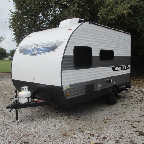 If you're looking for an affordable, lightweight travel trailer, you've found it in the Ameri-Lite Super Lite by Gulf Stream. These models may be lighter in weight, but they don't skimp out on comfortable features. Each unit includes high-performance vinyl flooring throughout, a white kitchen sink, craft-made cabinetry with designer pulls, plus fabric-wrapped box valances to make you feel right at home. You'll enjoy the 6' 8" interior height, wood ceiling trim, multiple USB ports, and more features included within the Camping Package. These models also include a tankless water heater, a central control panel to control your unit's functions, plus plenty of safety features you are sure to appreciate for your family. You can't go wrong with an Ameri-Lite Super Lite travel trailer. Choose your favorite floorplan today!