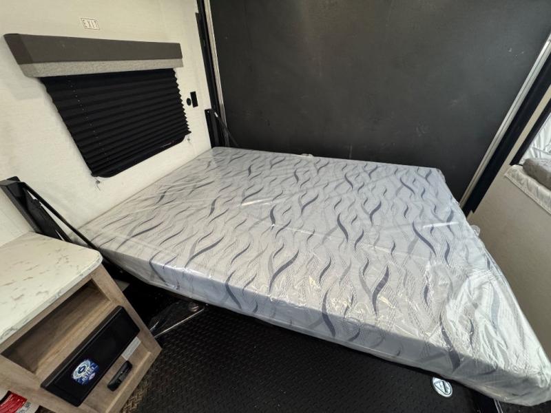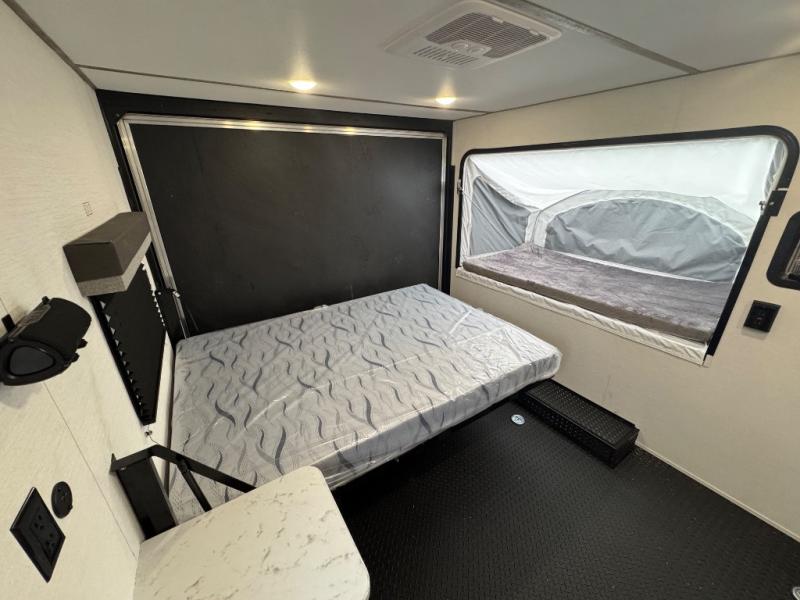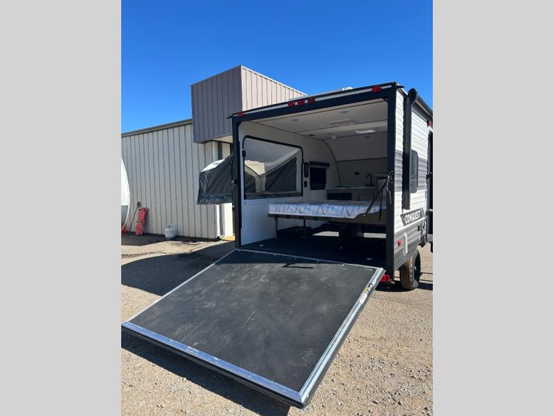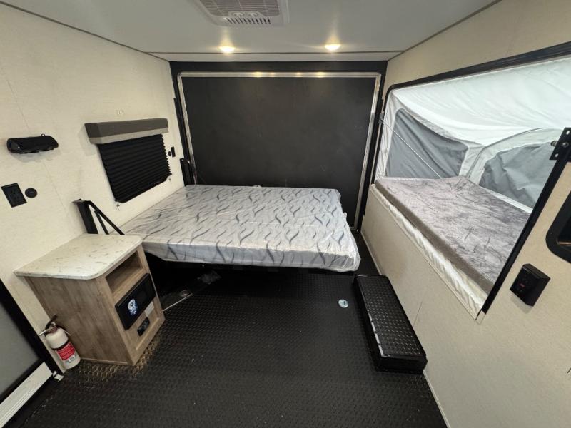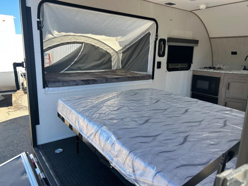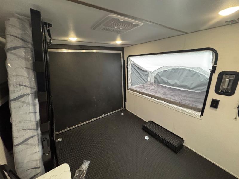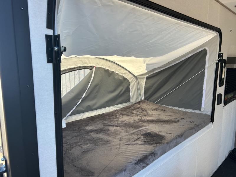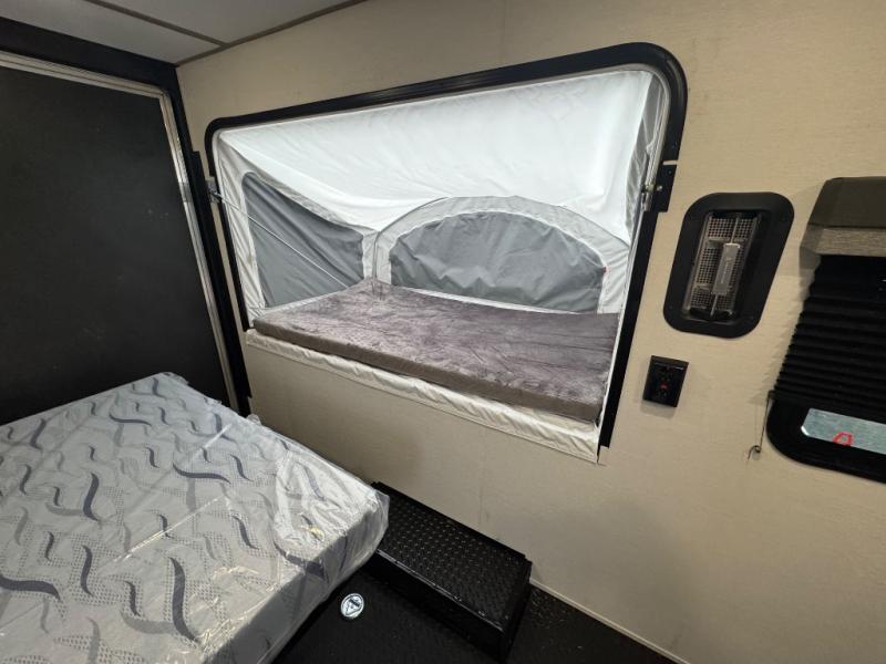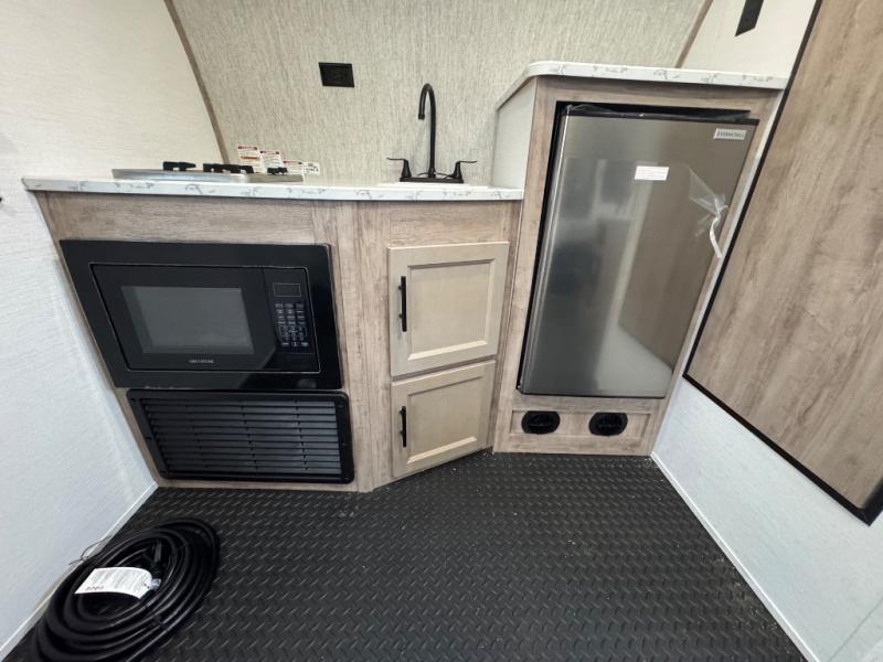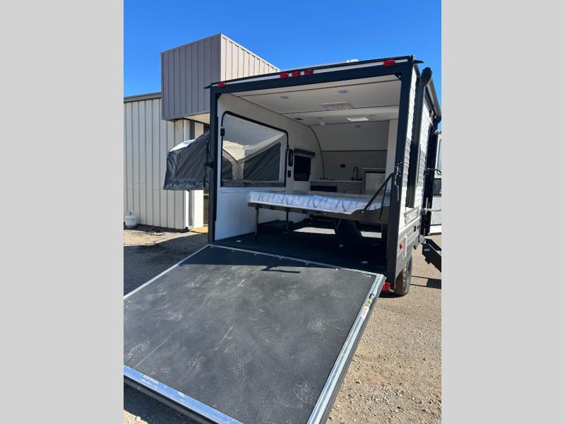 Load up your dirt bike and head to the lake for a fun weekend in this toy hauler. Once you've unloaded your toys, you can make lunch on the two-burner cooktop in the front corner kitchen, grab a cold drink from the refrigerator, and relax in your camp chairs outdoors. A 54" x 74" flip-up bed will provide versatile sleeping space, and you can choose an optional fold-out tent with a bed if you need more accommodations for guests. The wet bath on this model will also make camping easier than ever since you won't have to leave your trailer in the middle of the night!