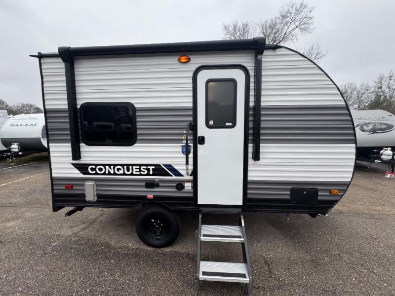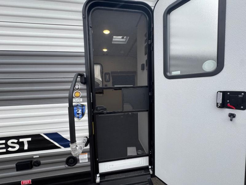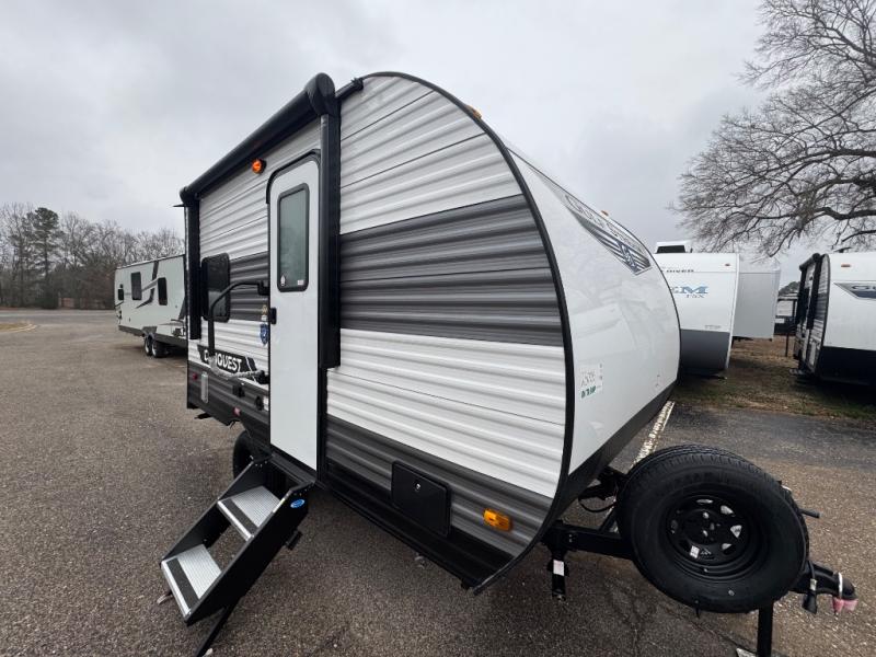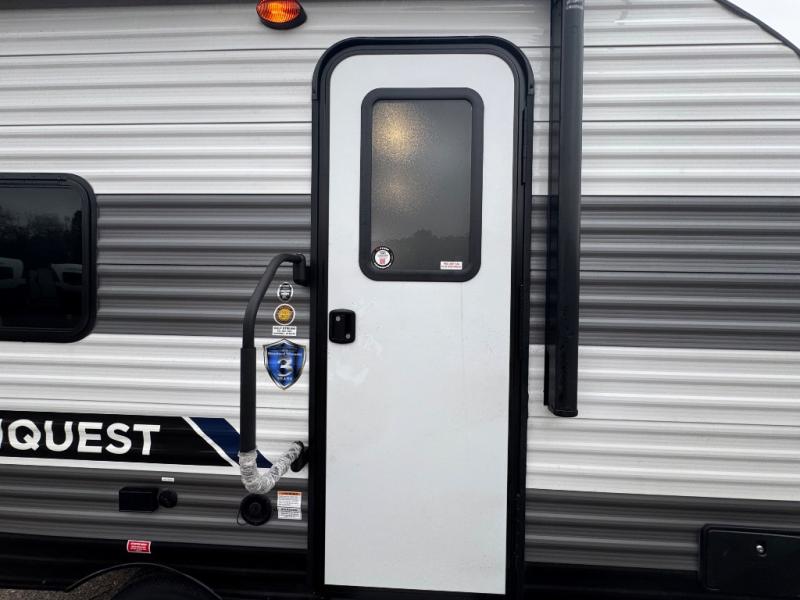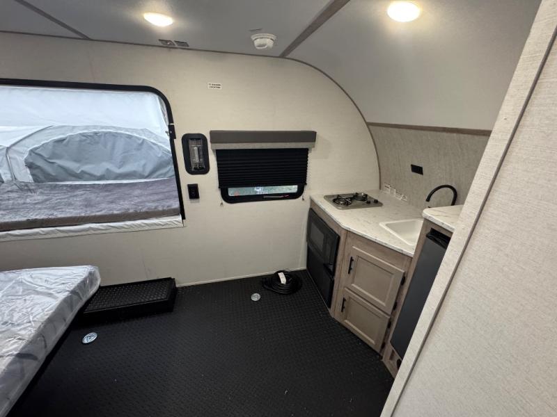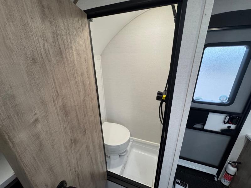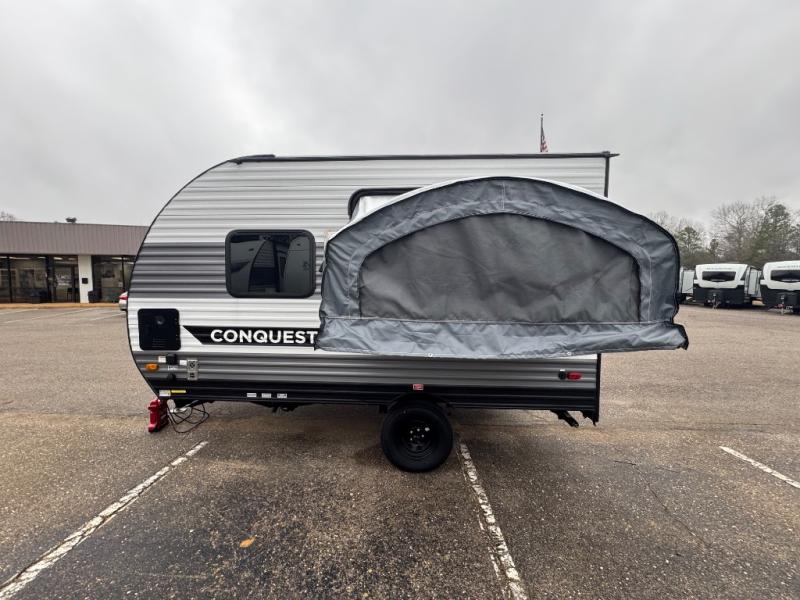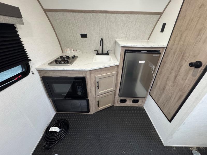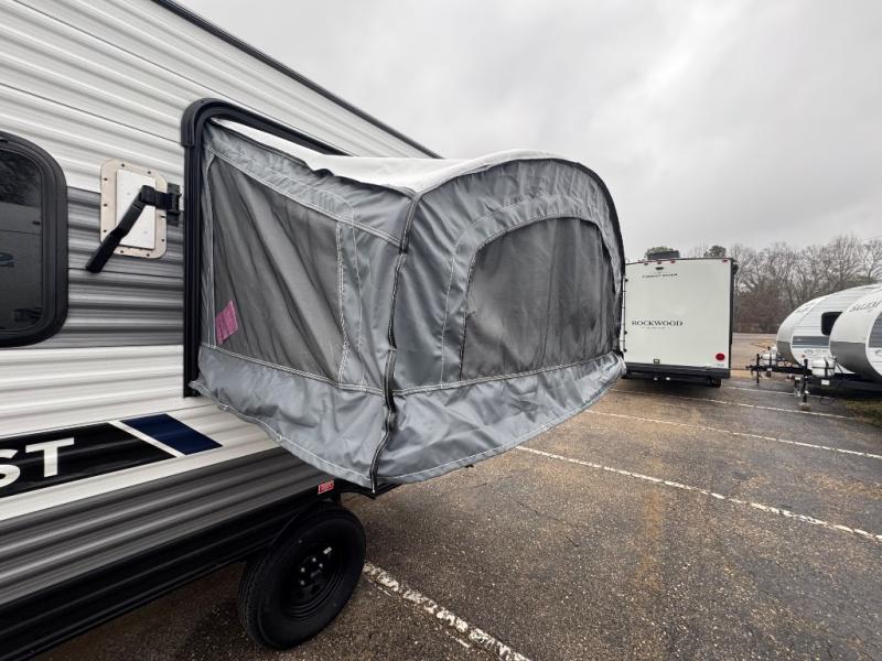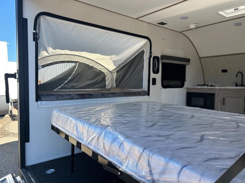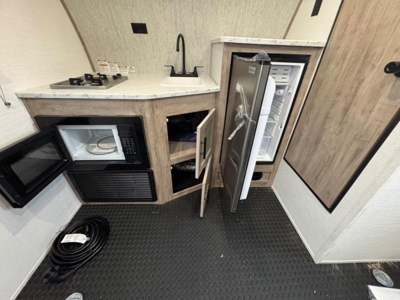 Load up your dirt bike and head to the lake for a fun weekend in this toy hauler. Once you've unloaded your toys, you can make lunch on the two-burner cooktop in the front corner kitchen, grab a cold drink from the refrigerator, and relax in your camp chairs outdoors. A 54" x 74" flip-up bed will provide versatile sleeping space, and you can choose an optional fold-out tent with a bed if you need more accommodations for guests. The wet bath on this model will also make camping easier than ever since you won't have to leave your trailer in the middle of the night!