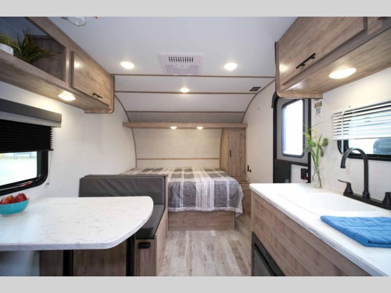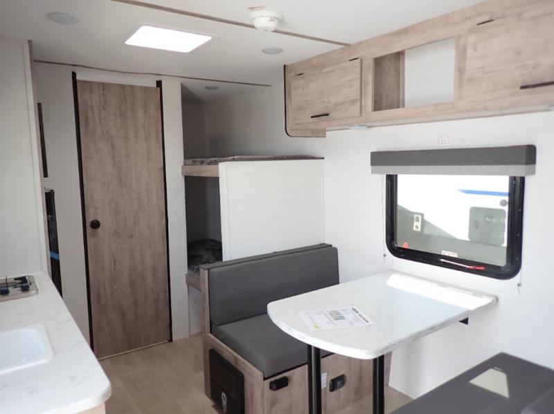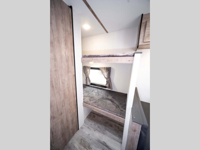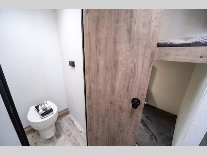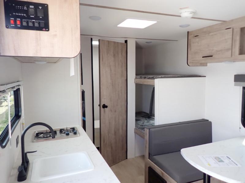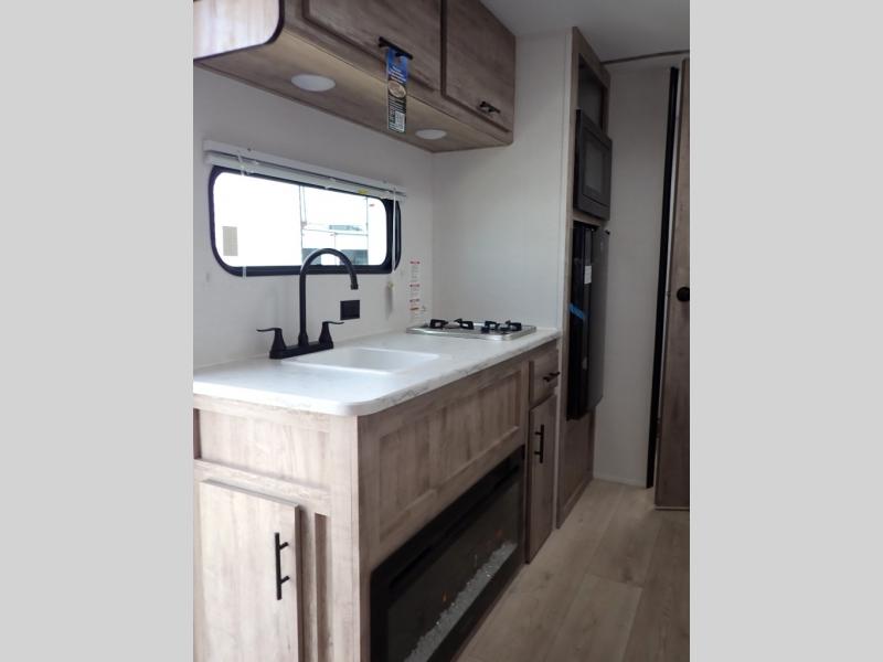 It's easier than ever to enjoy the camping lifestyle with this lightweight travel trailer. There are bunk beds for your guests or little ones, a front bed for you, plus a booth dinette that can double as dining and sleeping space. The private toilet and shower will allow you to stay clean throughout each trip, and since the sink is at the kitchen counter, someone can brush their teeth while the other showers before bed. You will love the fireplace included in this model for a more at-home feel, or you just might find yourselves outdoors under the power awning most of the day!