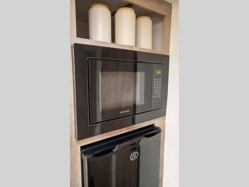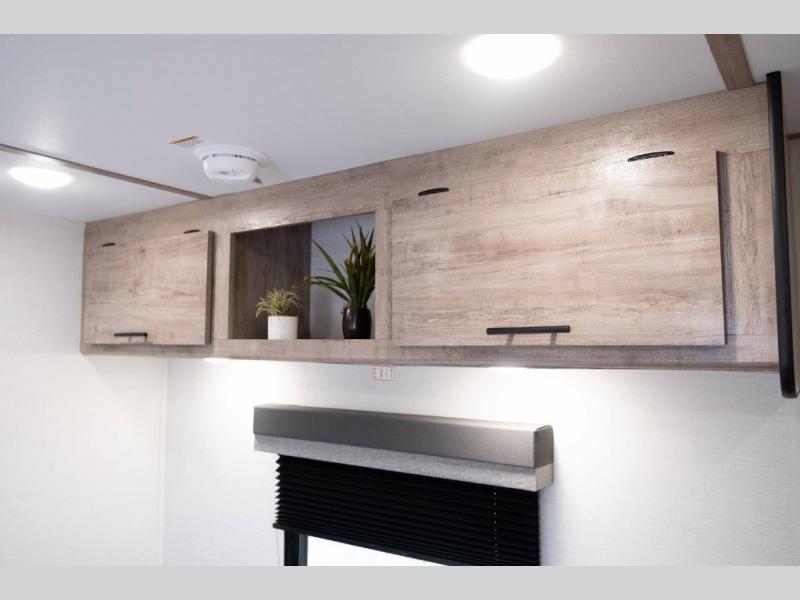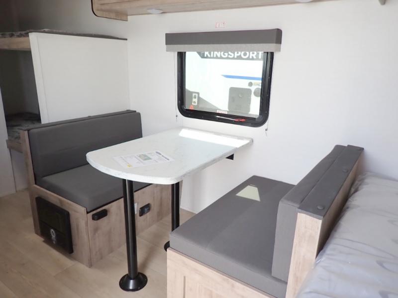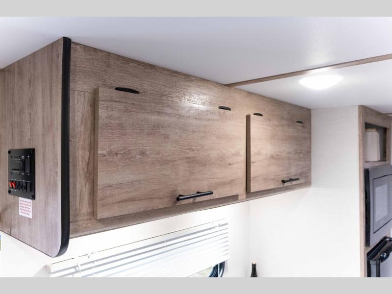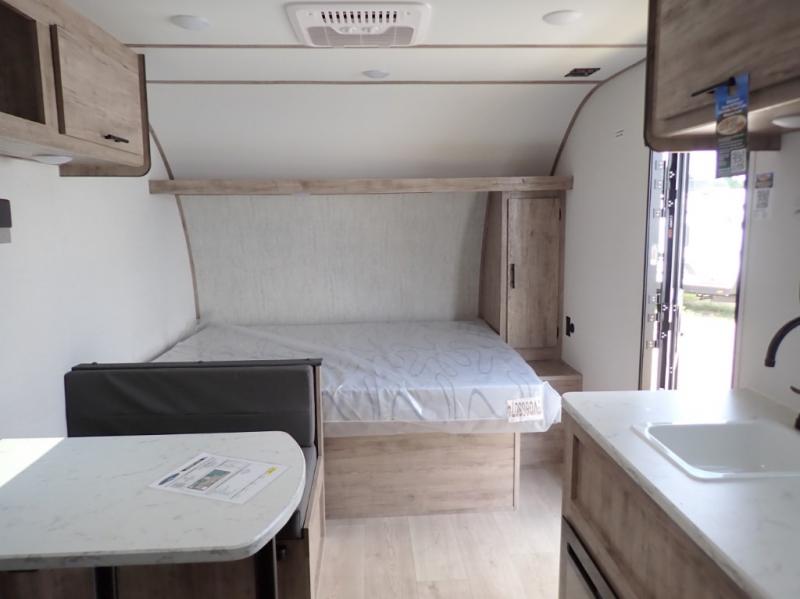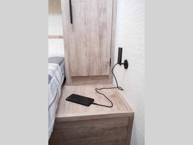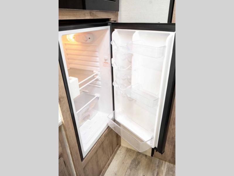 It's easier than ever to enjoy the camping lifestyle with this lightweight travel trailer. There are bunk beds for your guests or little ones, a front bed for you, plus a booth dinette that can double as dining and sleeping space. The private toilet and shower will allow you to stay clean throughout each trip, and since the sink is at the kitchen counter, someone can brush their teeth while the other showers before bed. You will love the fireplace included in this model for a more at-home feel, or you just might find yourselves outdoors under the power awning most of the day!