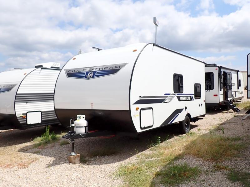 If you're looking for an affordable, lightweight travel trailer, you've found it in the Ameri-Lite Super Lite by Gulf Stream. These models may be lighter in weight, but they don't skimp out on comfortable features. Each unit includes high-performance vinyl flooring throughout, a white kitchen sink, craft-made cabinetry with designer pulls, plus fabric-wrapped box valances to make you feel right at home. The 16,000 BTU furnace and 8,000 BTU A/C will keep you comfortable in any season, and each model includes multiple USB ports for your tablet and phone and a 6' 8" ceiling height for added space. These models also include a 6-gallon gas DSI water heater, a central control panel to control your unit's functions, plus plenty of safety features you are sure to appreciate for your family. You can't go wrong with an Ameri-Lite Super Lite travel trailer. Choose your favorite floorplan today!