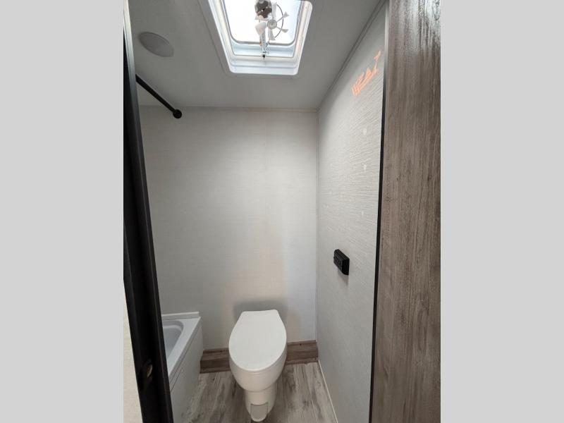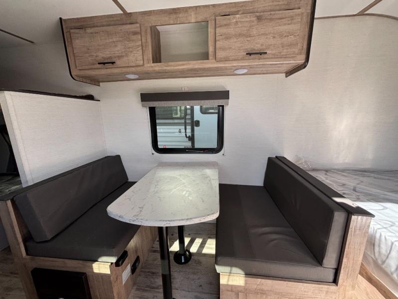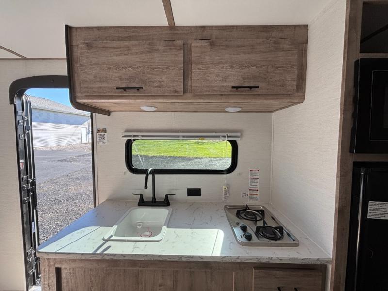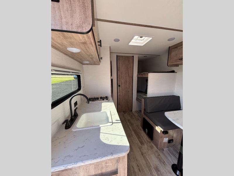 It's easier than ever to enjoy the camping lifestyle with this lightweight travel trailer. There are bunk beds for your guests or little ones, a front bed for you, plus a booth dinette that can double as dining and sleeping space. The private toilet and shower will allow you to stay clean throughout each trip, and since the sink is at the kitchen counter, someone can brush their teeth while the other showers before bed. You will love the fireplace included in this model for a more at-home feel, or you just might find yourselves outdoors under the power awning most of the day!