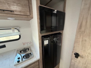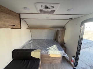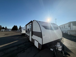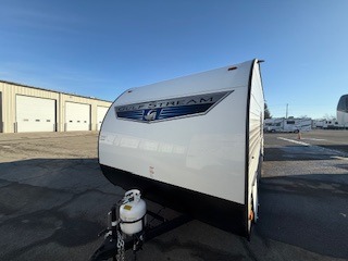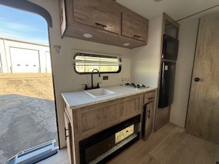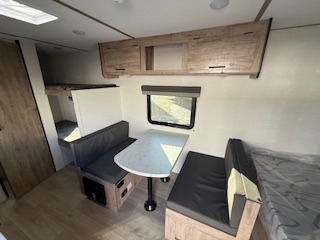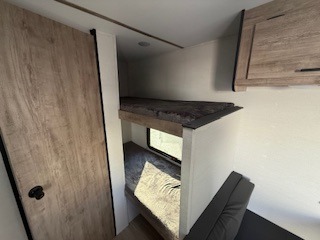 It's easier than ever to enjoy the camping lifestyle with this lightweight travel trailer. There are bunk beds for your guests or little ones, a front bed for you, plus a booth dinette that can double as dining and sleeping space. The private toilet and shower will allow you to stay clean throughout each trip, and since the sink is at the kitchen counter, someone can brush their teeth while the other showers before bed. You will love the fireplace included in this model for a more at-home feel, or you just might find yourselves outdoors under the power awning most of the day!
