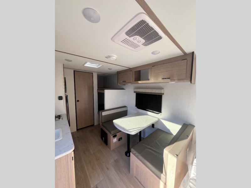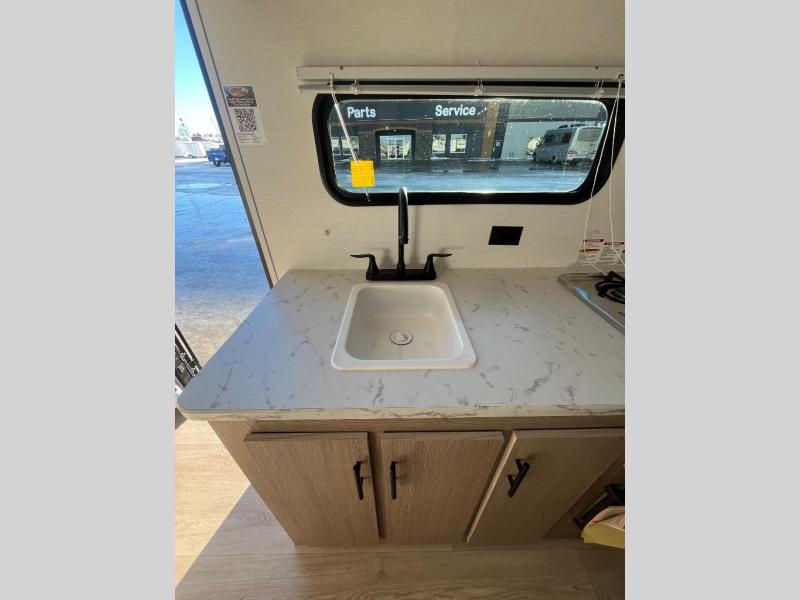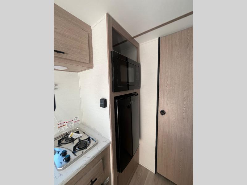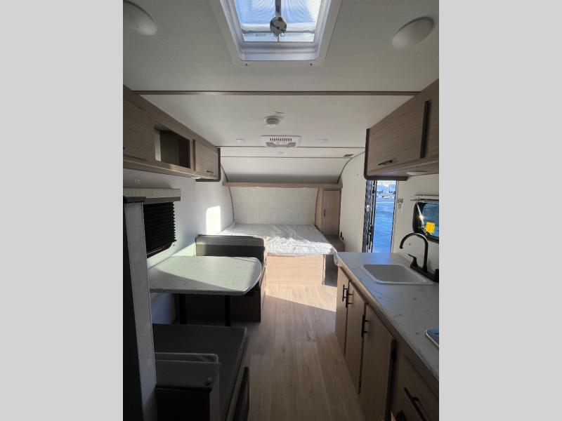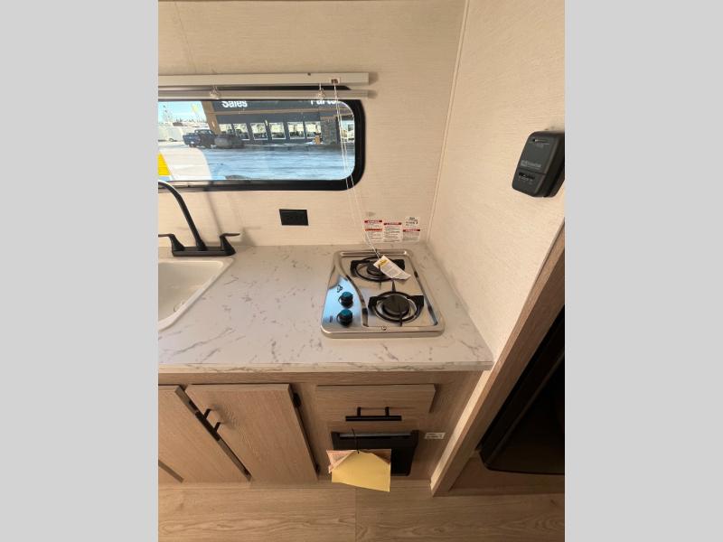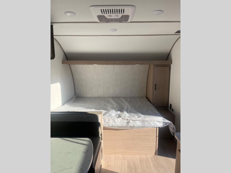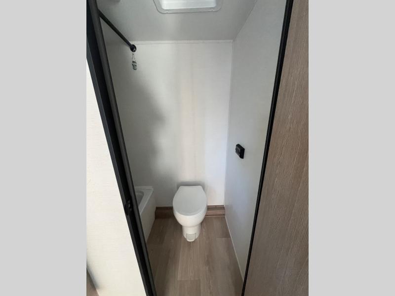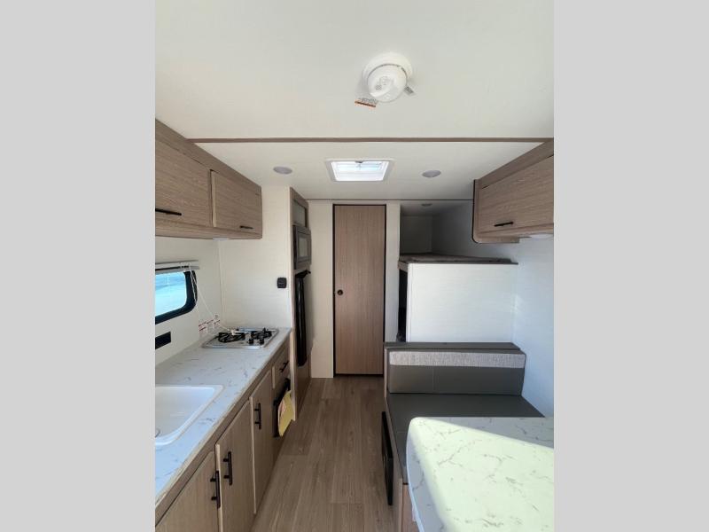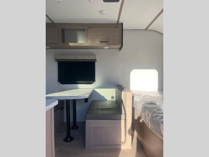 It's easier than ever to enjoy the camping lifestyle with this lightweight travel trailer. There are bunk beds for your guests or little ones, a front bed for you, plus a booth dinette that can double as dining and sleeping space. The private toilet and shower will allow you to stay clean throughout each trip, and since the sink is at the kitchen counter, someone can brush their teeth while the other showers before bed. You will love the fireplace included in this model for a more at-home feel, or you just might find yourselves outdoors under the power awning most of the day!