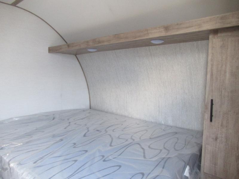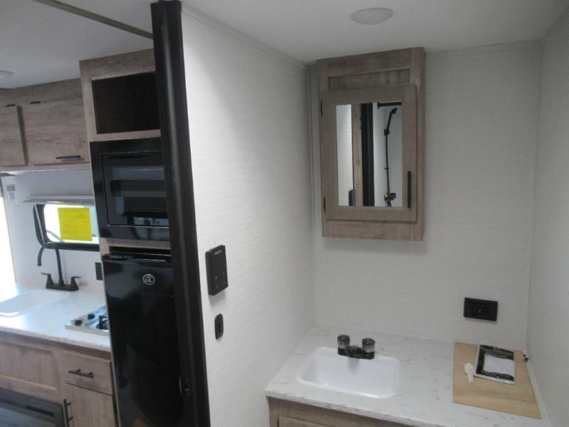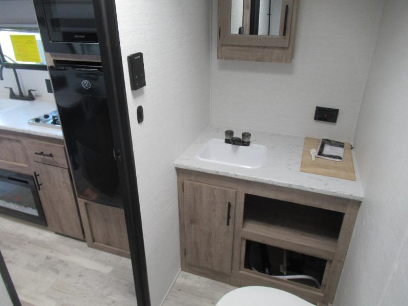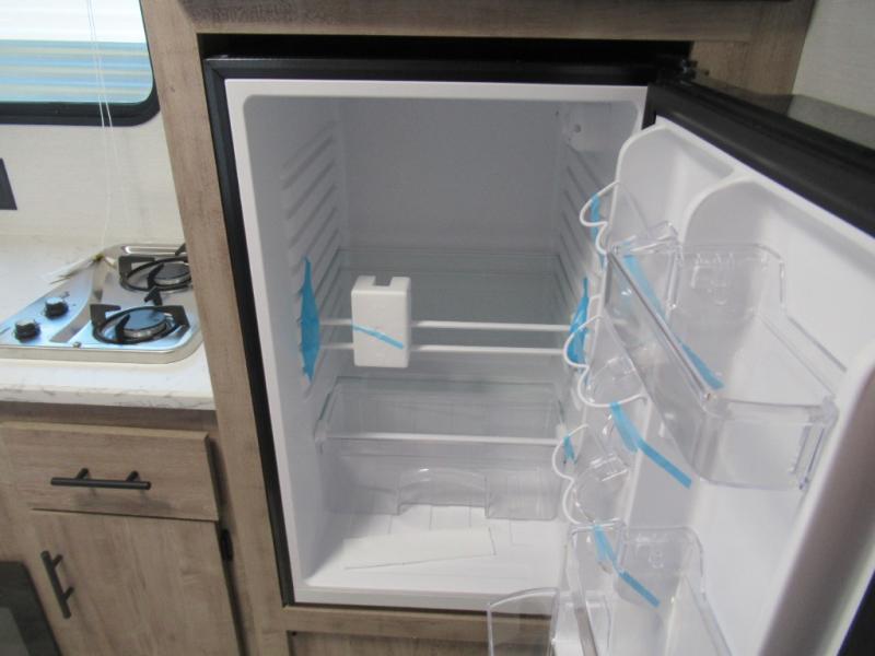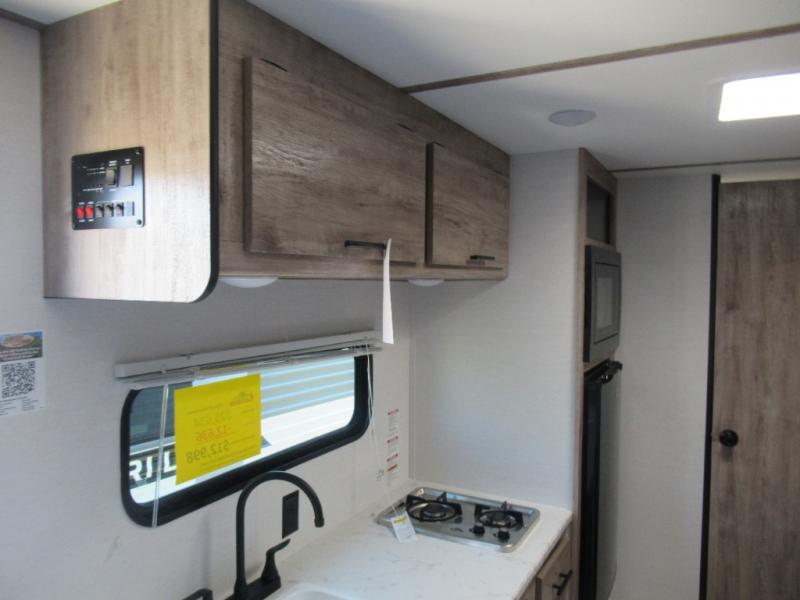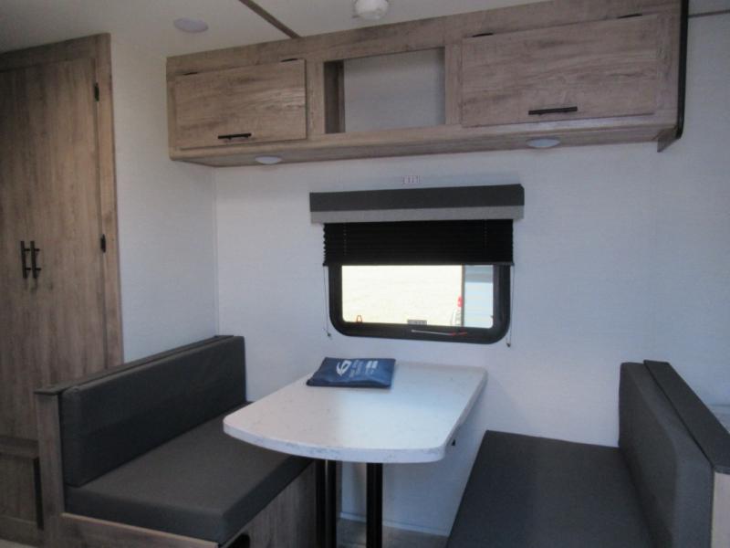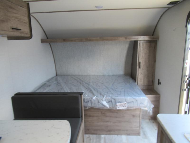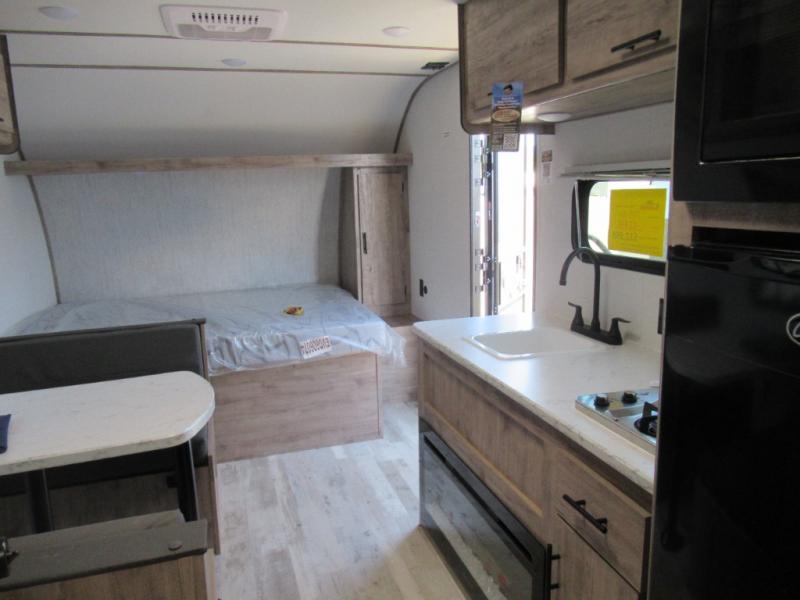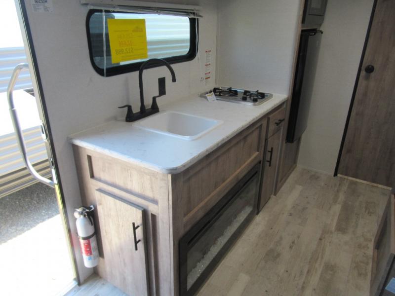 A cozy travel trailer for two or four to enjoy! This unit features a rear bath layout which includes a shower, toilet, and vanity with sink, plus medicine cabinet. No campsite facilities needed! Cook meals and snacks using the two burner cooktop and microwave oven and enjoy eating inside at the booth dinette. When you are not enjoying a meal, the dinette is a great place to play a board game or cards. There is a large closet for clothing storage, and overhead cabinets for your things as well. The front bed is perfect for two, and a nightstand is available for your personal belongings, plus more storage can be found with a large front overhead shelf. This unit even has a fireplace beneath the kitchen sink area!!
