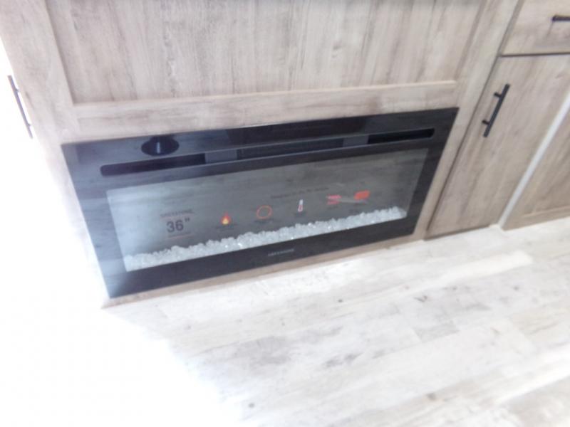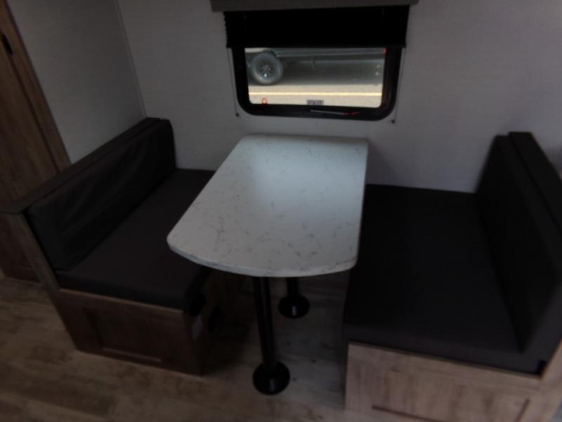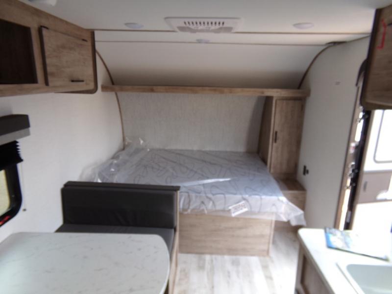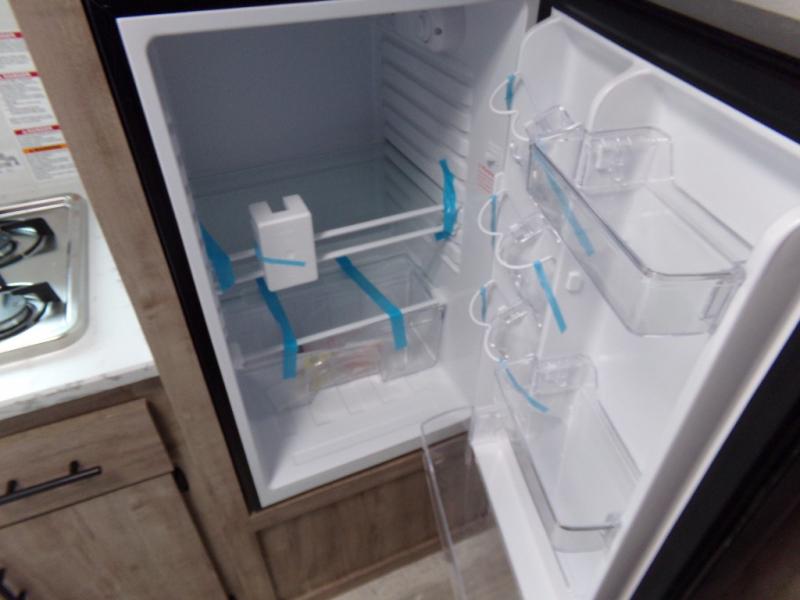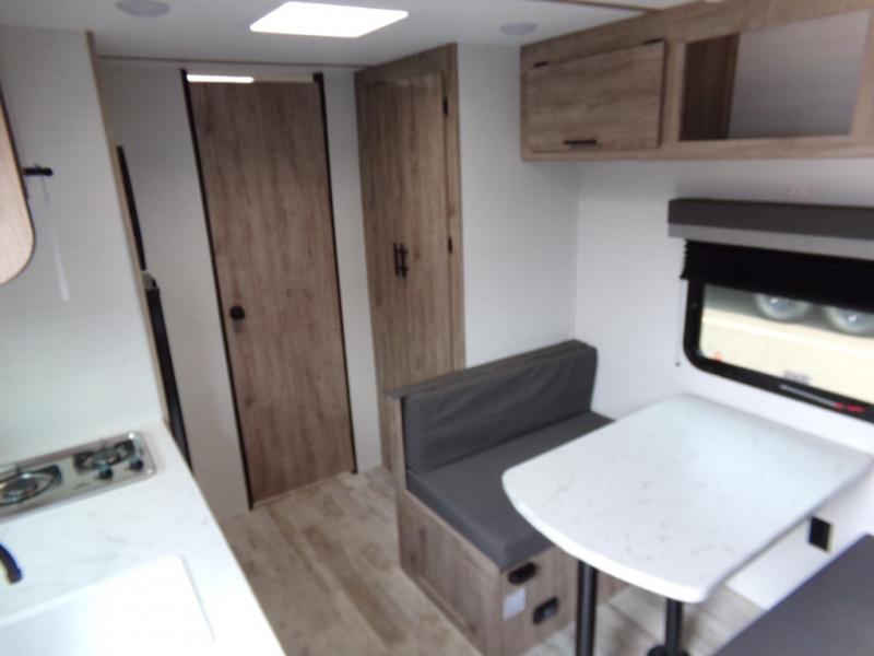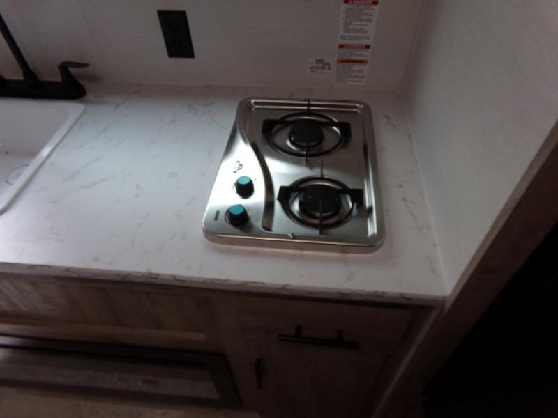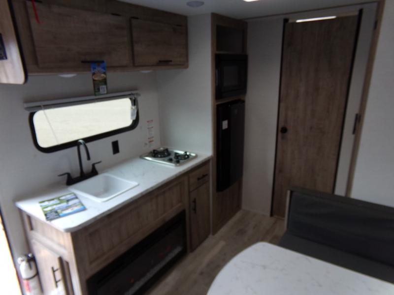 A cozy travel trailer for two or four to enjoy! This unit features a rear bath layout which includes a shower, toilet, and vanity with sink, plus medicine cabinet. No campsite facilities needed! Cook meals and snacks using the two burner cooktop and microwave oven and enjoy eating inside at the booth dinette. When you are not enjoying a meal, the dinette is a great place to play a board game or cards. There is a large closet for clothing storage, and overhead cabinets for your things as well. The front bed is perfect for two, and a nightstand is available for your personal belongings, plus more storage can be found with a large front overhead shelf. This unit even has a fireplace beneath the kitchen sink area!!