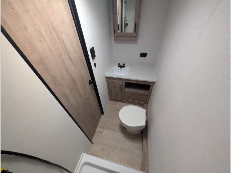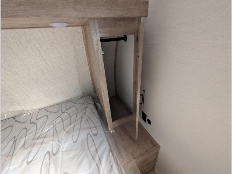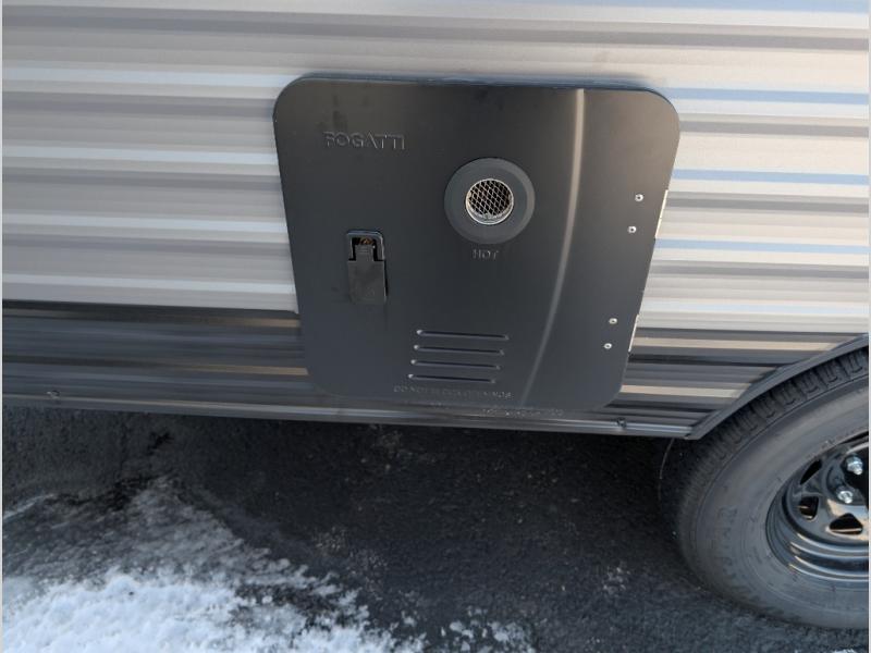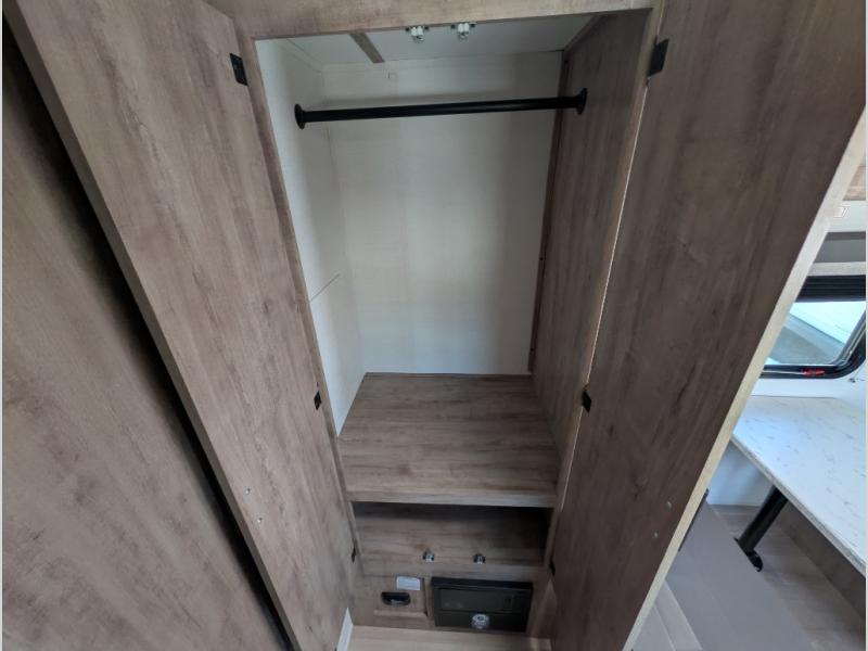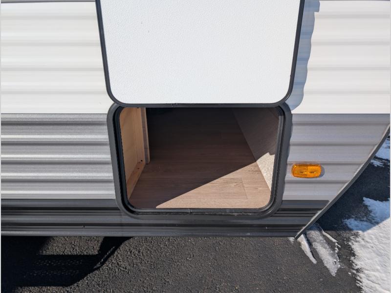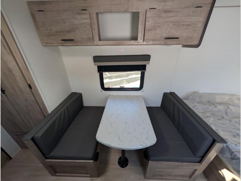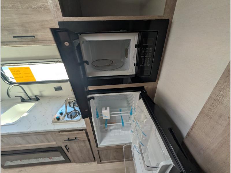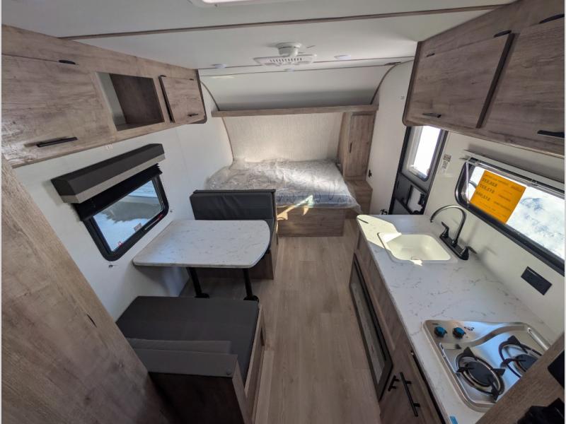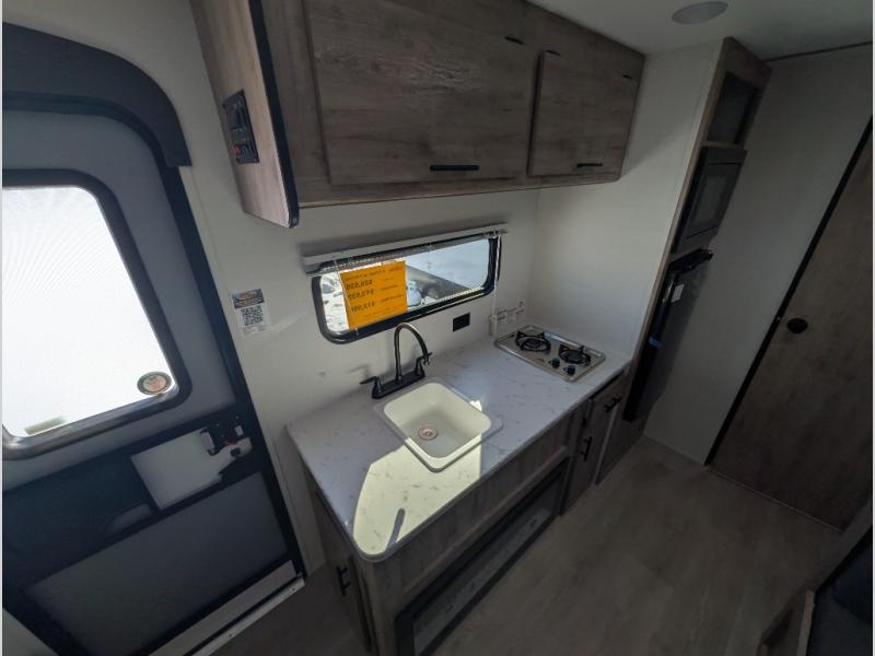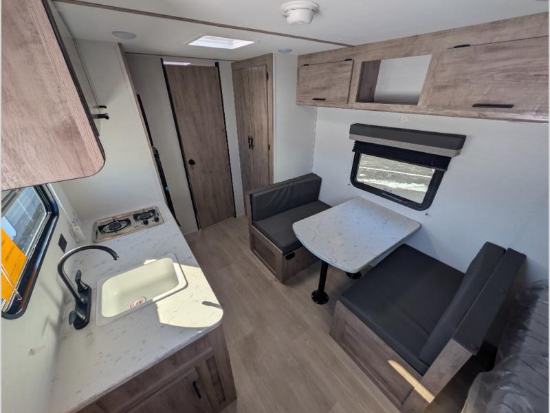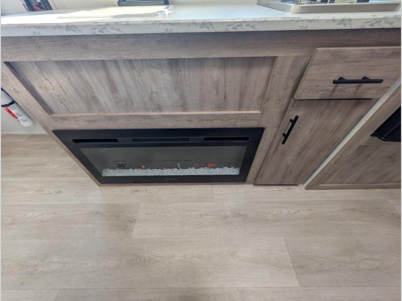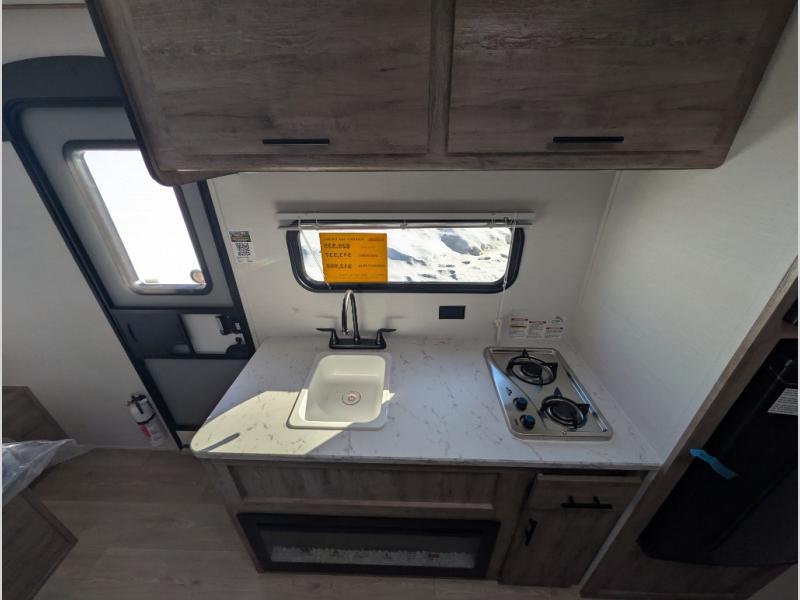 A cozy travel trailer for two or four to enjoy! This unit features a rear bath layout which includes a shower, toilet, and vanity with sink, plus medicine cabinet. No campsite facilities needed! Cook meals and snacks using the two burner cooktop and microwave oven and enjoy eating inside at the booth dinette. When you are not enjoying a meal, the dinette is a great place to play a board game or cards. There is a large closet for clothing storage, and overhead cabinets for your things as well. The front bed is perfect for two, and a nightstand is available for your personal belongings, plus more storage can be found with a large front overhead shelf. This unit even has a fireplace beneath the kitchen sink area!!