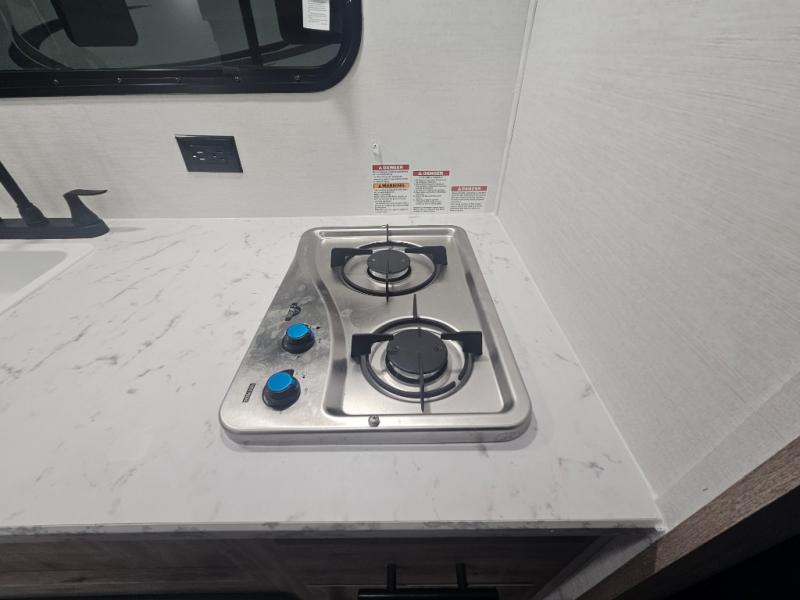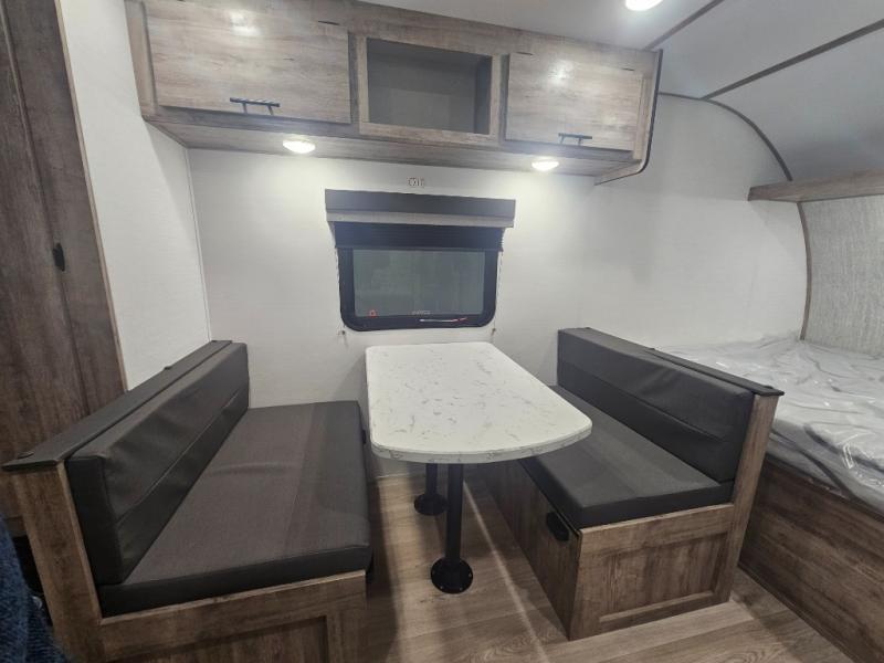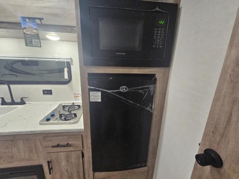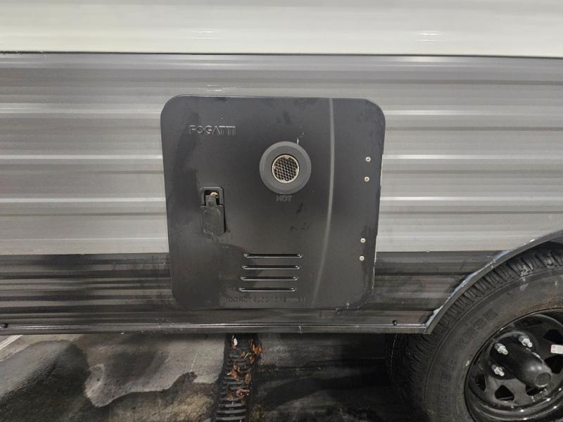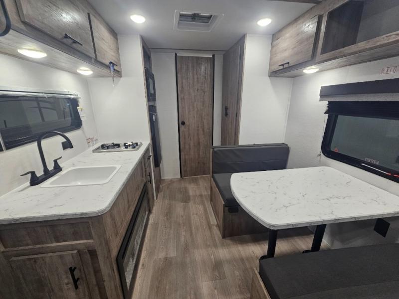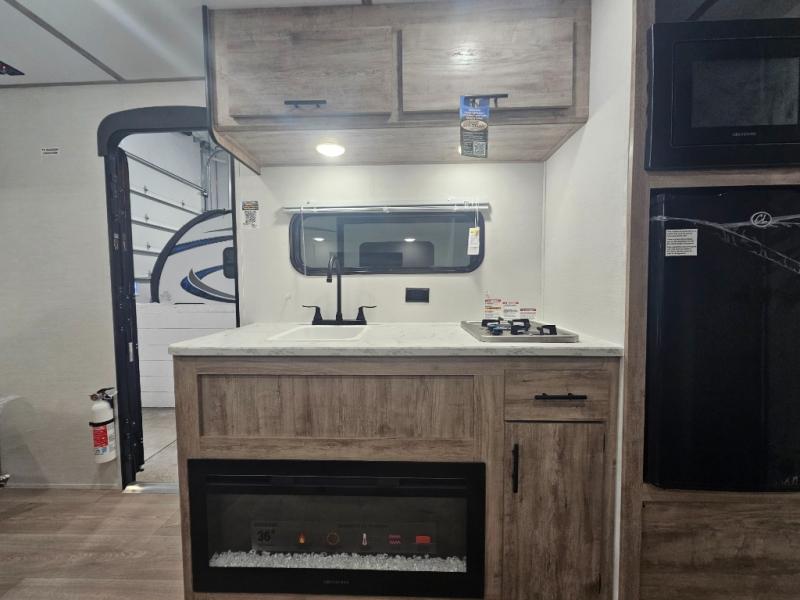 A cozy travel trailer for two or four to enjoy! This unit features a rear bath layout which includes a shower, toilet, and vanity with sink, plus medicine cabinet. No campsite facilities needed! Cook meals and snacks using the two burner cooktop and microwave oven and enjoy eating inside at the booth dinette. When you are not enjoying a meal, the dinette is a great place to play a board game or cards. There is a large closet for clothing storage, and overhead cabinets for your things as well. The front bed is perfect for two, and a nightstand is available for your personal belongings, plus more storage can be found with a large front overhead shelf. This unit even has a fireplace beneath the kitchen sink area!!