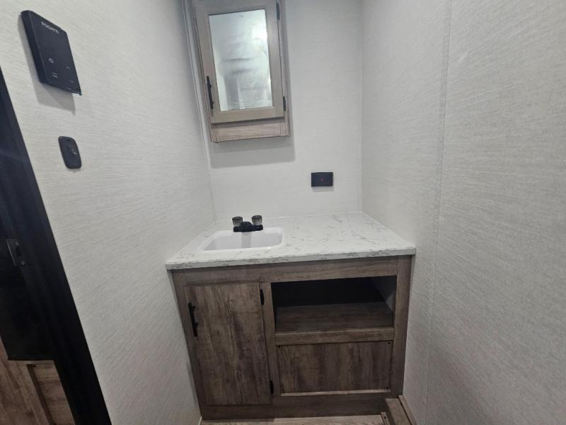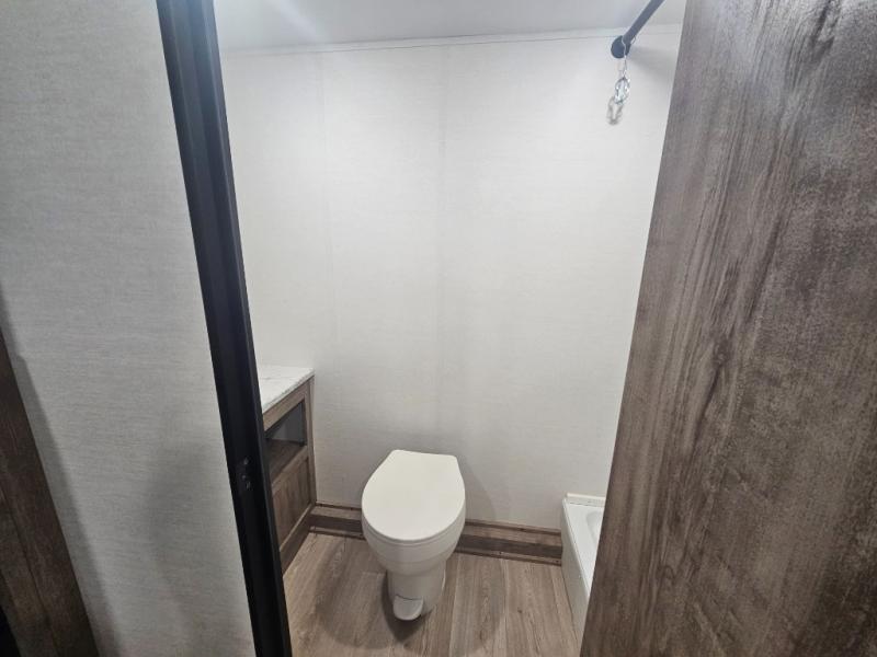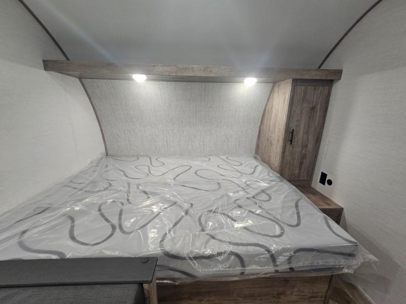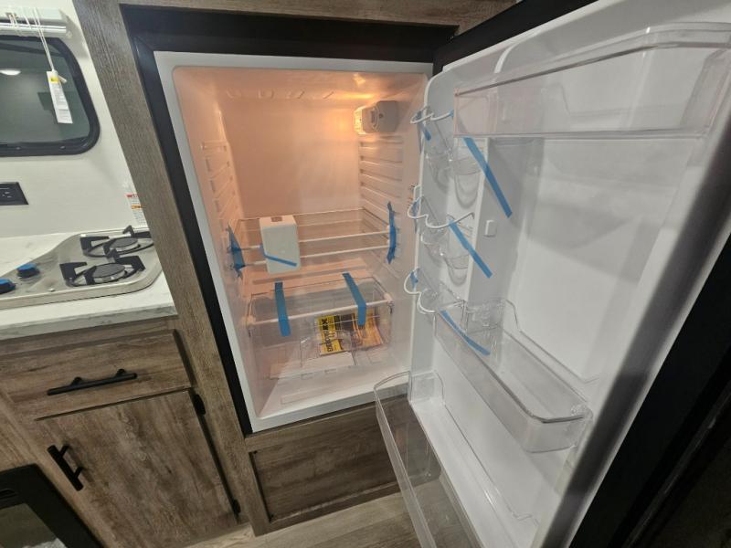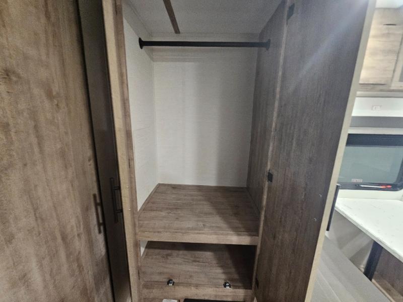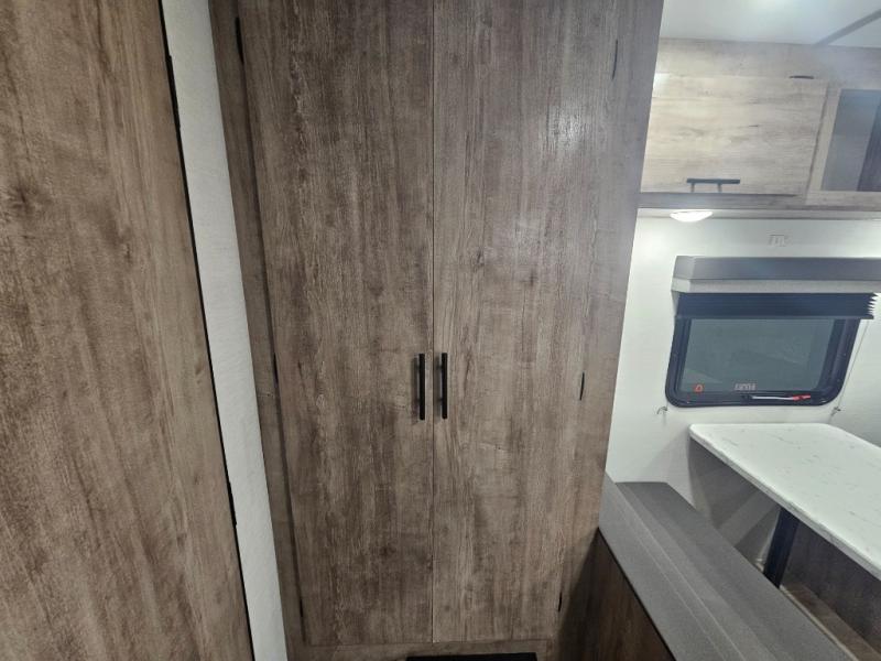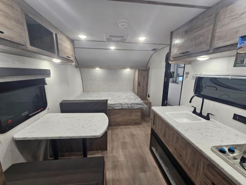 A cozy travel trailer for two or four to enjoy! This unit features a rear bath layout which includes a shower, toilet, and vanity with sink, plus medicine cabinet. No campsite facilities needed! Cook meals and snacks using the two burner cooktop and microwave oven and enjoy eating inside at the booth dinette. When you are not enjoying a meal, the dinette is a great place to play a board game or cards. There is a large closet for clothing storage, and overhead cabinets for your things as well. The front bed is perfect for two, and a nightstand is available for your personal belongings, plus more storage can be found with a large front overhead shelf. This unit even has a fireplace beneath the kitchen sink area!!