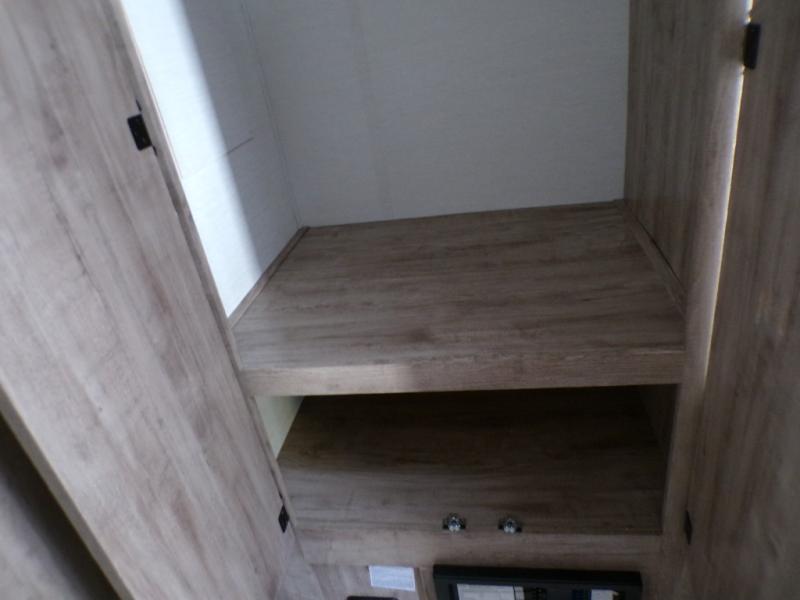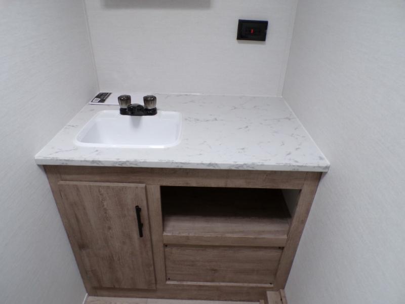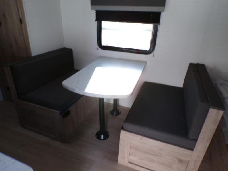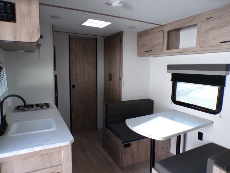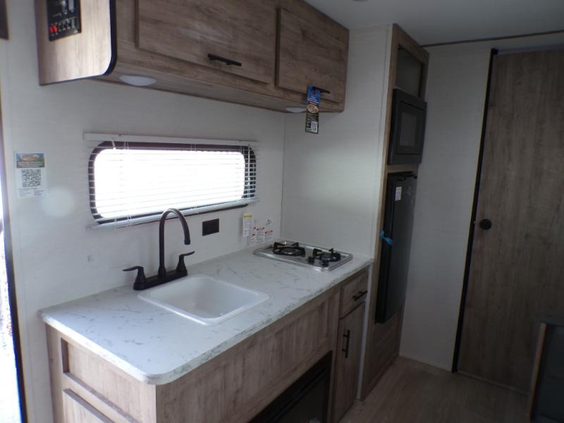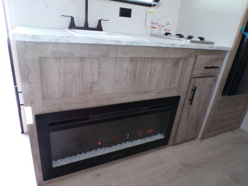 A cozy travel trailer for two or four to enjoy! This unit features a rear bath layout which includes a shower, toilet, and vanity with sink, plus medicine cabinet. No campsite facilities needed! Cook meals and snacks using the two burner cooktop and microwave oven and enjoy eating inside at the booth dinette. When you are not enjoying a meal, the dinette is a great place to play a board game or cards. There is a large closet for clothing storage, and overhead cabinets for your things as well. The front bed is perfect for two, and a nightstand is available for your personal belongings, plus more storage can be found with a large front overhead shelf. This unit even has a fireplace beneath the kitchen sink area!!