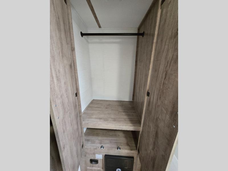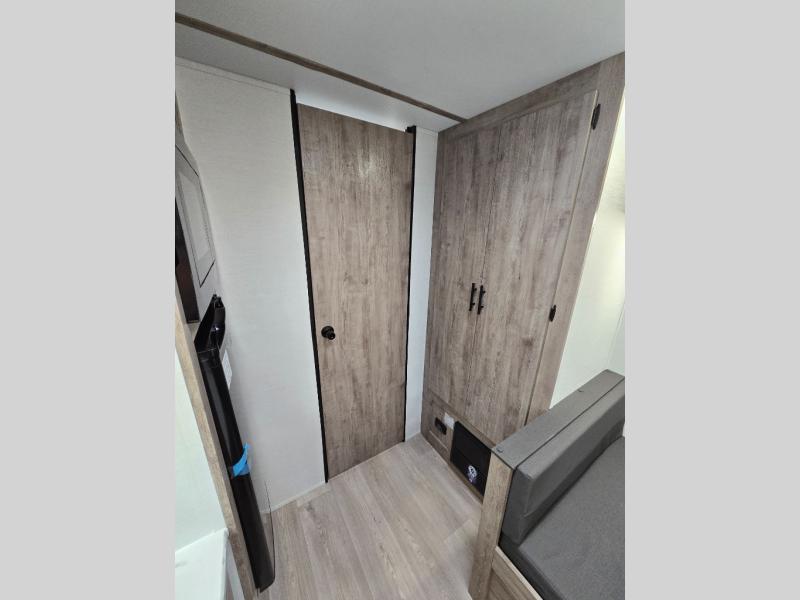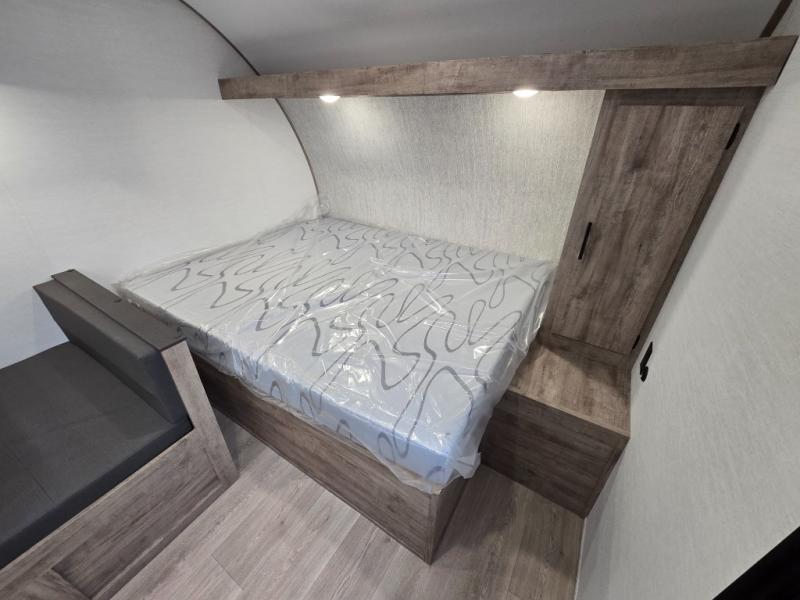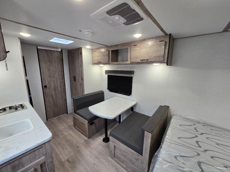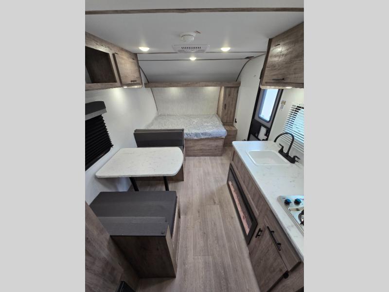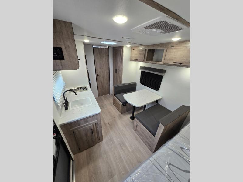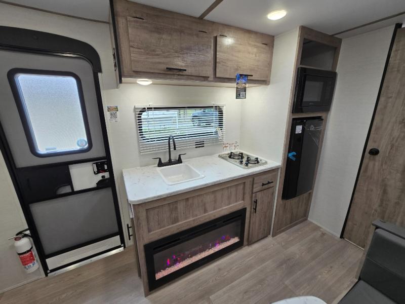 A cozy travel trailer for two or four to enjoy! This unit features a rear bath layout which includes a shower, toilet, and vanity with sink, plus medicine cabinet. No campsite facilities needed! Cook meals and snacks using the two burner cooktop and microwave oven and enjoy eating inside at the booth dinette. When you are not enjoying a meal, the dinette is a great place to play a board game or cards. There is a large closet for clothing storage, and overhead cabinets for your things as well. The front bed is perfect for two, and a nightstand is available for your personal belongings, plus more storage can be found with a large front overhead shelf. This unit even has a fireplace beneath the kitchen sink area!!