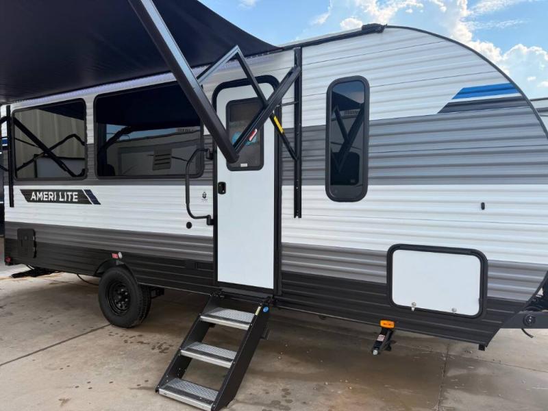 The Ameri-Lite Ultra Lite travel trailers by Gulf Stream are the perfect RV for families wanting to start their camping lifestyle, but not break the bank. These lightweight units are built with a diamond plate lower front, a one-piece synthetic vinyl roof, and a uni-body construction with steel hurricane straps tying the walls to the floor for added durability. The front power hitch jack and four stabilizer jacks will make set-up hassle-free once you arrive at the campground, and you can put out the electric awning to rest in the shade when you're done. Each model includes convenient amenities, like the 13,500 BTU A/C, the tankless water heater, a central control panel, and multiple USB ports for your tablet, phone, and camera! The inside is designed to make you feel at home with radiant LED lighting, designer kitchen backsplash, pleated privacy shades, craft-made cabinetry, plus many more features. Start your RV lifestyle with an affordable, lightweight Ameri-Lite Ultra Lite travel trailer today!
