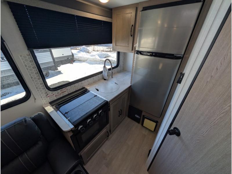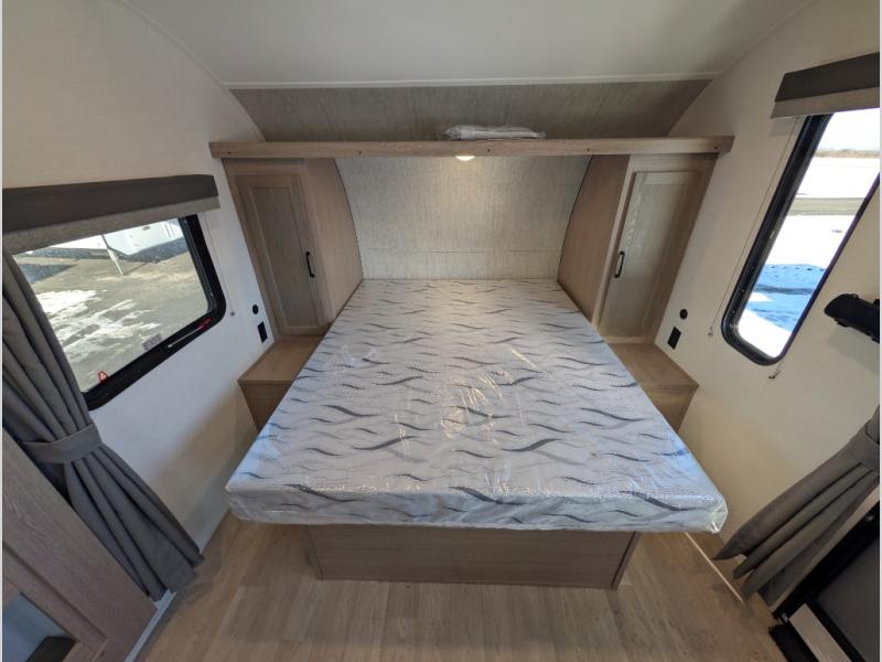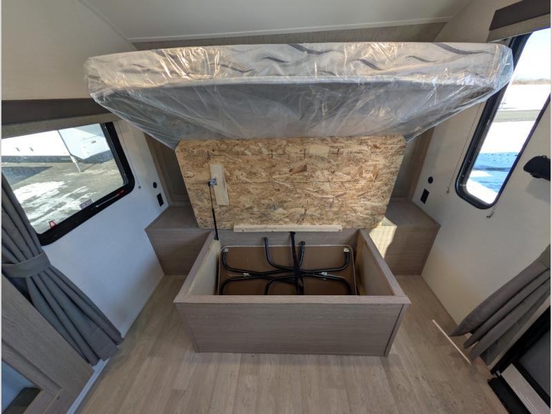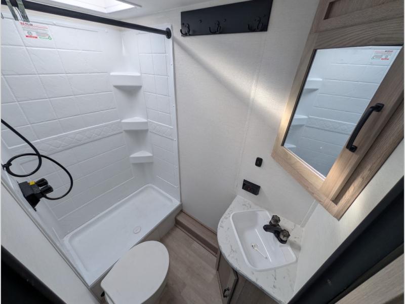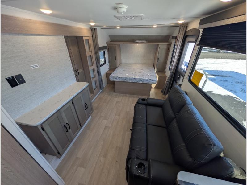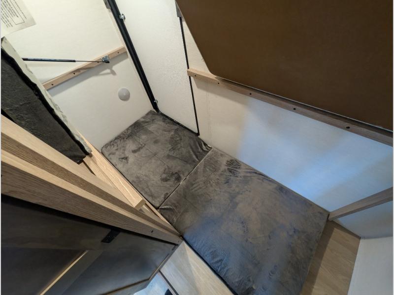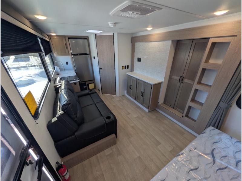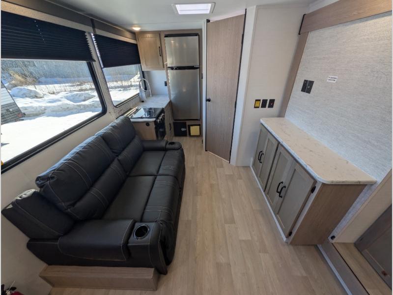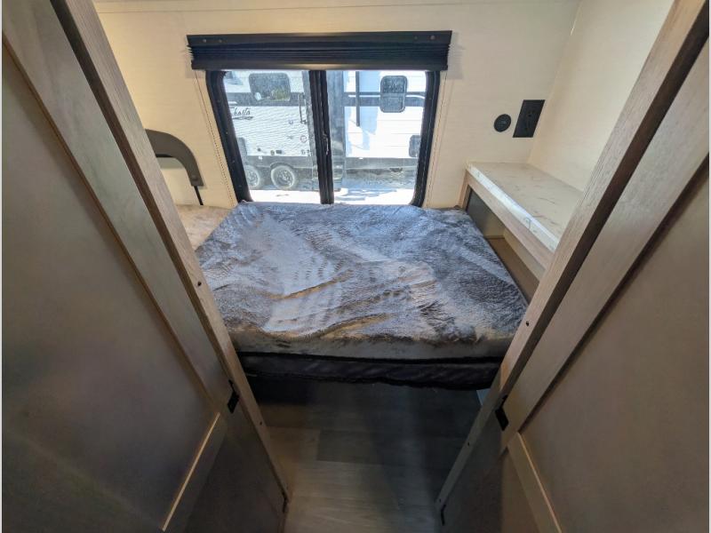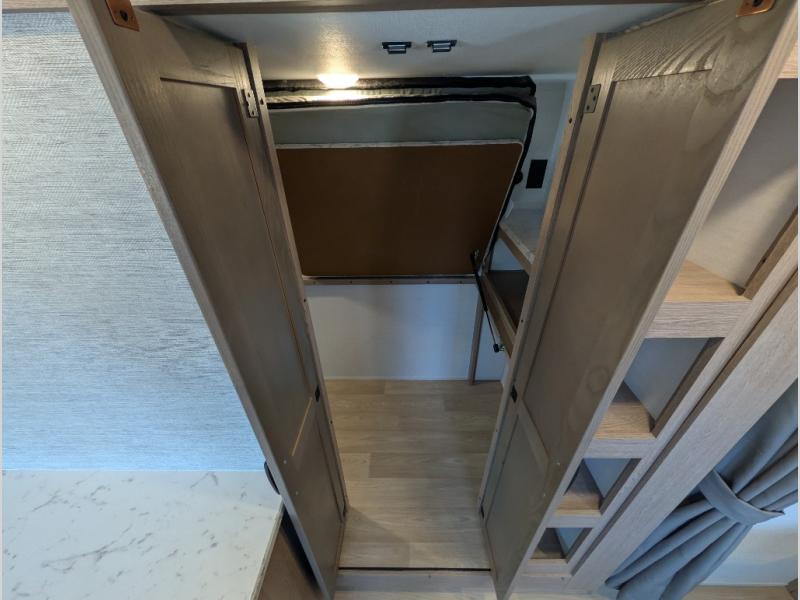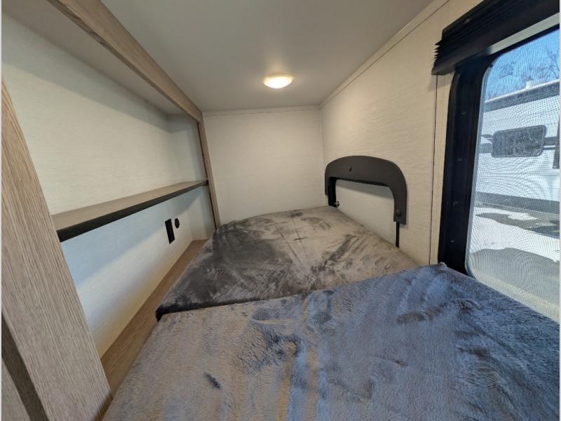 This travel trailer is perfect for a family thanks to its several spaces for rest on the road like the queen bed for you and your partner, the upper and lower bunks for kids, and a folding sofa table for guests, who will also have tons of fun thanks to the entertainment center place In front of the sofa. This unit also has a lot of space to store things and belongings like a shirt closet and wardrobe closet beside the bed, bunk shelves next to the bunk beds, and a sliding overhead cabinet in the kitchen. Also, you will find a refrigerator, sink, and a three-cooktop burner in the kitchen area. Finally, take a relaxing bath in the incredible full bathroom with a skylight