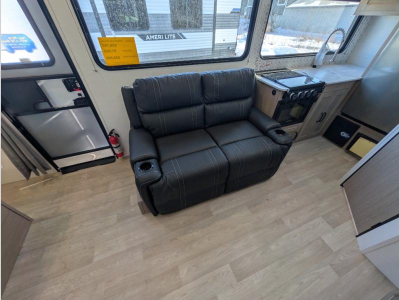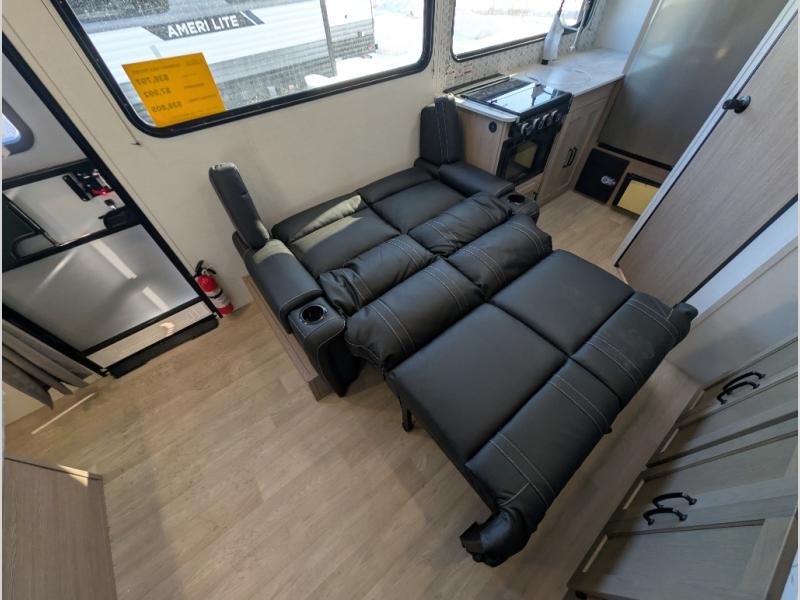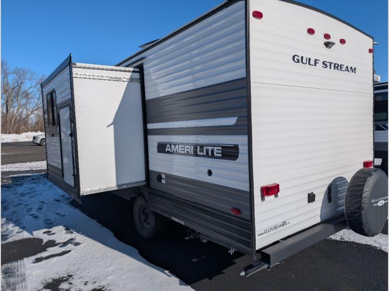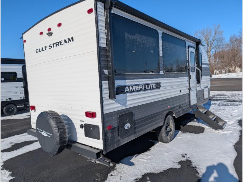 The Ameri-Lite Ultra Lite travel trailers by Gulf Stream are the perfect RV for families wanting to start their camping lifestyle, but not break the bank. These lightweight units are built with a diamond plate lower front, a one-piece synthetic vinyl roof, and a uni-body construction with steel hurricane straps tying the walls to the floor for added durability. The front power hitch jack and four stabilizer jacks will make set-up hassle-free once you arrive at the campground, and you can put out the electric awning to rest in the shade when you're done. Each model includes convenient amenities, like the 13,500 BTU A/C, the tankless water heater, a central control panel, and multiple USB ports for your tablet, phone, and camera! The inside is designed to make you feel at home with radiant LED lighting, designer kitchen backsplash, pleated privacy shades, craft-made cabinetry, plus many more features. Start your RV lifestyle with an affordable, lightweight Ameri-Lite Ultra Lite travel trailer today!
