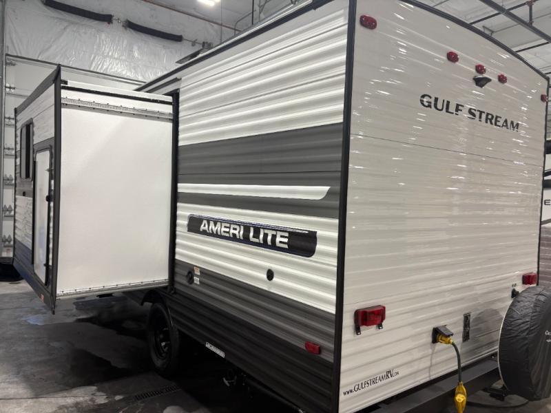 The Ameri-Lite Ultra Lite travel trailers by Gulf Stream are the perfect RV for families wanting to start their camping lifestyle, but not break the bank. These lightweight units are built with a diamond plate lower front, a one-piece synthetic vinyl roof, and a uni-body construction with steel hurricane straps tying the walls to the floor for added durability. The front power hitch jack and four stabilizer jacks will make set-up hassle-free once you arrive at the campground, and you can put out the electric awning to rest in the shade when you're done. Each model includes convenient amenities, like the 13,500 BTU A/C, the tankless water heater, a central control panel, and multiple USB ports for your tablet, phone, and camera! The inside is designed to make you feel at home with radiant LED lighting, designer kitchen backsplash, pleated privacy shades, craft-made cabinetry, plus many more features. Start your RV lifestyle with an affordable, lightweight Ameri-Lite Ultra Lite travel trailer today!