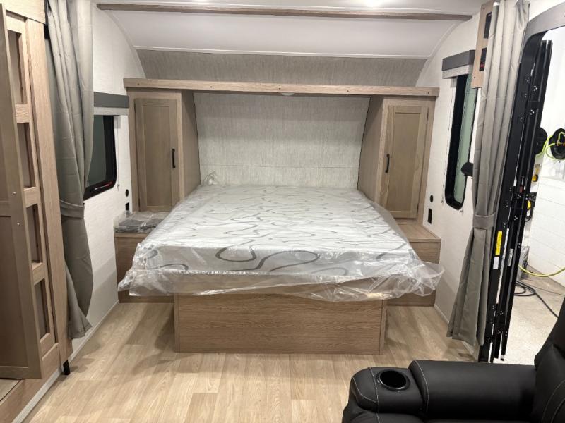 This travel trailer is perfect for a family thanks to its several spaces for rest on the road like the queen bed for you and your partner, the upper and lower bunks for kids, and a folding sofa table for guests, who will also have tons of fun thanks to the entertainment center place In front of the sofa. This unit also has a lot of space to store things and belongings like a shirt closet and wardrobe closet beside the bed, bunk shelves next to the bunk beds, and a sliding overhead cabinet in the kitchen. Also, you will find a refrigerator, sink, and a three-cooktop burner in the kitchen area. Finally, take a relaxing bath in the incredible full bathroom with a skylight