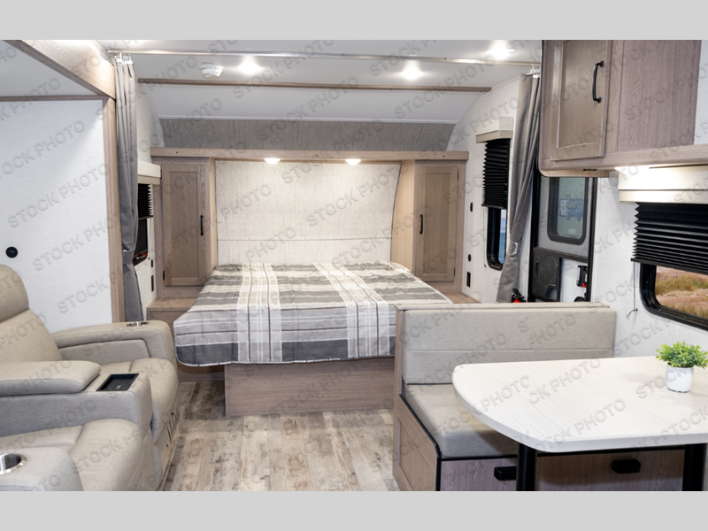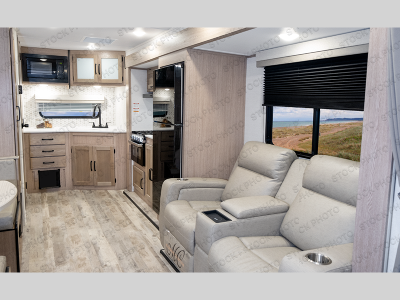 This travel trailer is perfect for you and your partner, thanks to the queen bed, which is ideal for sleeping and resting peacefully, beside it you will find a shirt closet and wardrobe to store your belongings. You can rest a bit on the theater seating or also have a chit-chat with your partner. Conveniently cook delicious food thanks to the kitchen which includes a refrigerator, three cooktop burners, microwave, and sink. After the food is done, you can comfortably have lunch at the 38' dinette while watching the TV. This unit is also fitted with a lot of space to store different things like pass-thru storage, overhead cabinets, pantry, and linen. Finally, take a relaxing bath in the incredible full bathroom with a skylight above the shower.