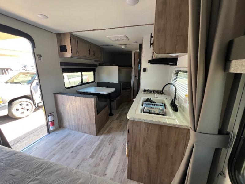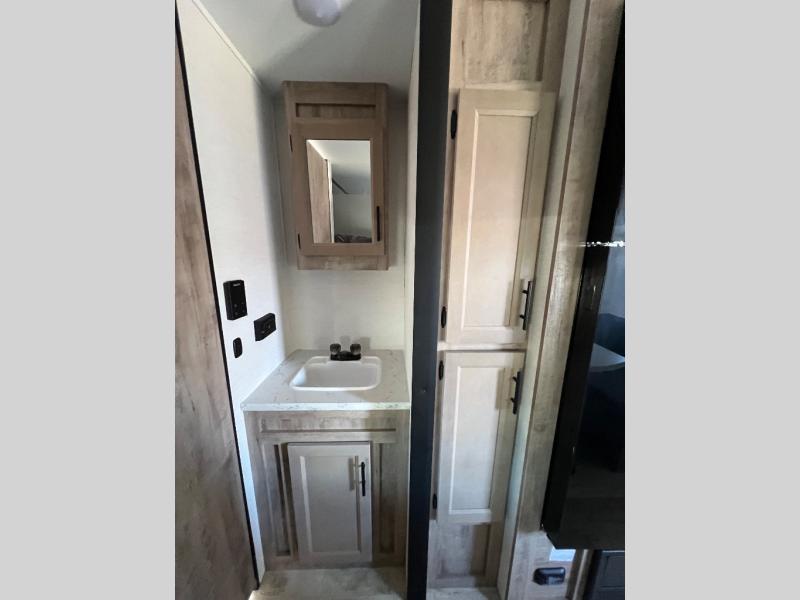 Invite more along with double-size bunks in this 'Show Stopper' travel trailer! The private shower and toilet is close to the bunks if you're camping with little ones, and there is a sink just outside the door so two people can freshen up at once. You and your spouse will get comfortable on the front queen bed, or you can choose the optional Murphy bed to enjoy more seating space during the day. This model includes a booth dinette to dine at or play a board game on rainy days!