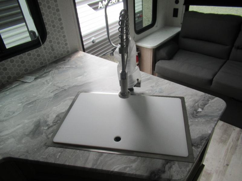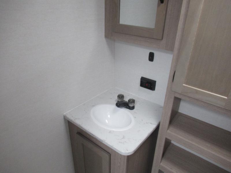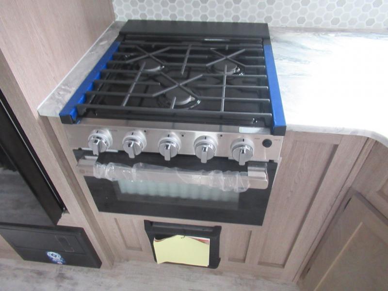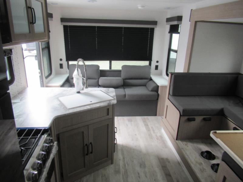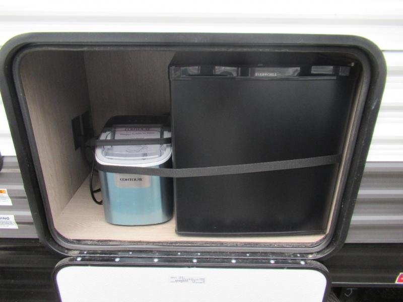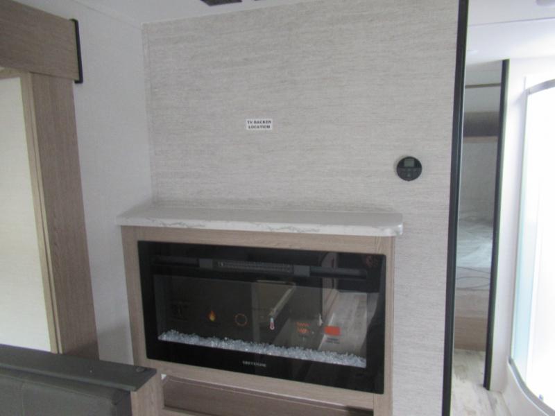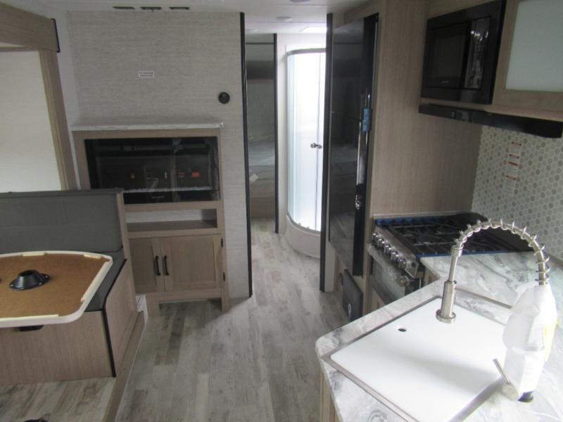 Make this comfortable travel trailer your home-away-from-home on the weekends. You will love having your own master bedroom up front with a queen bed and dual wardrobes for your clothes. The walk-through bath is spacious, allowing you to easily clean up each day. Your guests can sleep on the jackknife sofa or U-shaped dinette, and the fireplace here will make it feel more like home. This model includes all the appliances needed each day to prepare home-cooked meals, including a three burner cooktop, a microwave oven, and a 10.7 cu. ft. Everchill refrigerator/freezer. There is even an outdoor beverage center with a refrigerator and an icemaker to entertain guests!
