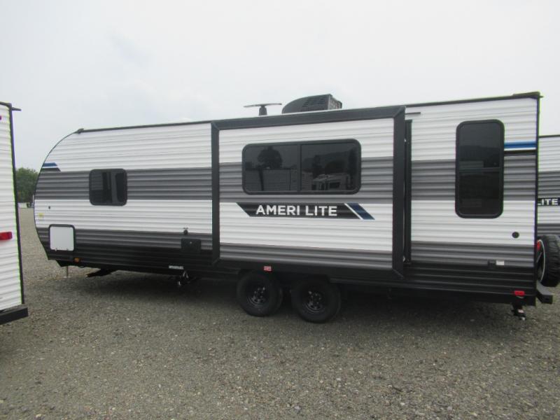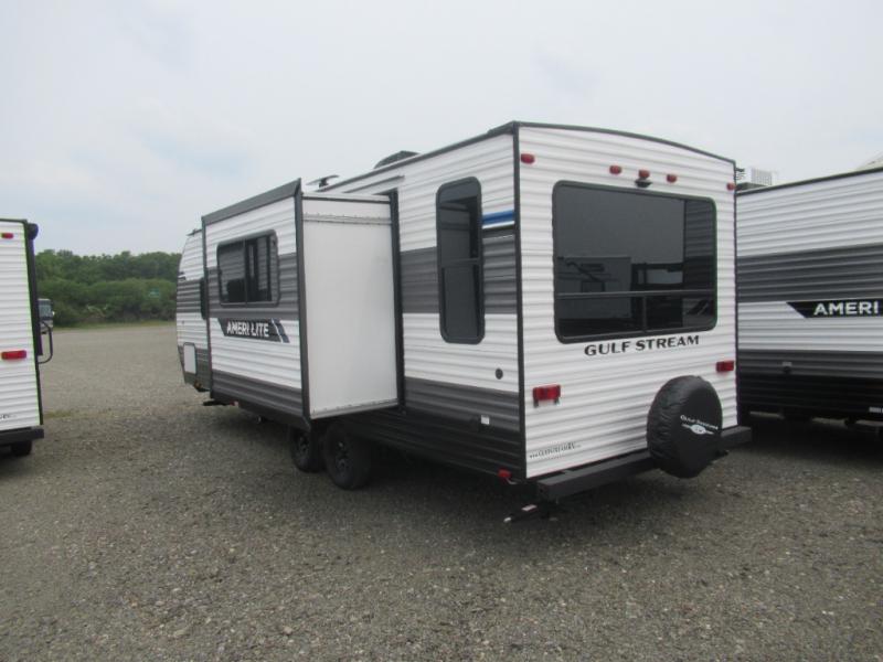 The Ameri-Lite Ultra Lite travel trailers by Gulf Stream are the perfect RV for families wanting to start their camping lifestyle, but not break the bank. These lightweight units are built with a diamond plate lower front, a one-piece synthetic vinyl roof, and a uni-body construction with steel hurricane straps tying the walls to the floor for added durability. The front power hitch jack and four stabilizer jacks will make set-up hassle-free once you arrive at the campground, and you can put out the electric awning to rest in the shade when you're done. Each model includes convenient amenities, like the 13,500 BTU A/C, the tankless water heater, a central control panel, and multiple USB ports for your tablet, phone, and camera! The inside is designed to make you feel at home with radiant LED lighting, designer kitchen backsplash, pleated privacy shades, craft-made cabinetry, plus many more features. Start your RV lifestyle with an affordable, lightweight Ameri-Lite Ultra Lite travel trailer today!