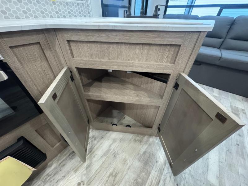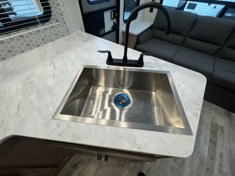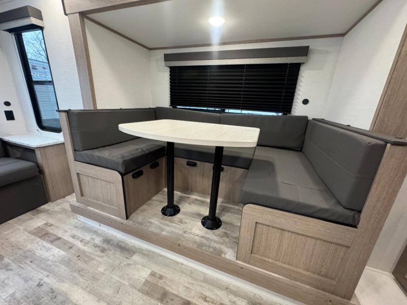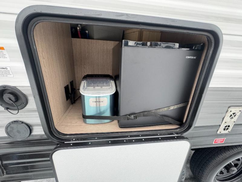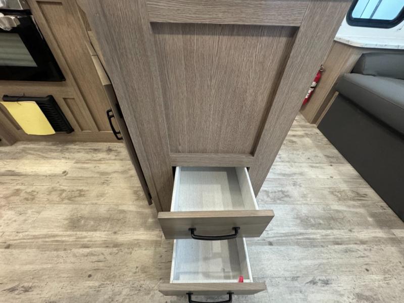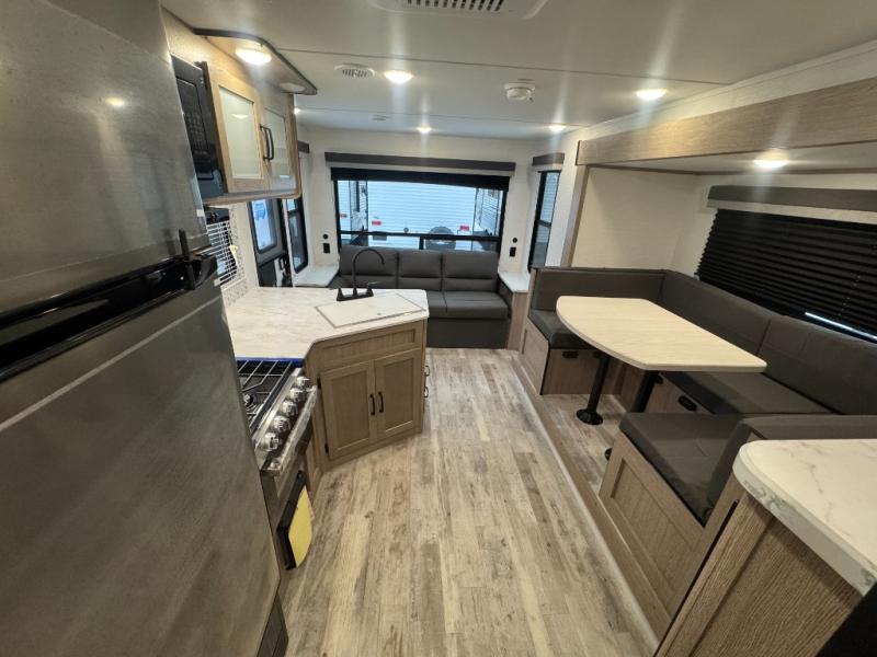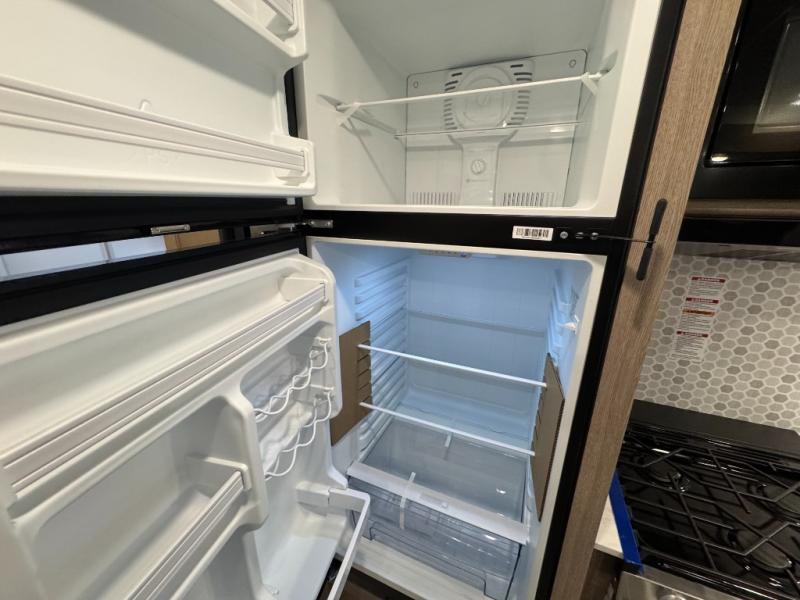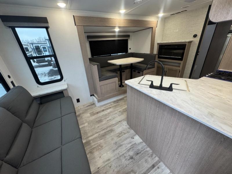 Make this comfortable travel trailer your home-away-from-home on the weekends. You will love having your own master bedroom up front with a queen bed and dual wardrobes for your clothes. The walk-through bath is spacious, allowing you to easily clean up each day. Your guests can sleep on the jackknife sofa or U-shaped dinette, and the fireplace here will make it feel more like home. This model includes all the appliances needed each day to prepare home-cooked meals, including a three burner cooktop, a microwave oven, and a 10.7 cu. ft. Everchill refrigerator/freezer. There is even an outdoor beverage center with a refrigerator and an icemaker to entertain guests!