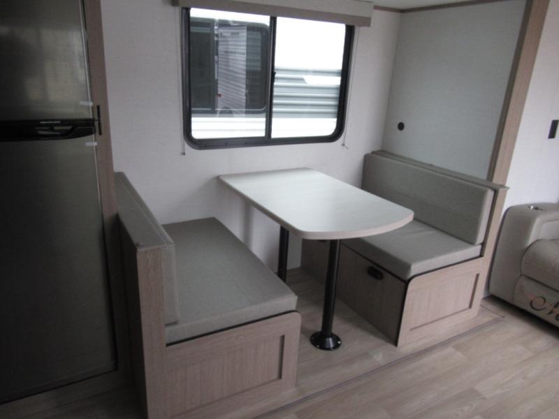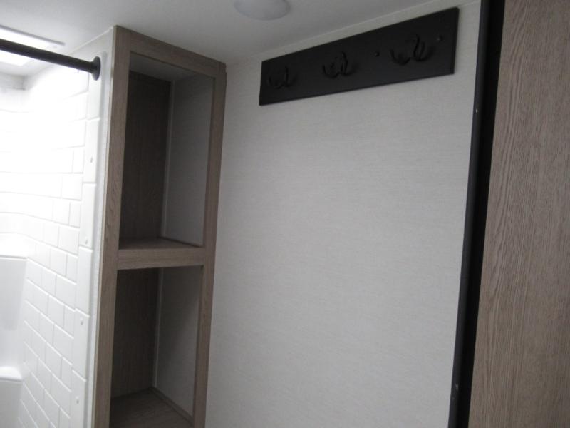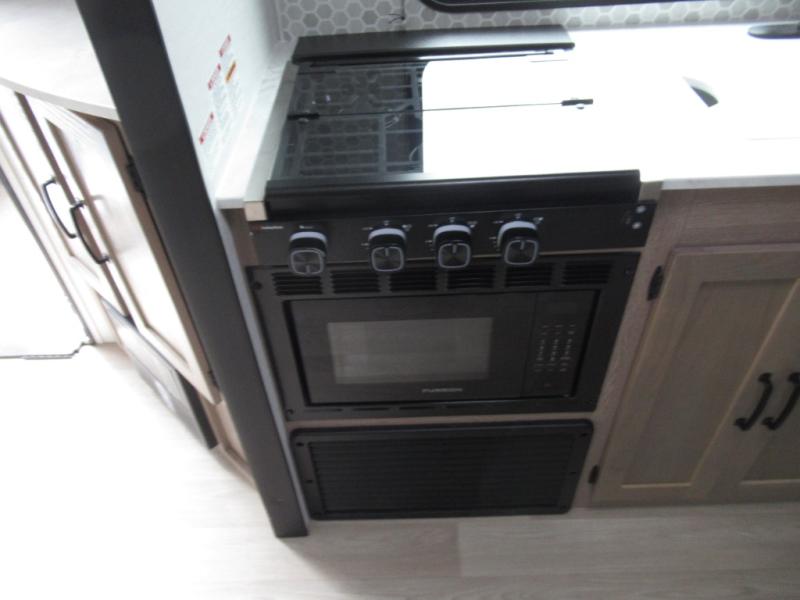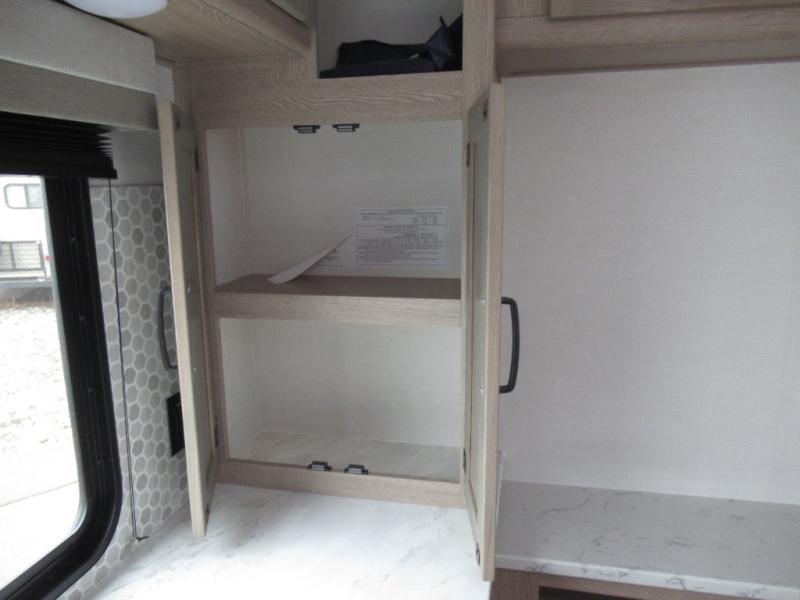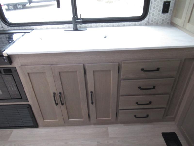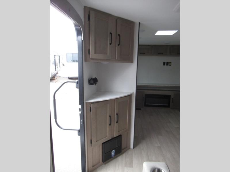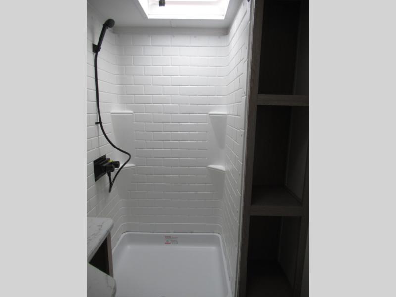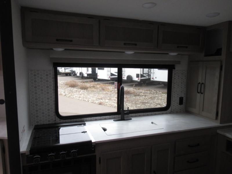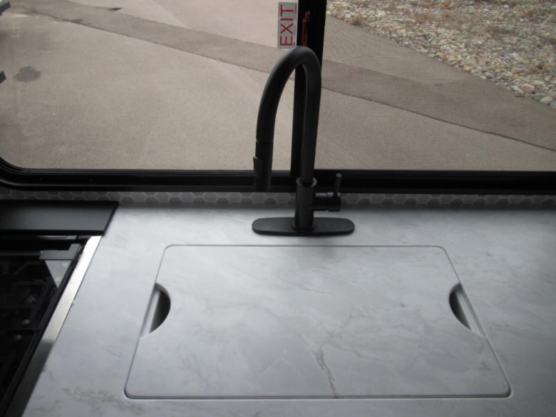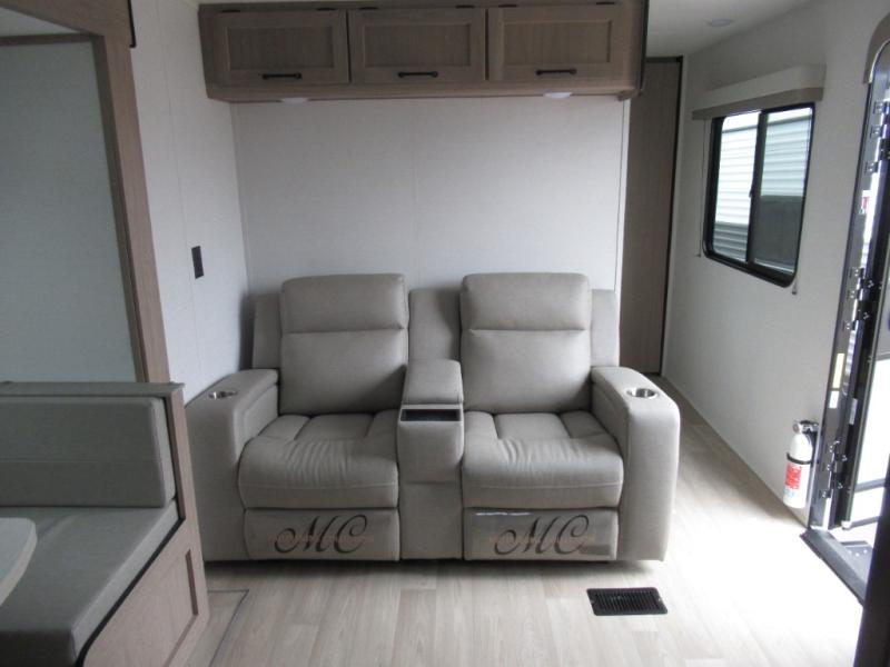 Designed with luxury and convenience in mind, this stunning RV offers the perfect blend of relaxation and excitement. The living room/kitchen area is the heart of the home, featuring a refrigerator, dinette, three-burner stove ideal for cooking your favorite meals, overhead cabinets, pantry, theater seating, and entertainment center. Perfect for having fun with friends and family, or simply relaxing and enjoying the comforts of home. The front bedroom boasts a queen bed, wardrobe, and shirt closet for all your favorite clothes and belongings. The full bathroom is a tranquil oasis, complete with a shower with skylight for added natural light. The perfect place to freshen up and feel at home.