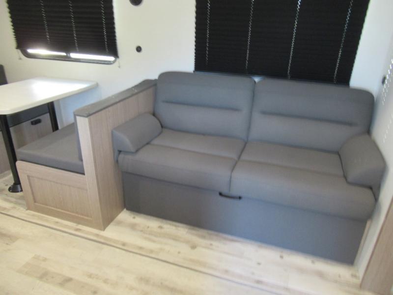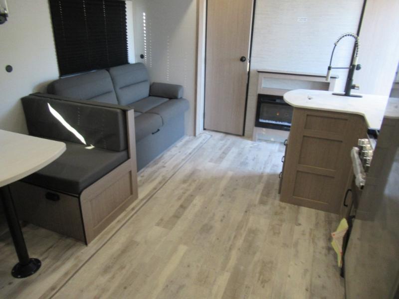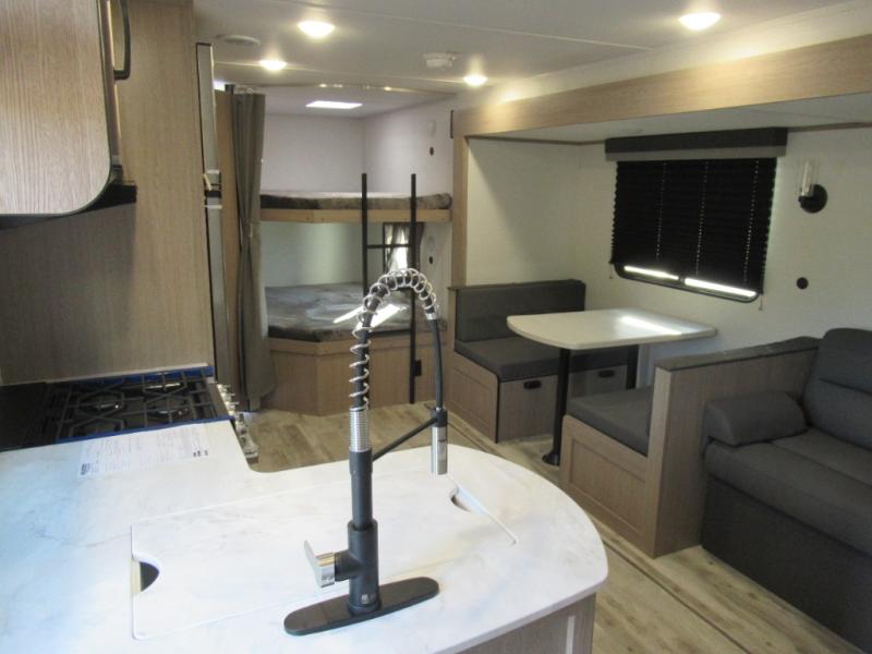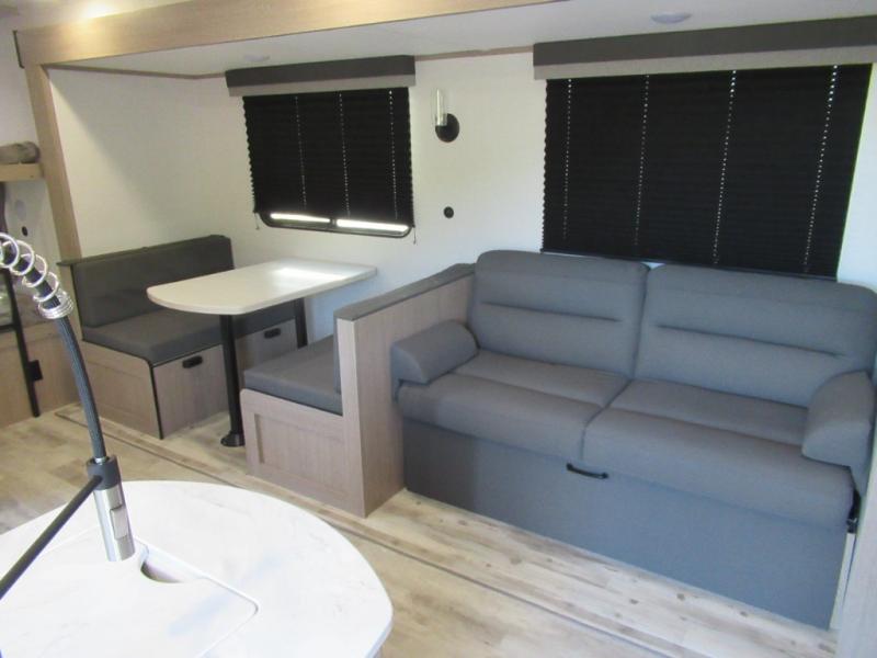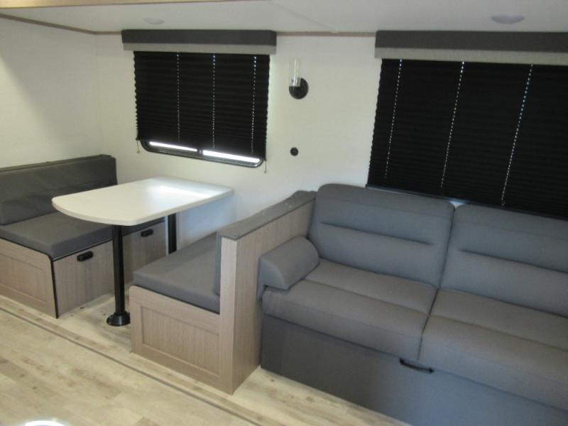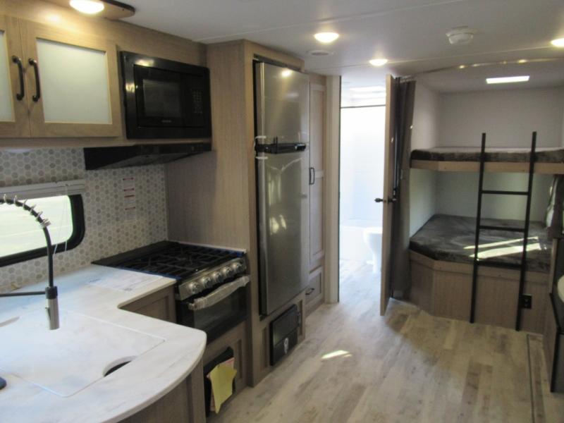A trip to the lake or your favorite state park just got better in this comfortable travel trailer. Whether you're relaxing on the sofa or booth dinette, cooking in the spacious kitchen, or sitting outside under the electric awning with LED lights, you will enjoy every minute you camp. You and your spouse will have a private bedroom up front with a queen bed and dual wardrobes, and there are double-size bunks for the kids or your friends!