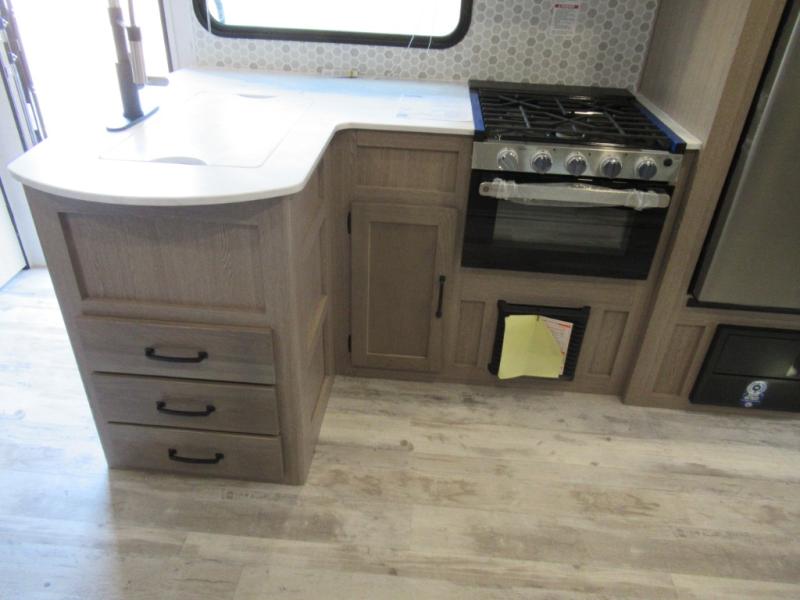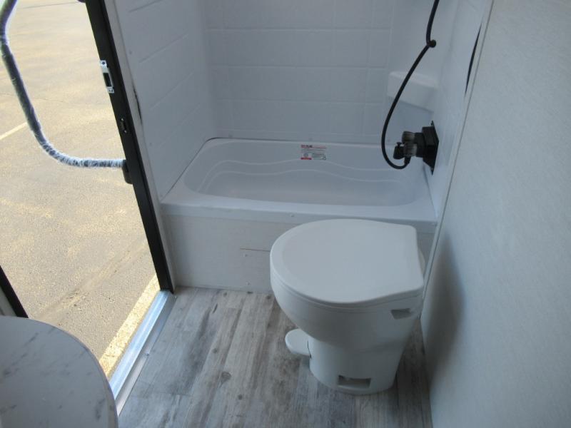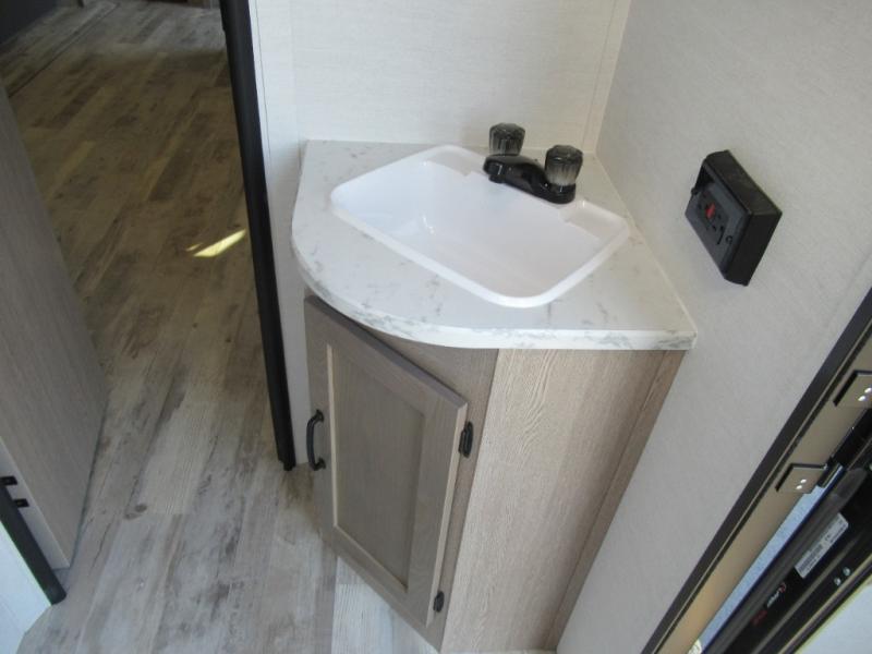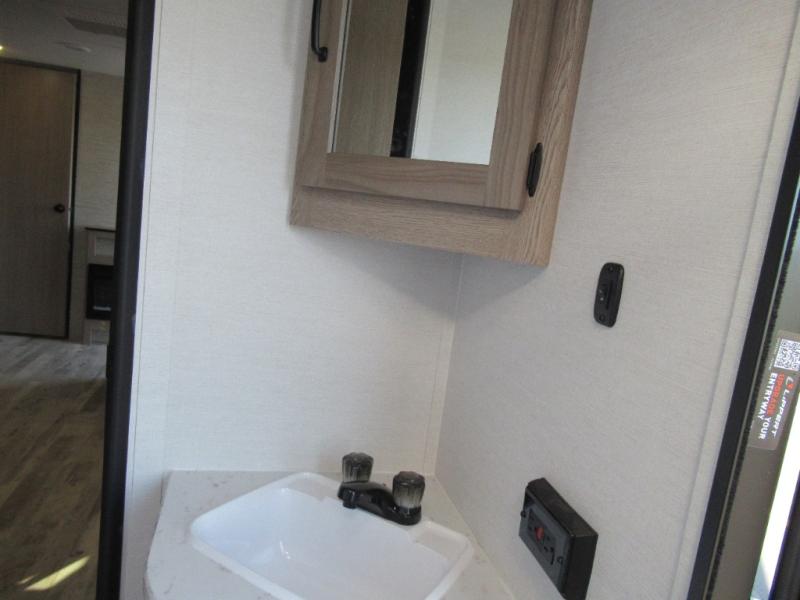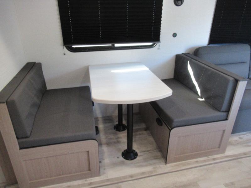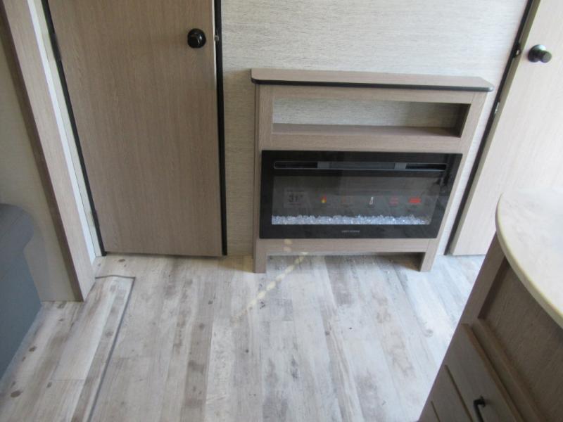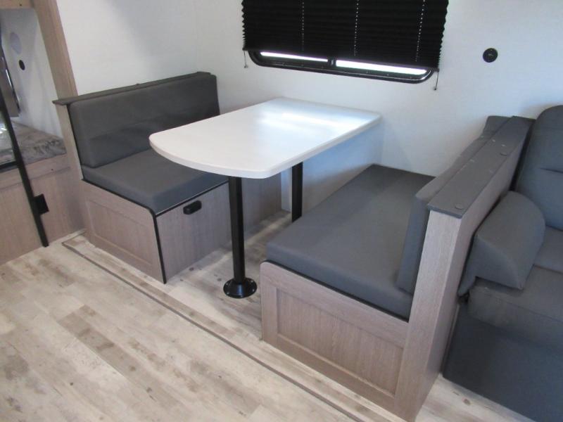 A trip to the lake or your favorite state park just got better in this comfortable travel trailer. Whether you're relaxing on the sofa or booth dinette, cooking in the spacious kitchen, or sitting outside under the electric awning with LED lights, you will enjoy every minute you camp. You and your spouse will have a private bedroom up front with a queen bed and dual wardrobes, and there are double-size bunks for the kids or your friends!