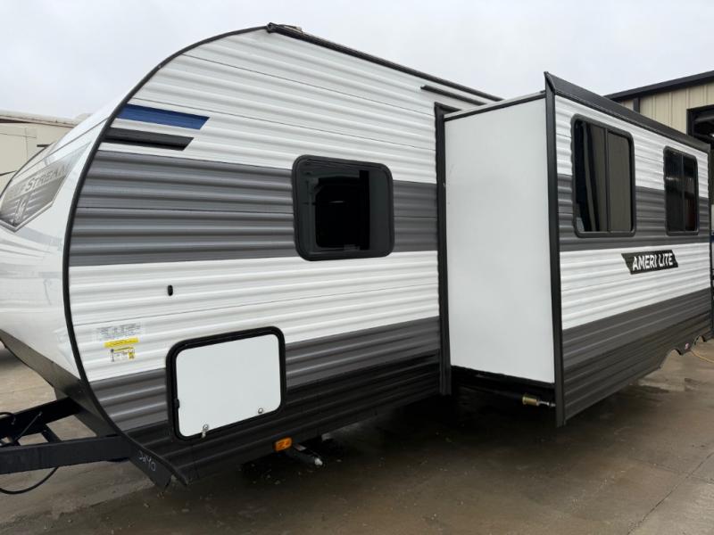 The Ameri-Lite Ultra Lite travel trailers by Gulf Stream are the perfect RV for families wanting to start their camping lifestyle, but not break the bank. These lightweight units are built with a diamond plate lower front, a one-piece synthetic vinyl roof, and a uni-body construction with steel hurricane straps tying the walls to the floor for added durability. The front power hitch jack and four stabilizer jacks will make set-up hassle-free once you arrive at the campground, and you can put out the electric awning to rest in the shade when you're done. Each model includes convenient amenities, like the 13,500 BTU A/C, the tankless water heater, a central control panel, and multiple USB ports for your tablet, phone, and camera! The inside is designed to make you feel at home with radiant LED lighting, designer kitchen backsplash, pleated privacy shades, craft-made cabinetry, plus many more features. Start your RV lifestyle with an affordable, lightweight Ameri-Lite Ultra Lite travel trailer today!