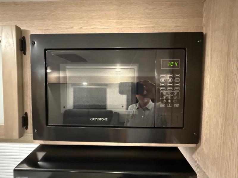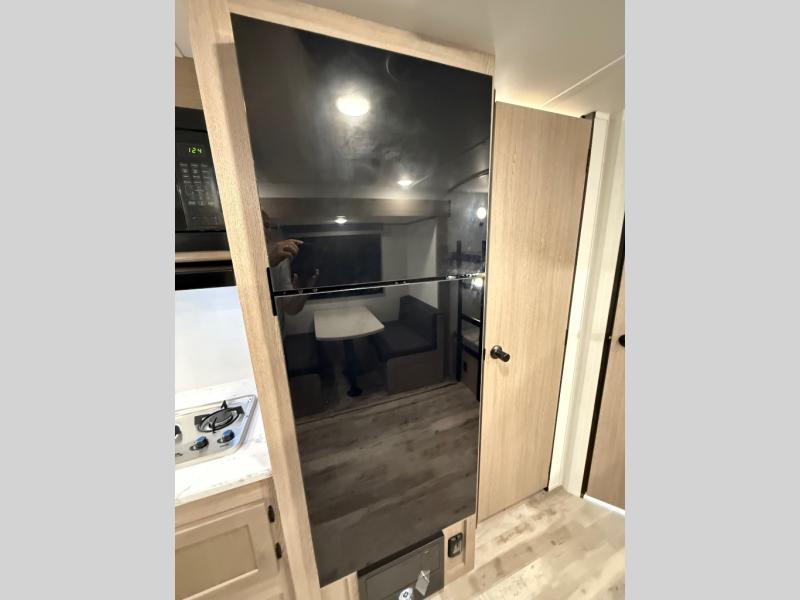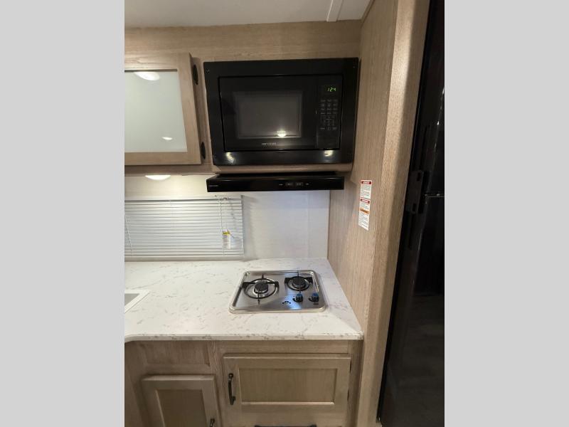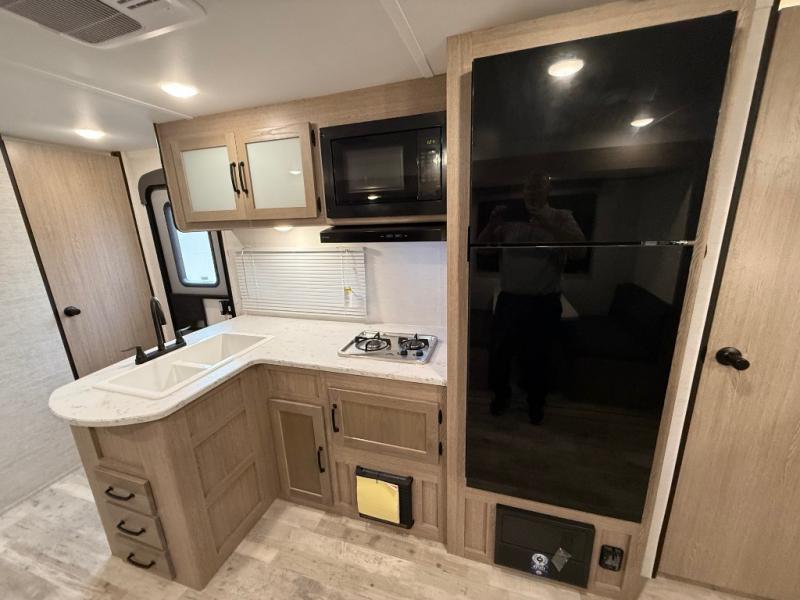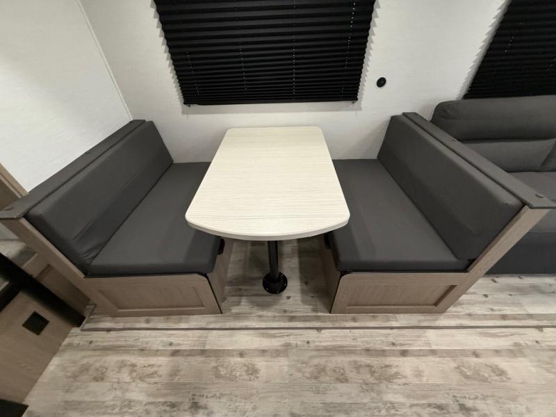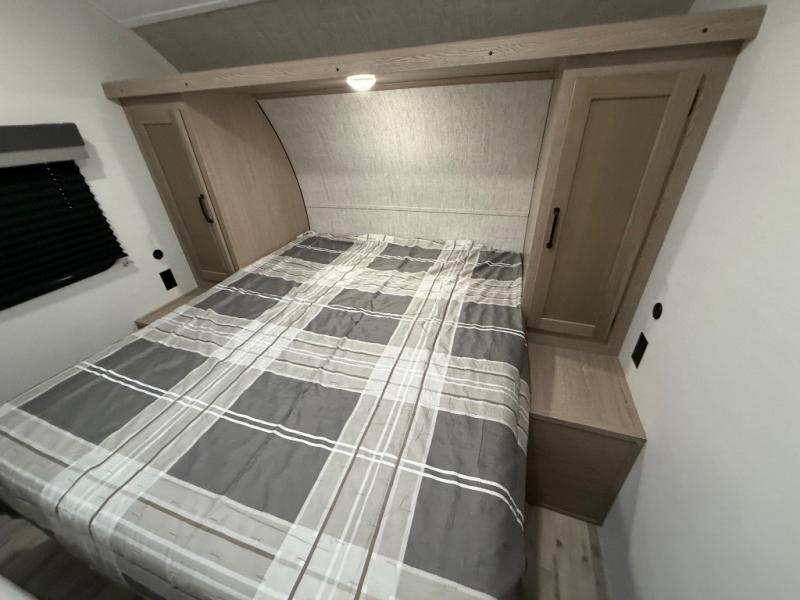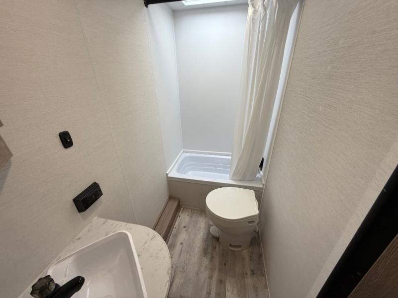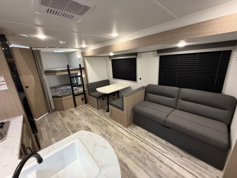 Invite more along with double-size bunks in this 'Show Stopper' travel trailer! The private shower and toilet is close to the bunks if you're camping with little ones making it quite convenient, especially at night. You will be comfortable on the front RV queen bed with dual bedside nightstands and shirt closets. The kitchen features everything you need to create meals and snacks for your entire family, and the outside pass-through storage allows you to easily tuck away your gear like fishing poles, camp chairs and games, plus more!